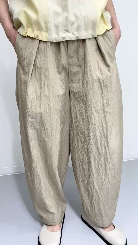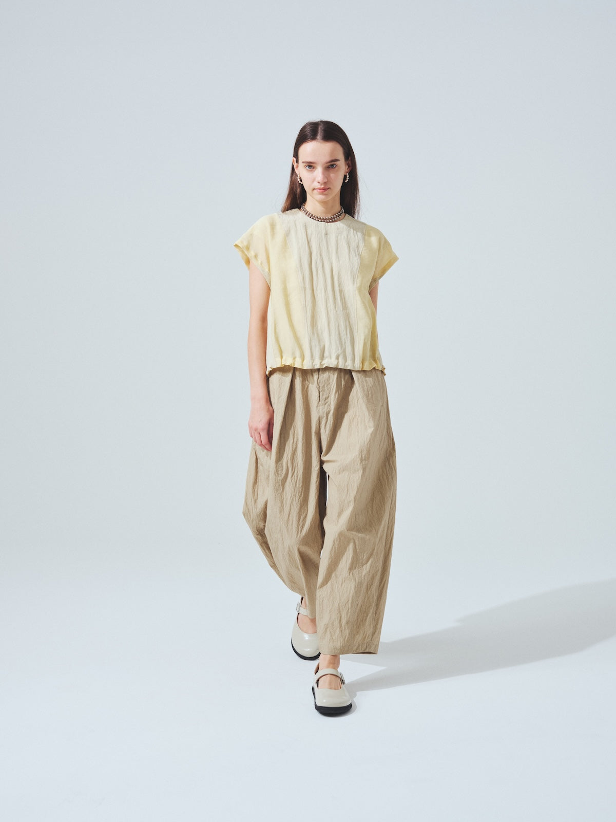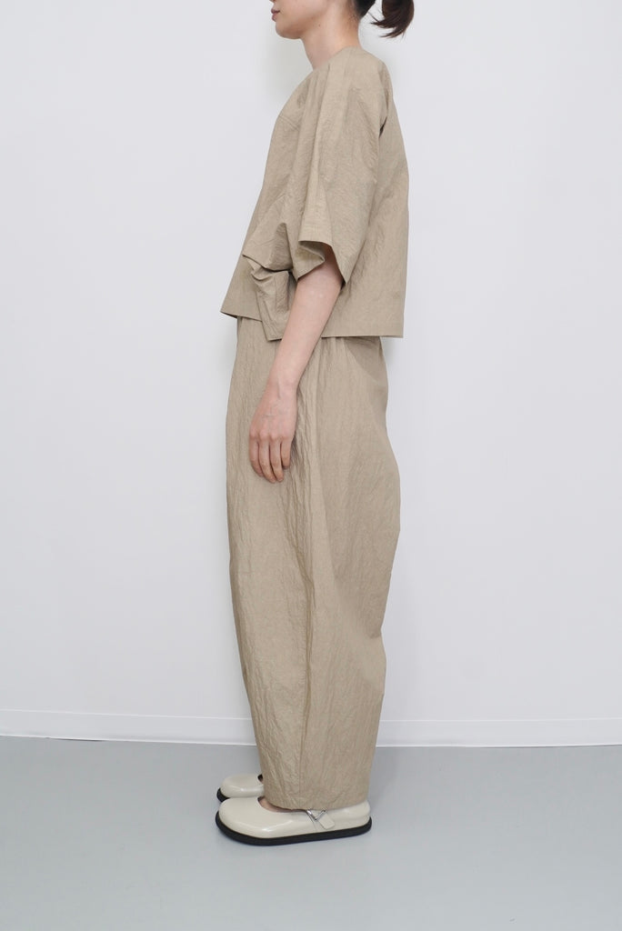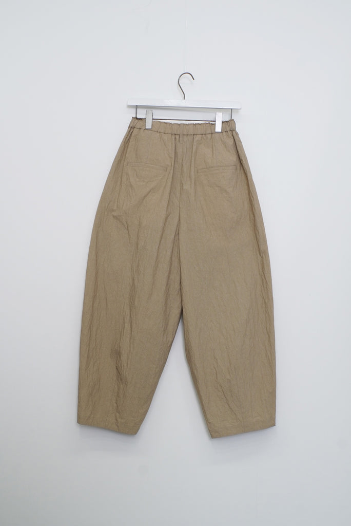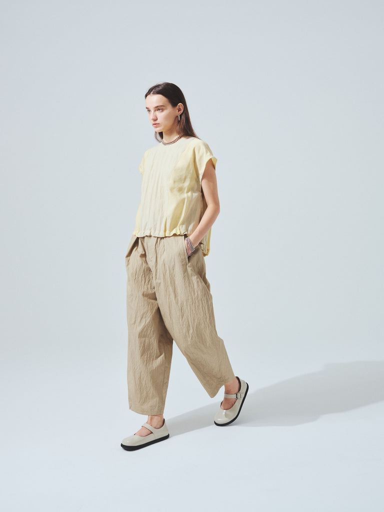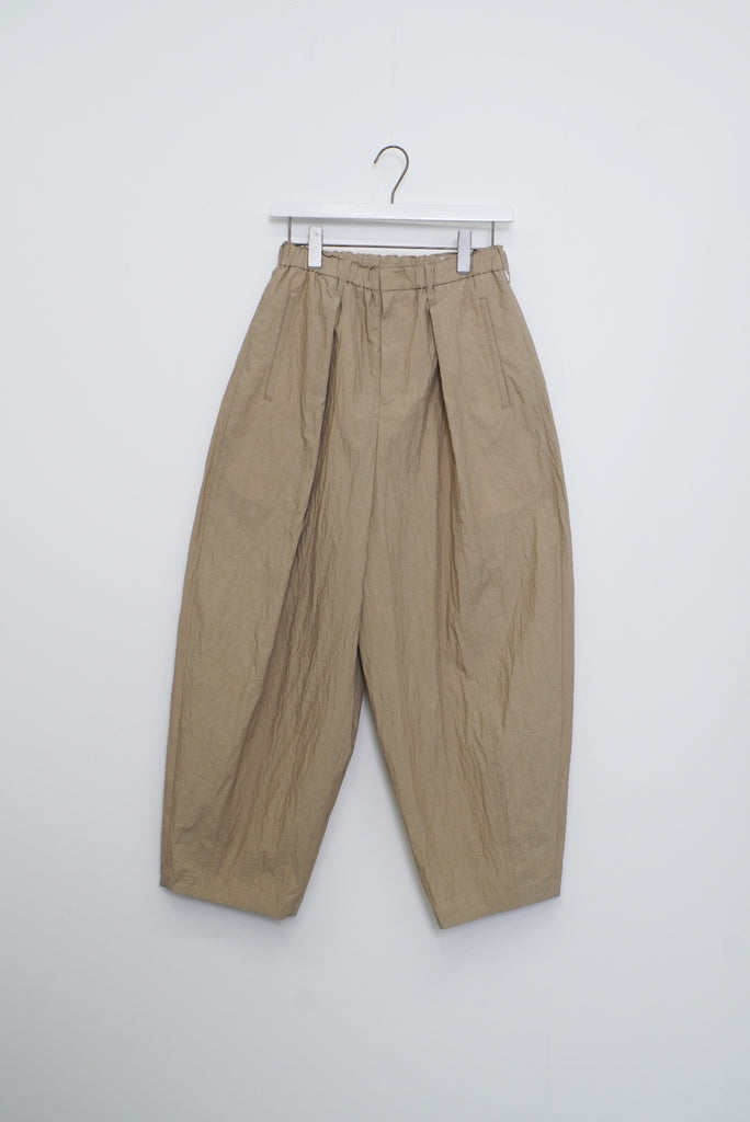 コクーンシルエットの特徴は、ウエストに施された大きなタックとワイドなシルエットを、裾のデザインダーツや切替線で調整し、独特な丸みのあるシルエットを作り出しています。前開き部分にはデザイン性の高いメタルフックを使用し、ウエストにはゴムとサイズ調整用のドローコードが付いているため、快適な着心地を実現しています。脇と後に機能的なポケットが付いてます。