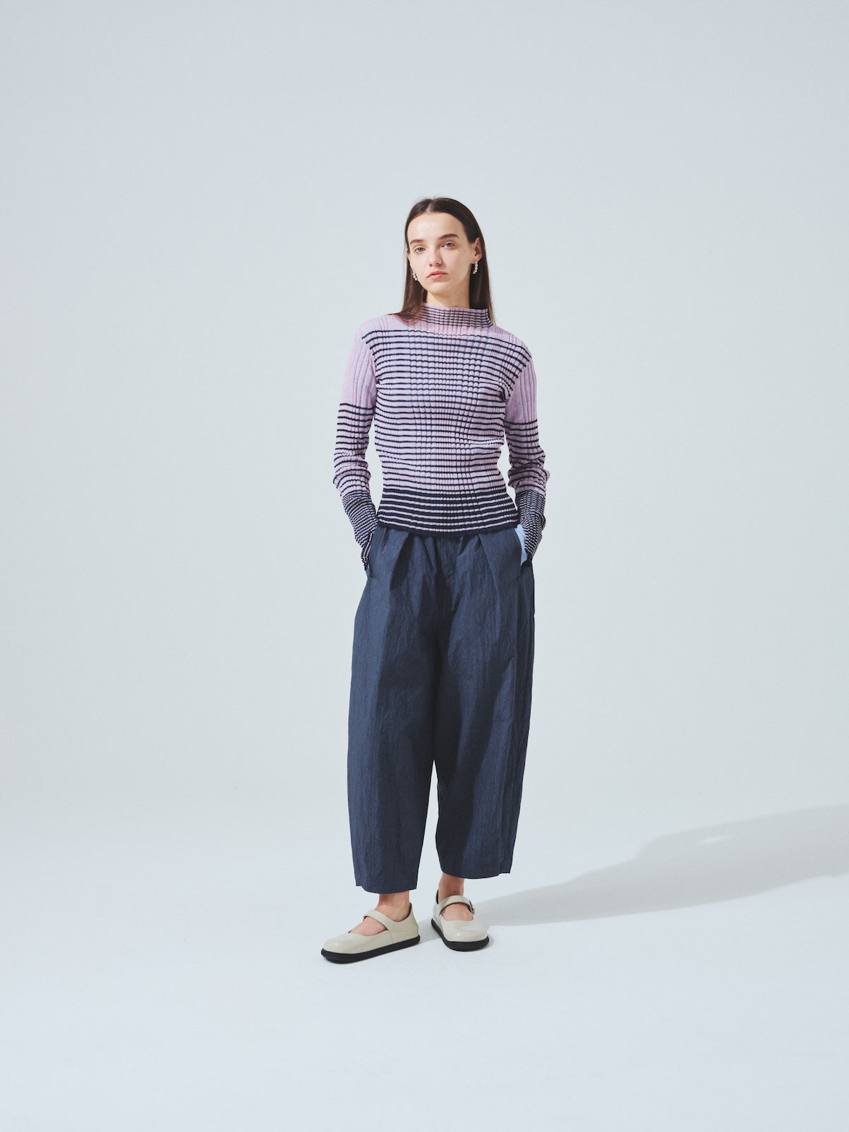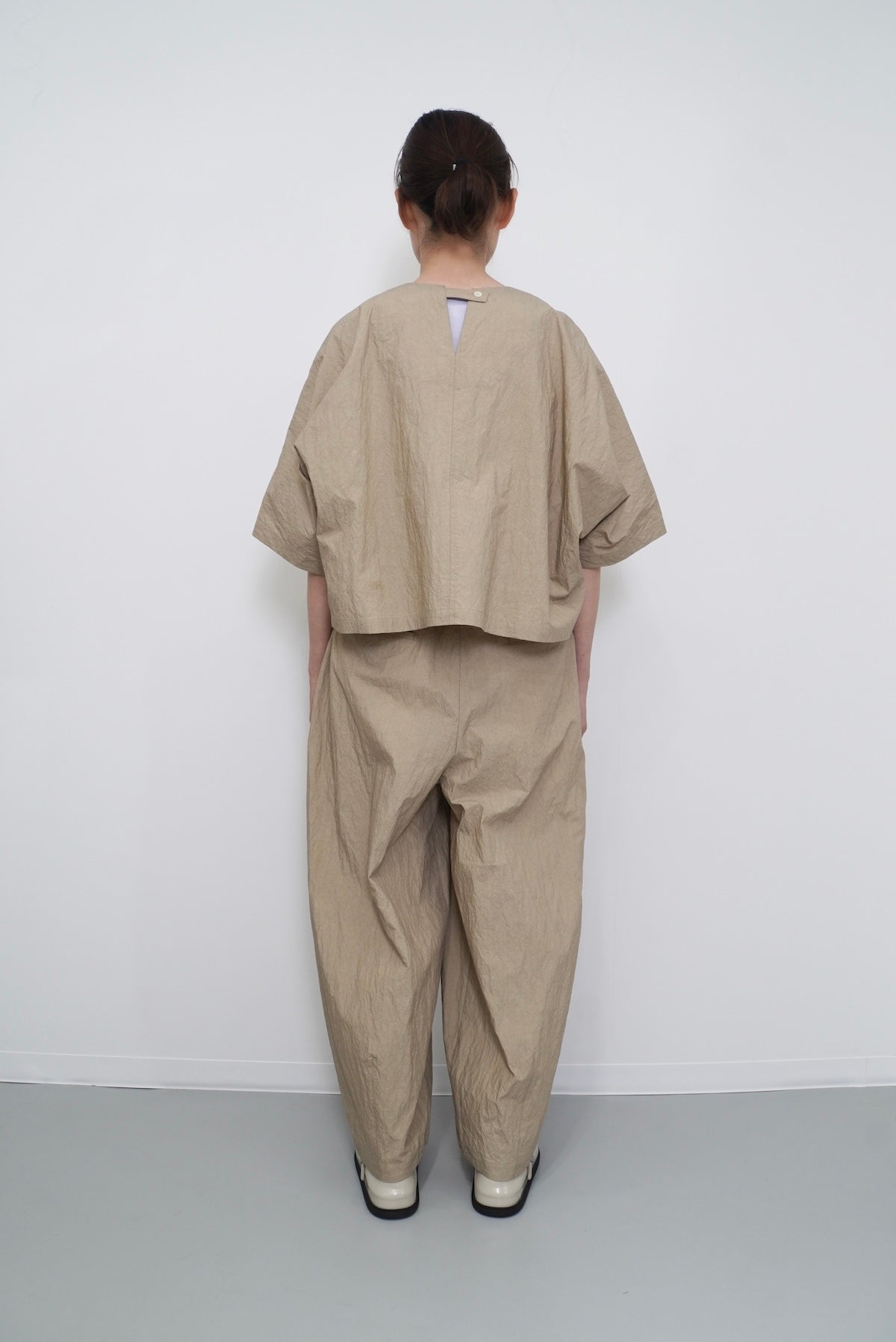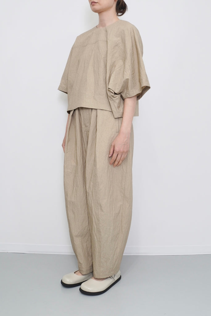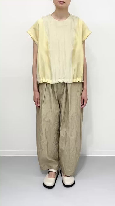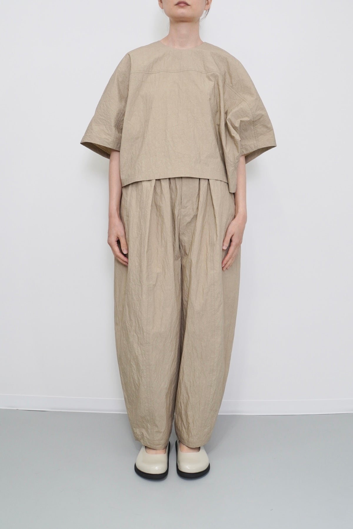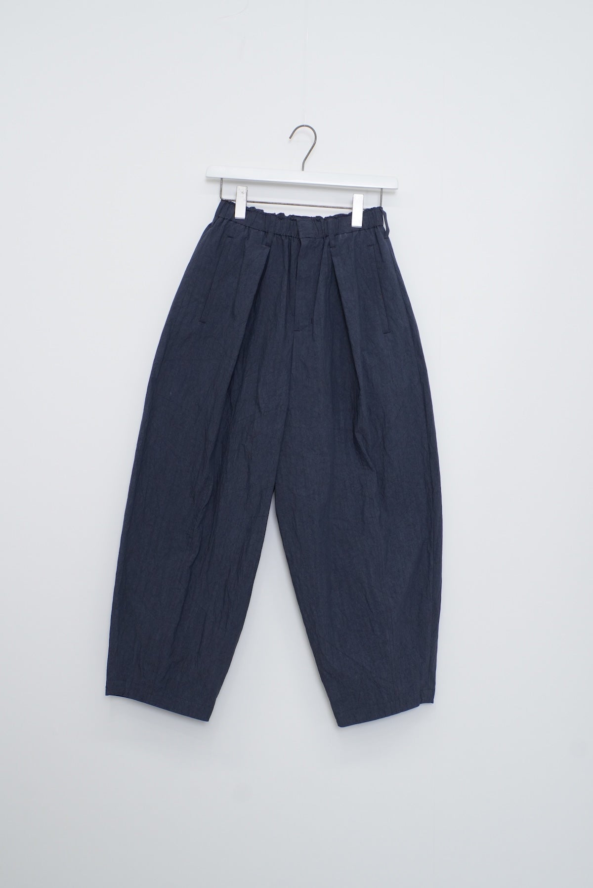 コクーンシルエットの特徴は、ウエストに施された大きなタックとワイドなシルエットを、裾のデザインダーツや切替線で調整し、独特な丸みのあるシルエットを作り出しています。前開き部分にはデザイン性の高いメタルフックを使用し、ウエストにはゴムとサイズ調整用のドローコードが付いているため、快適な着心地を実現しています。脇と後に機能的なポケットが付いてます。