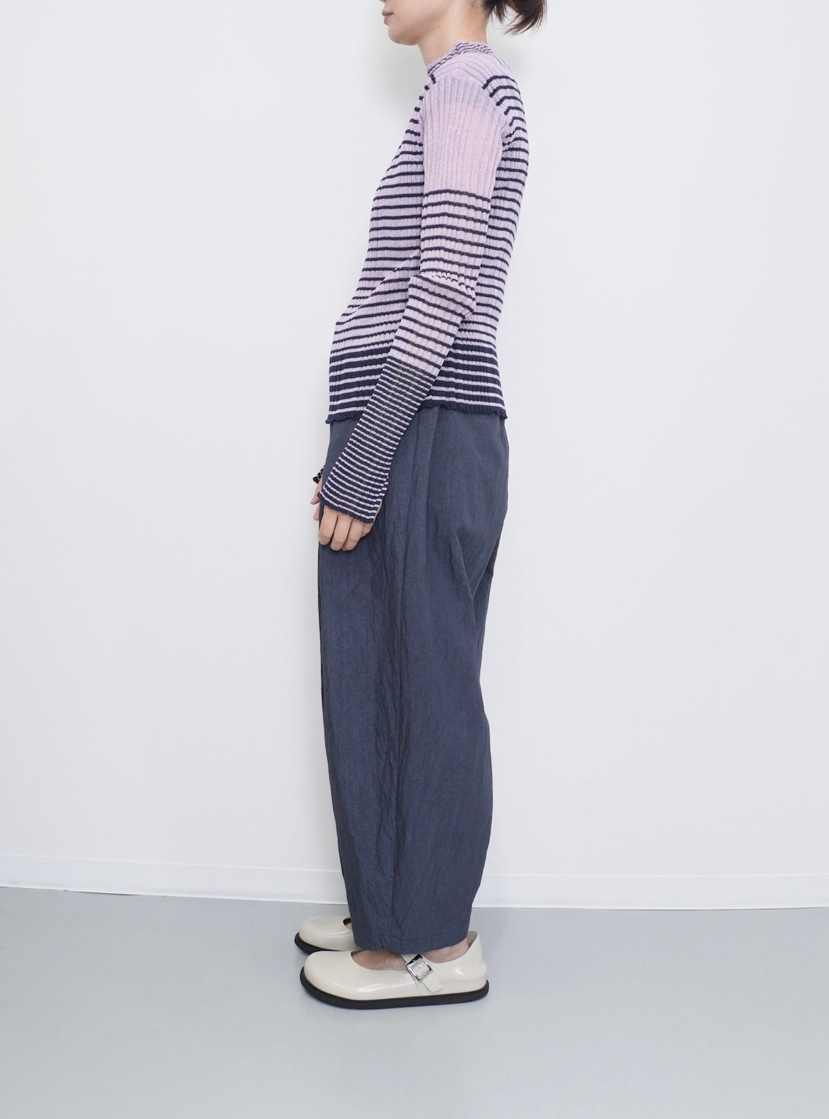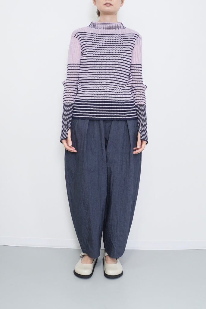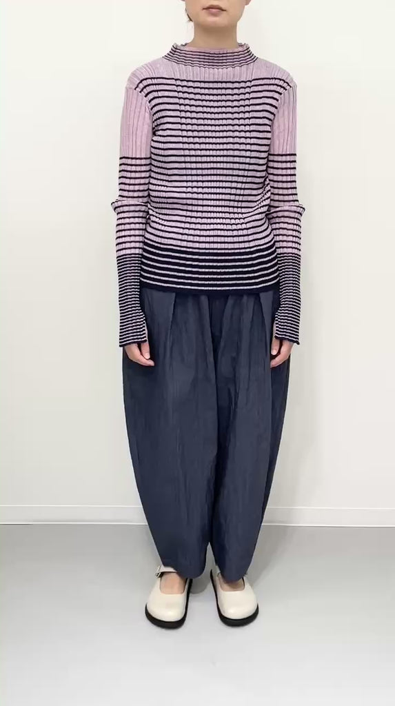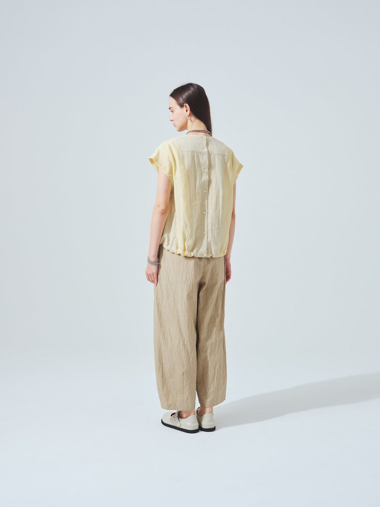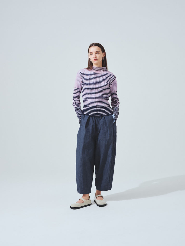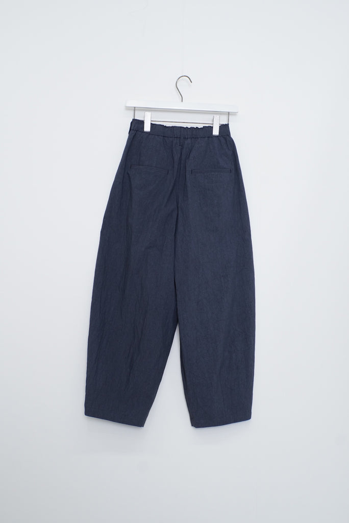 コクーンシルエットの特徴は、ウエストに施された大きなタックとワイドなシルエットを、裾のデザインダーツや切替線で調整し、独特な丸みのあるシルエットを作り出しています。前開き部分にはデザイン性の高いメタルフックを使用し、ウエストにはゴムとサイズ調整用のドローコードが付いているため、快適な着心地を実現しています。脇と後に機能的なポケットが付いてます。