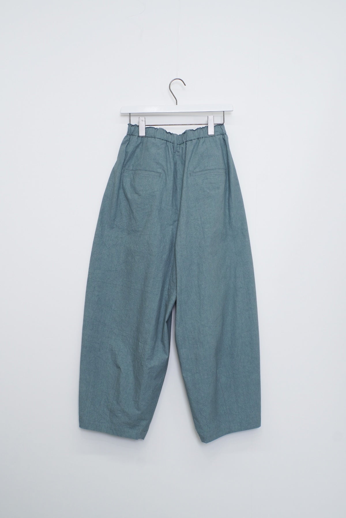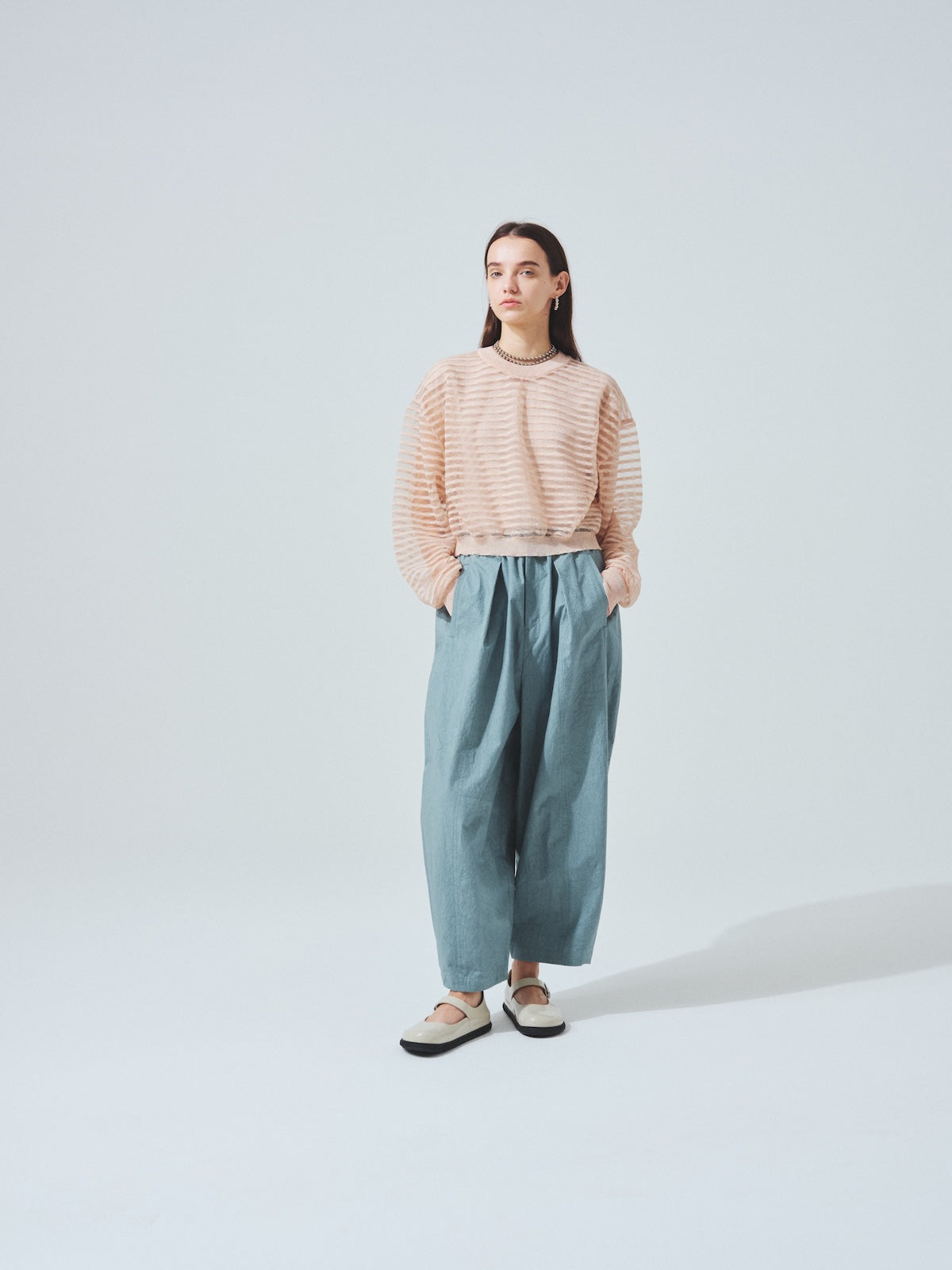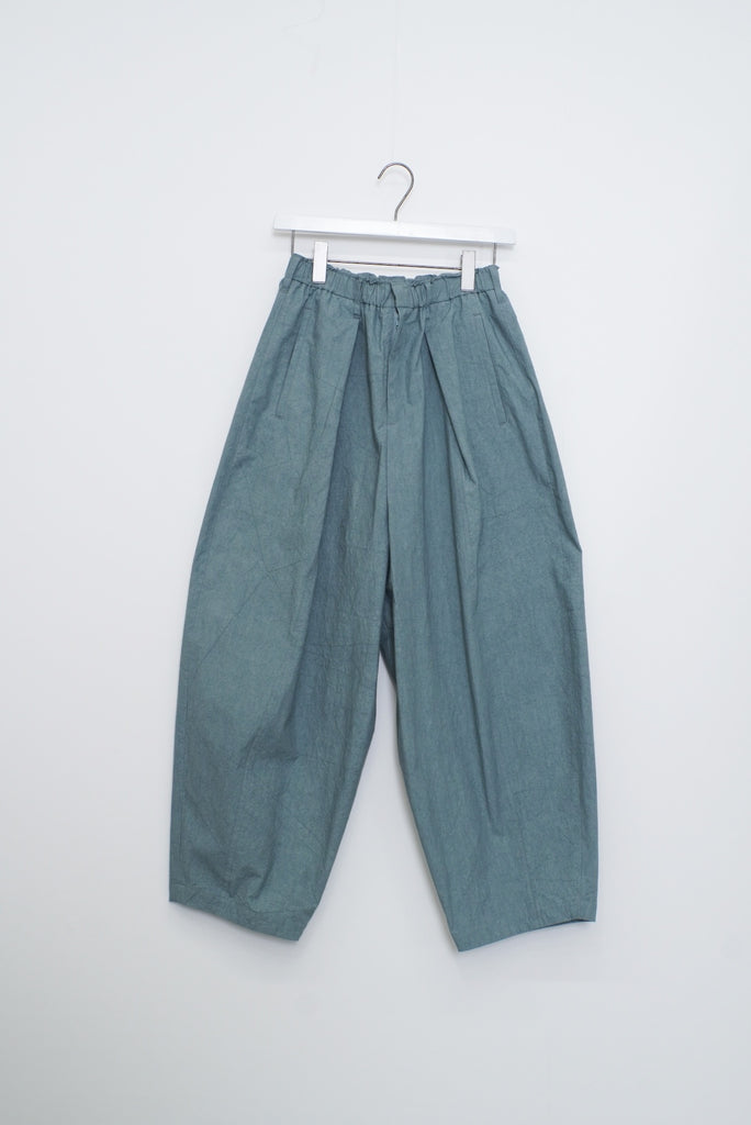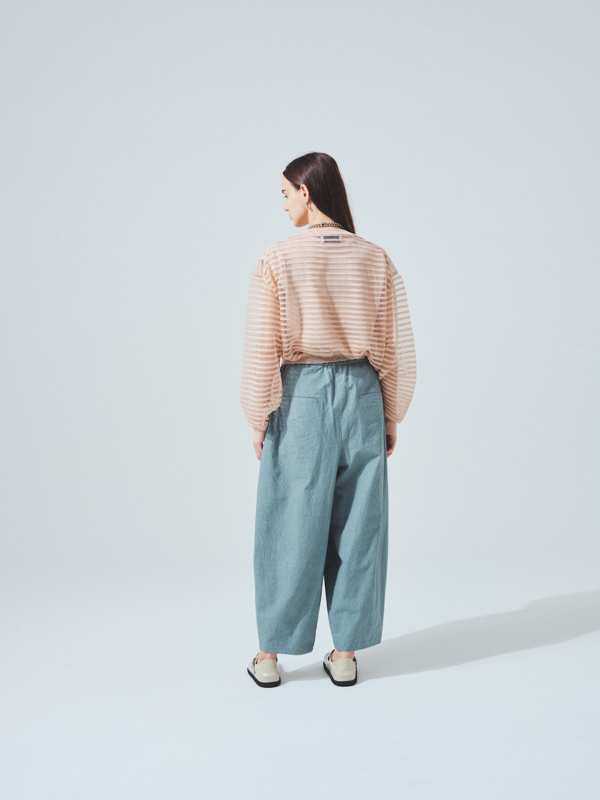 コクーンシルエットの特徴は、ウエストに施された大きなタックとワイドなシルエットを、裾のデザインダーツや切替線で調整し、独特な丸みのあるシルエットを作り出しています。前開き部分にはデザイン性の高いメタルフックを使用し、ウエストにはゴムとサイズ調整用のドローコードが付いているため、快適な着心地を実現しています。脇と後に機能的なポケットが付いてます。