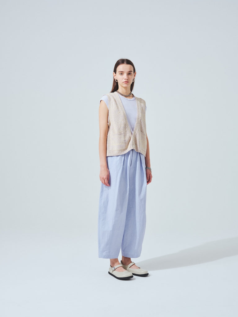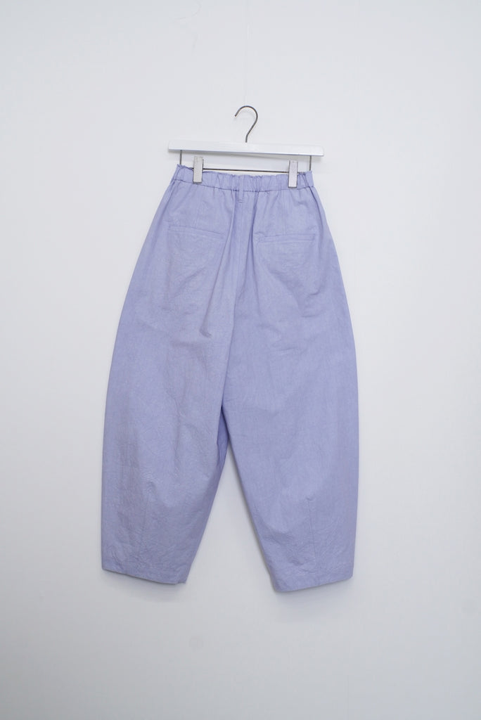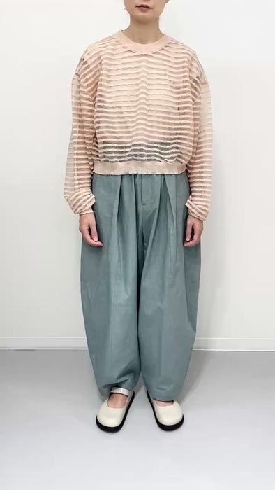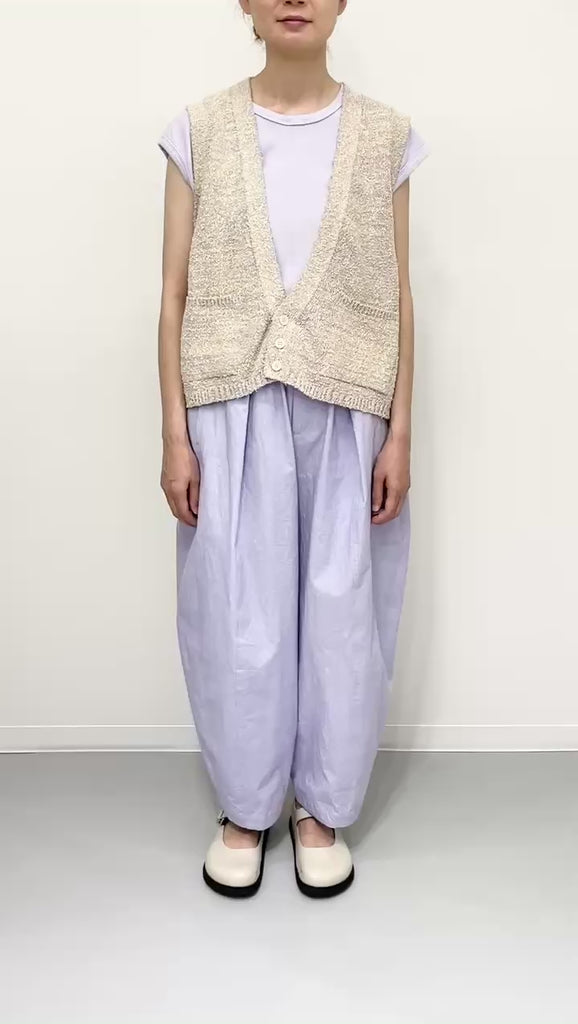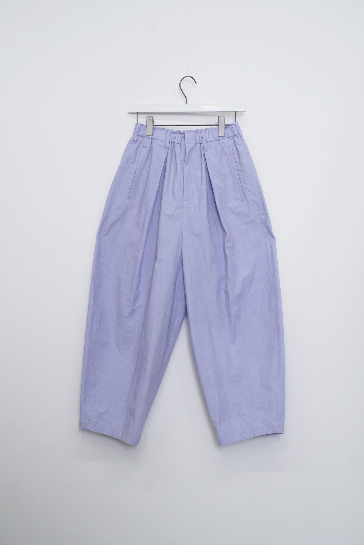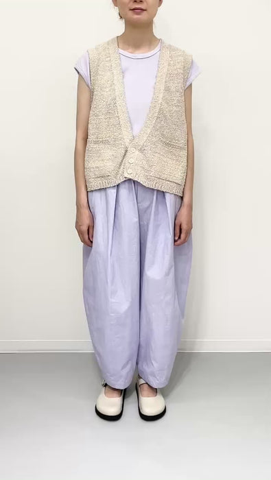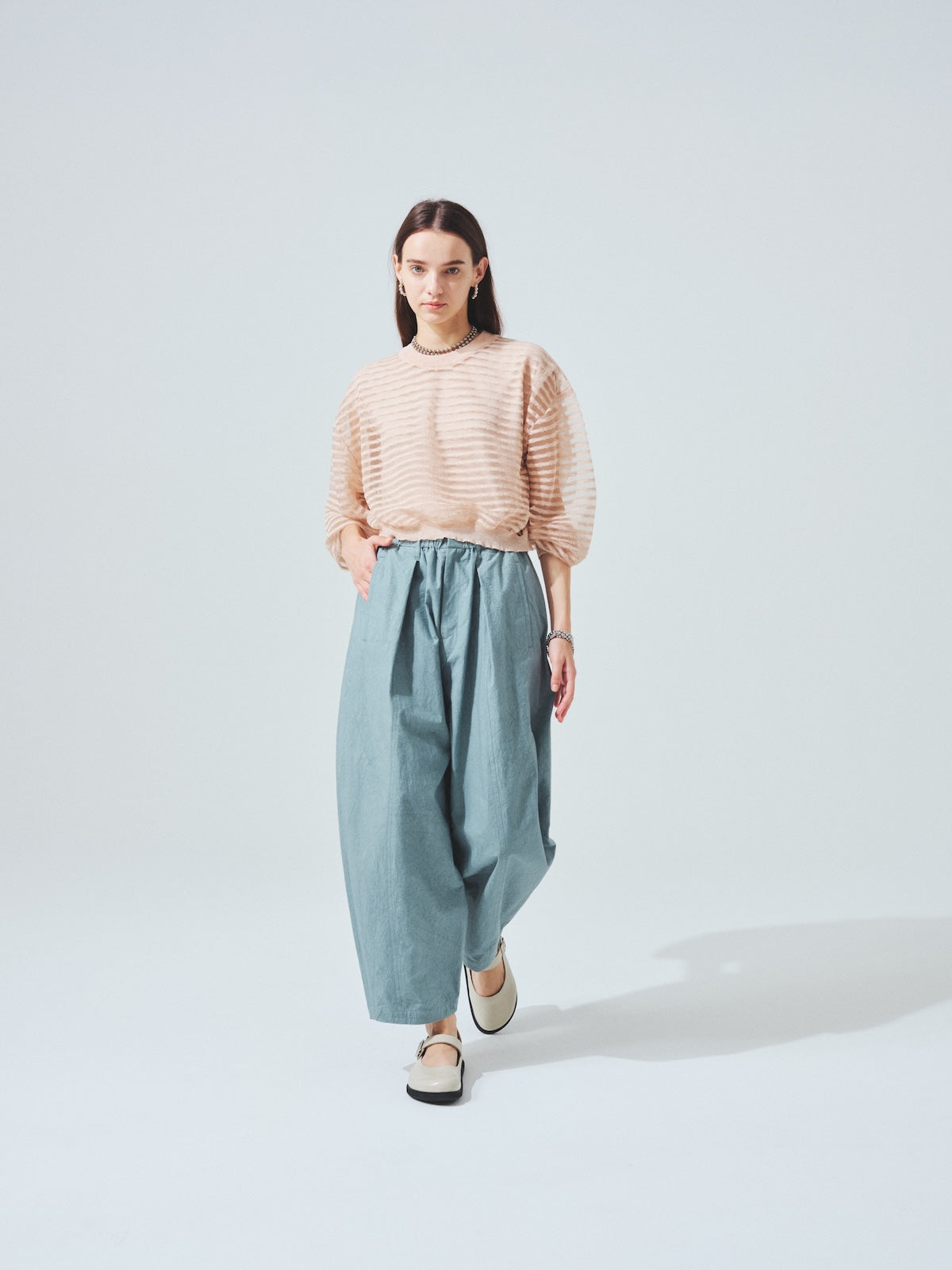 コクーンシルエットの特徴は、ウエストに施された大きなタックとワイドなシルエットを、裾のデザインダーツや切替線で調整し、独特な丸みのあるシルエットを作り出しています。前開き部分にはデザイン性の高いメタルフックを使用し、ウエストにはゴムとサイズ調整用のドローコードが付いているため、快適な着心地を実現しています。脇と後に機能的なポケットが付いてます。