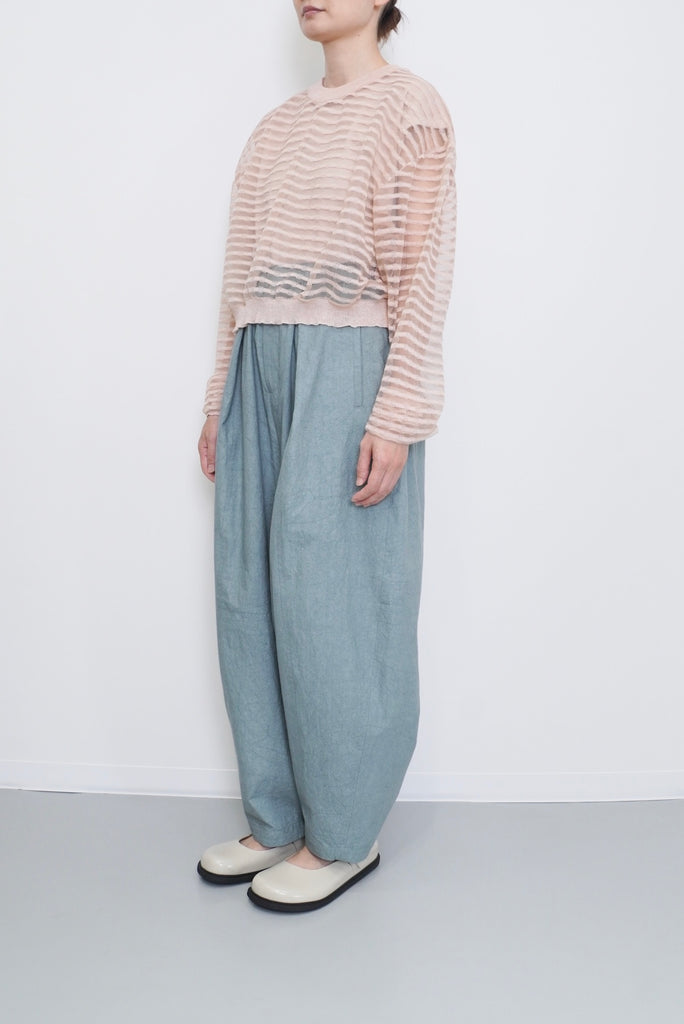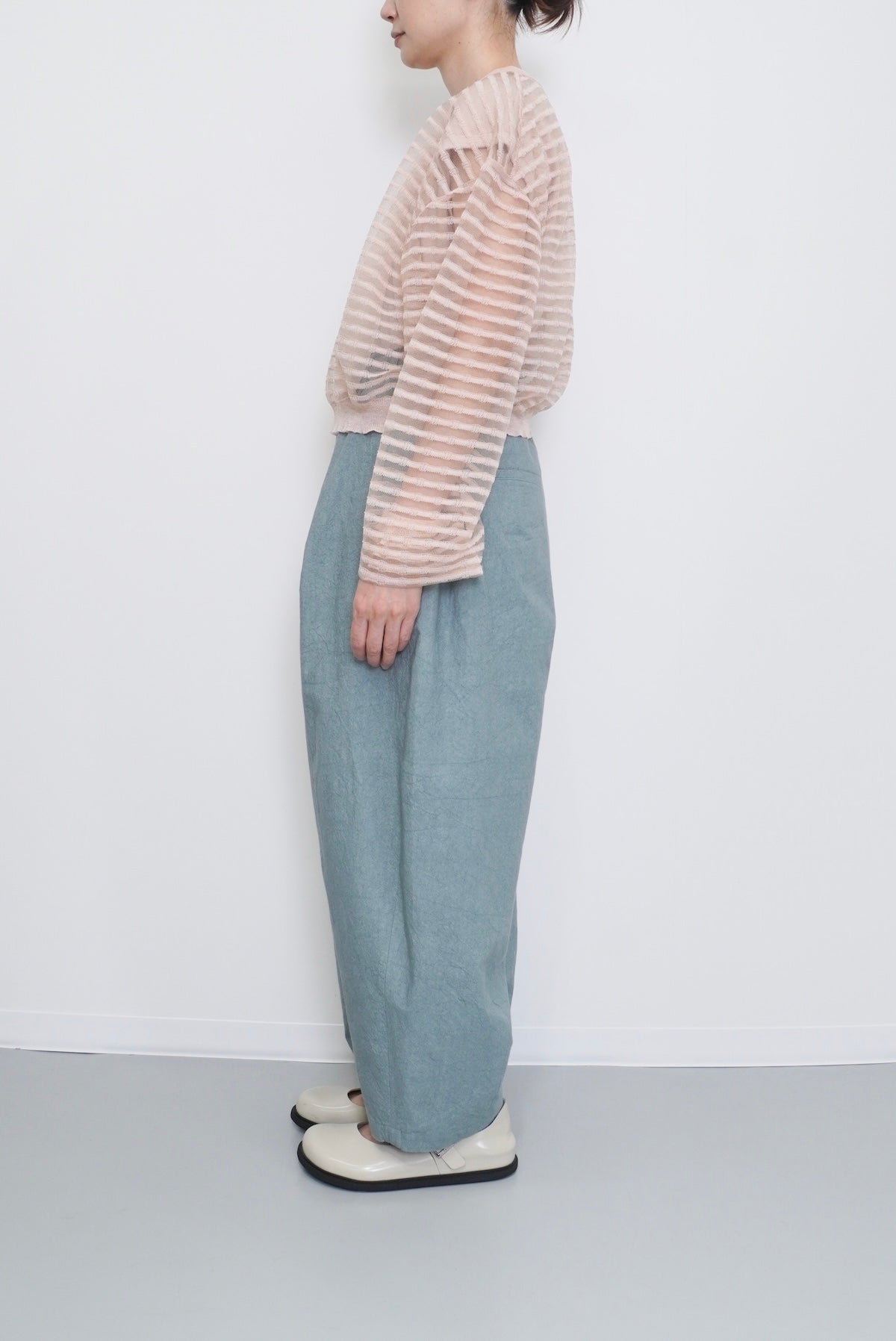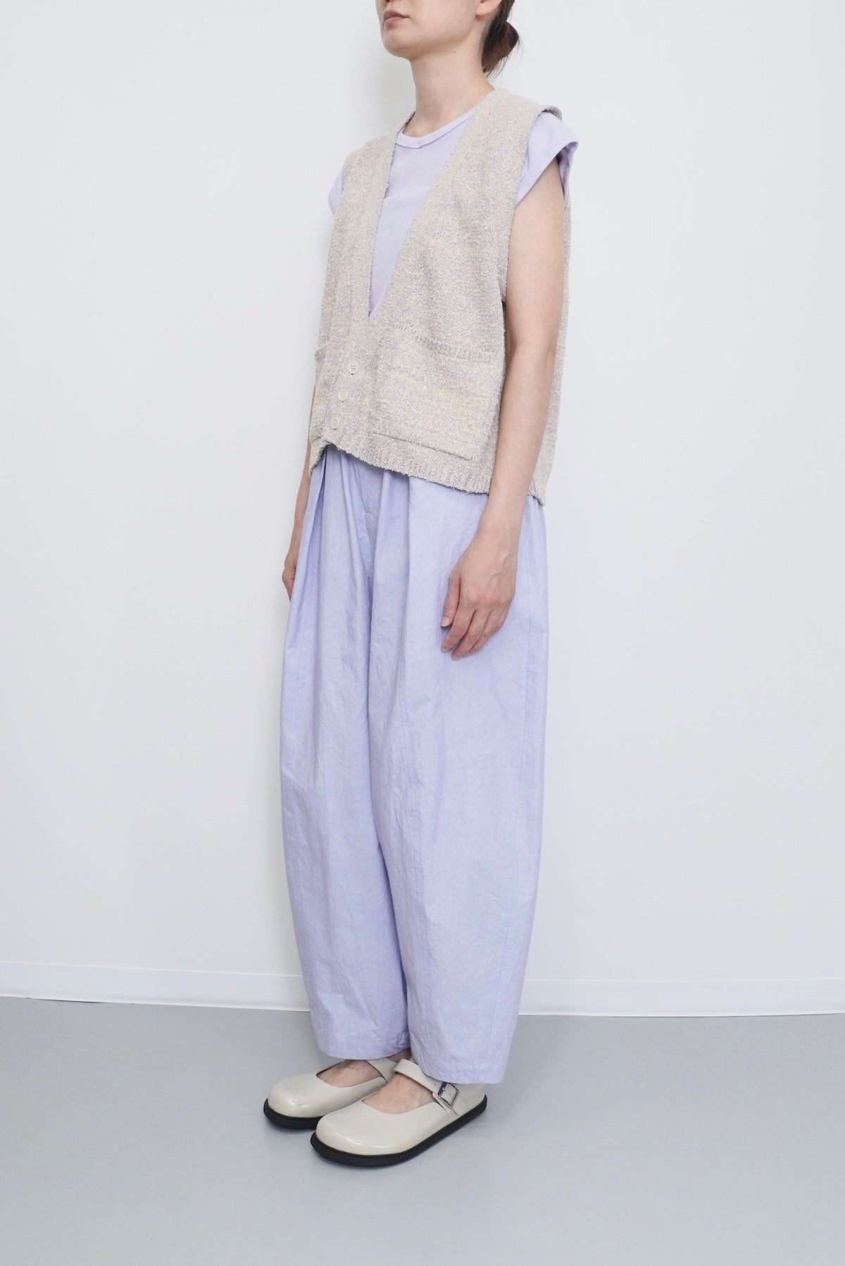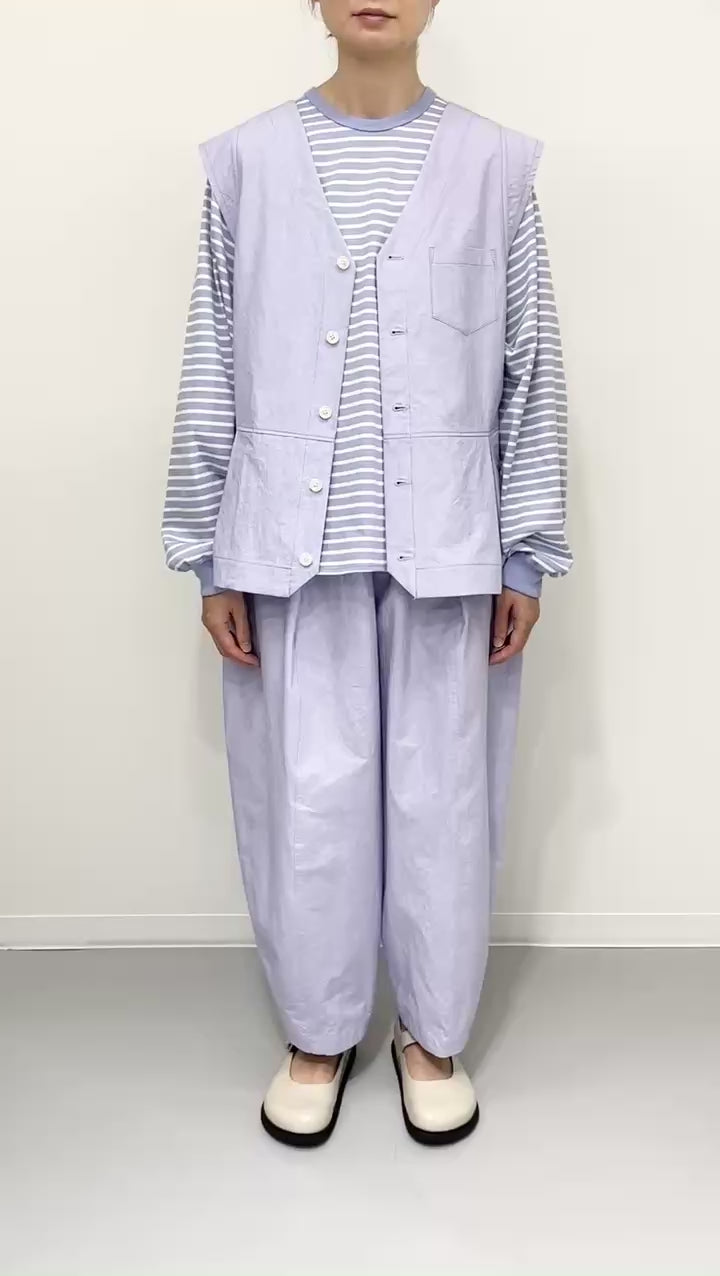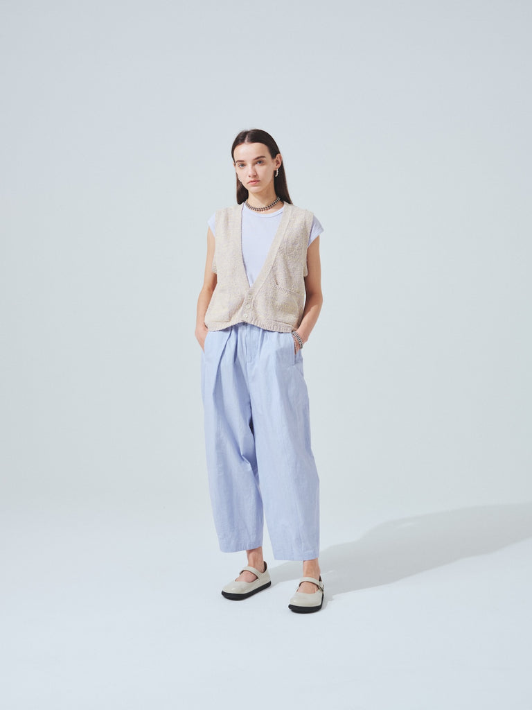コクーンシルエットの特徴は、ウエストに施された大きなタックとワイドなシルエットを、裾のデザインダーツや切替線で調整し、独特な丸みのあるシルエットを作り出しています。前開き部分にはデザイン性の高いメタルフックを使用し、ウエストにはゴムとサイズ調整用のドローコードが付いているため、快適な着心地を実現しています。脇と後に機能的なポケットが付いてます。
