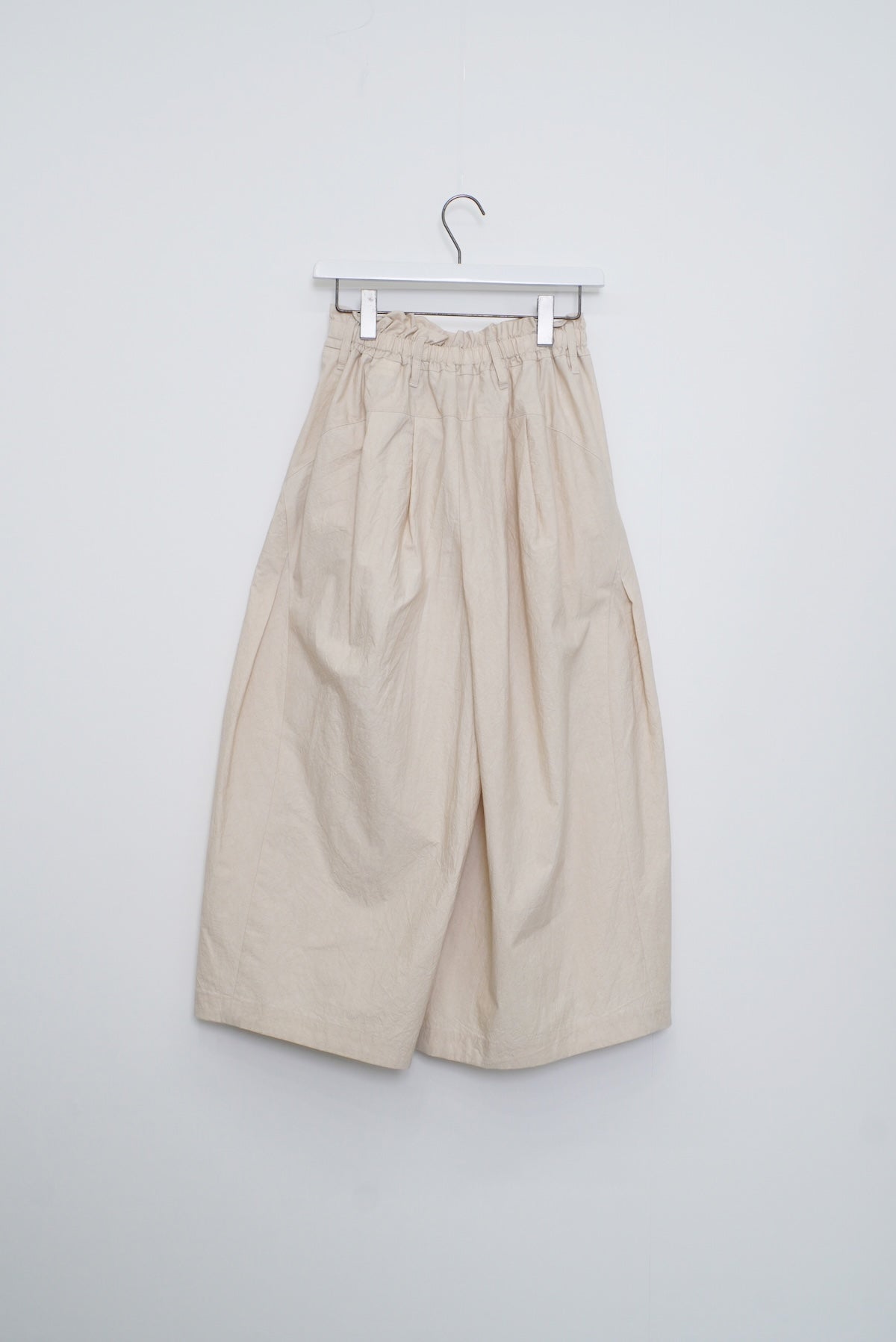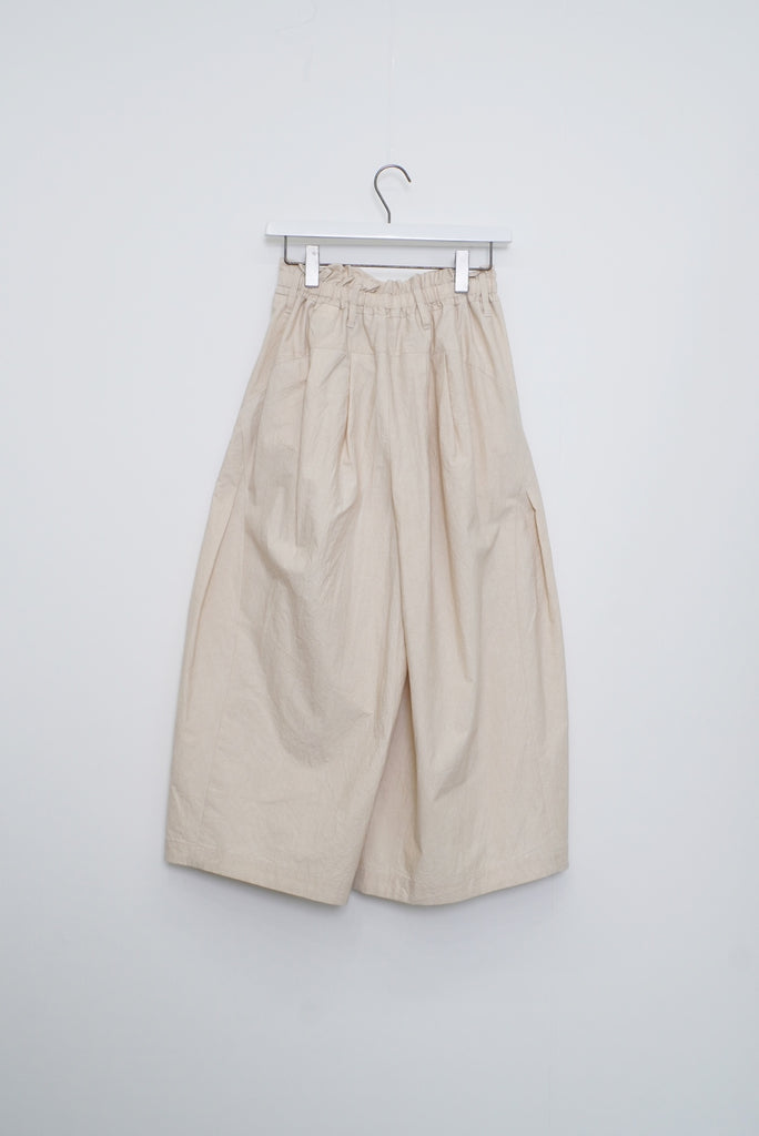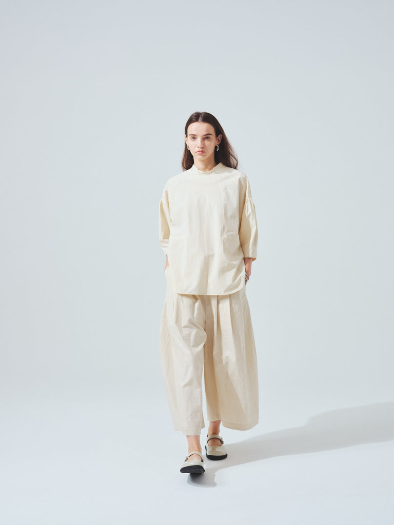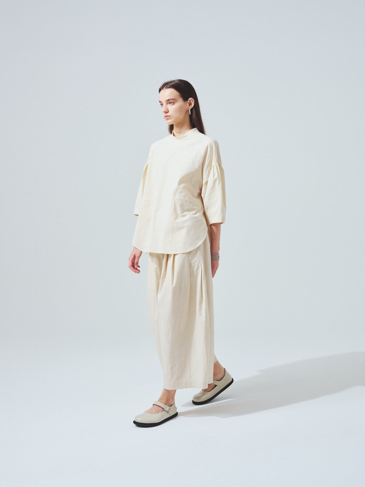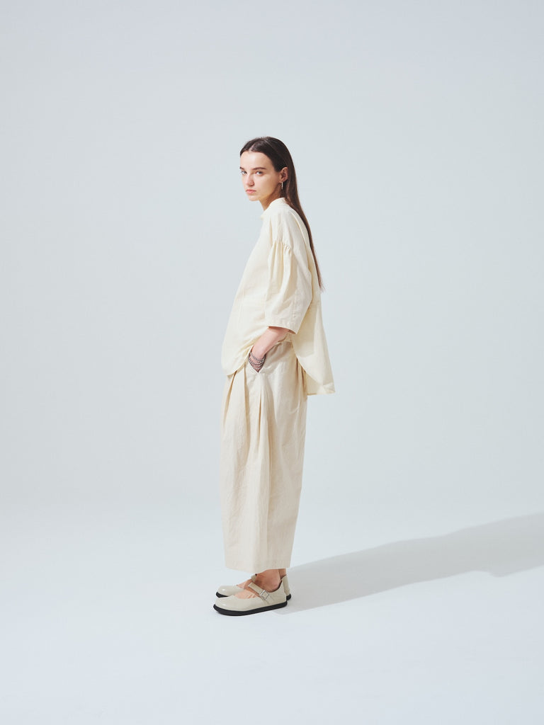 ワイドコクーンシルエットの特徴は、タックと有機的なカーブの切替線で独特な丸みのあるシルエットを作り出しています。ウエストにはゴムとサイズ調整用のドローコードが付いているため、快適な着心地を実現しています。脇に機能的なポケットが付いてます。