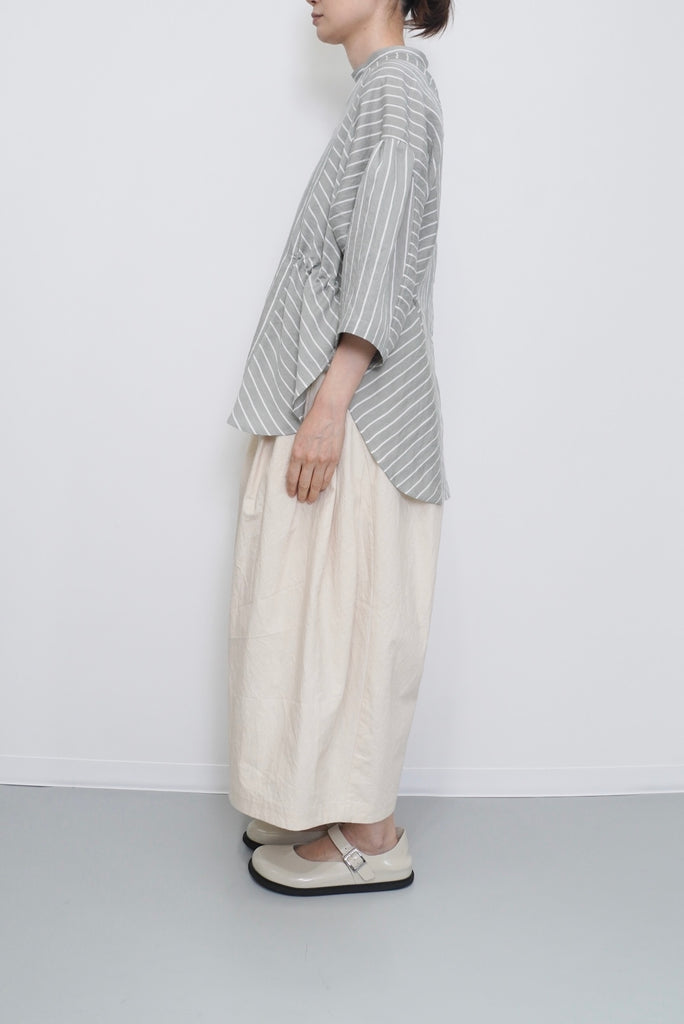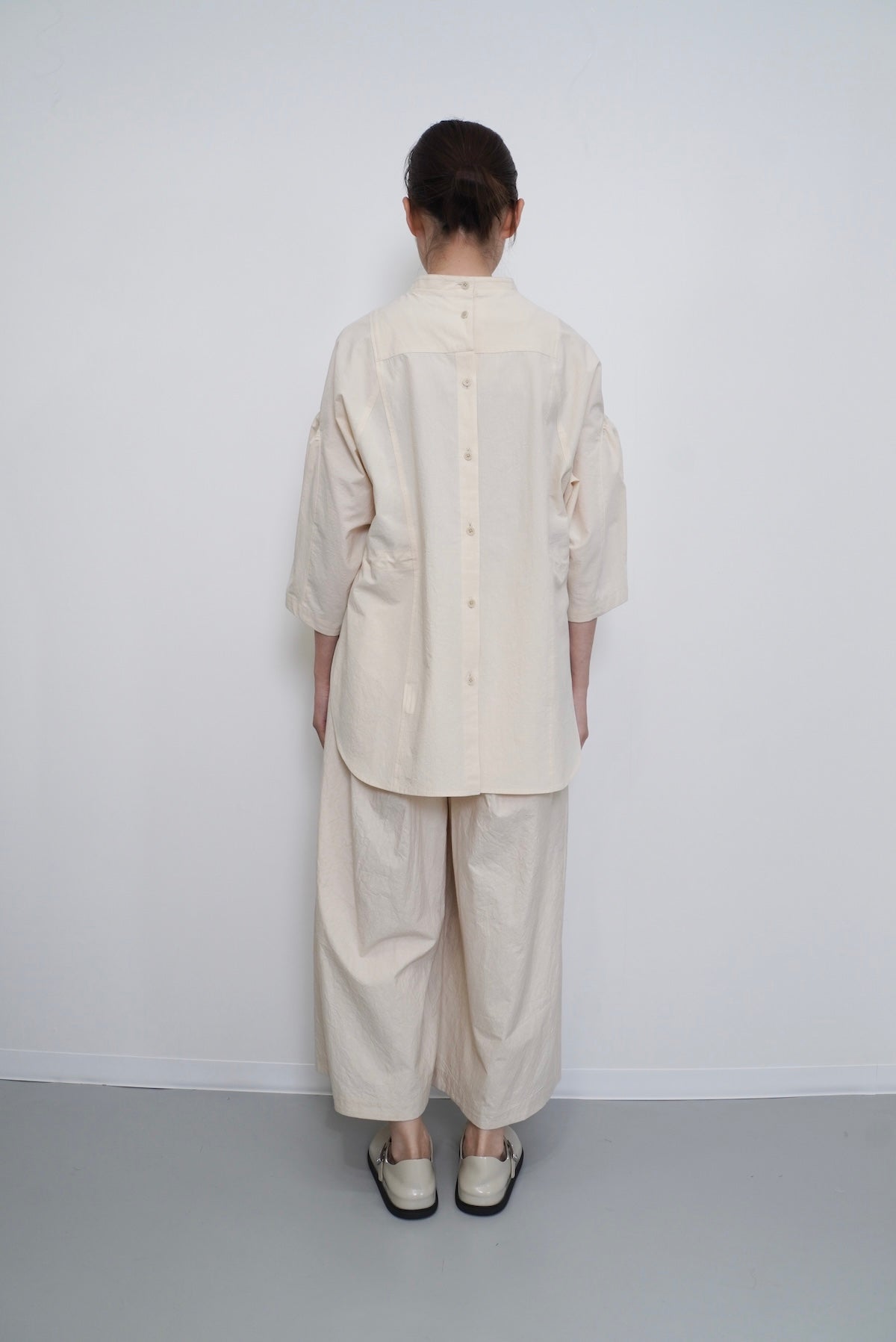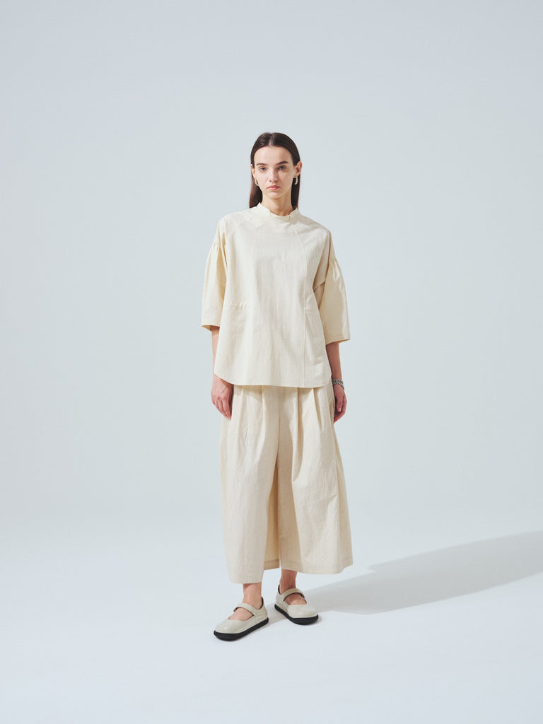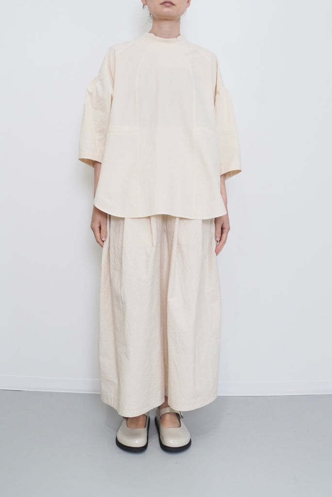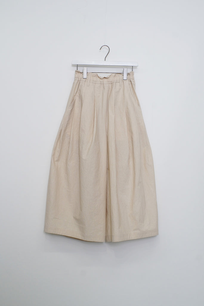 ワイドコクーンシルエットの特徴は、タックと有機的なカーブの切替線で独特な丸みのあるシルエットを作り出しています。ウエストにはゴムとサイズ調整用のドローコードが付いているため、快適な着心地を実現しています。脇に機能的なポケットが付いてます。