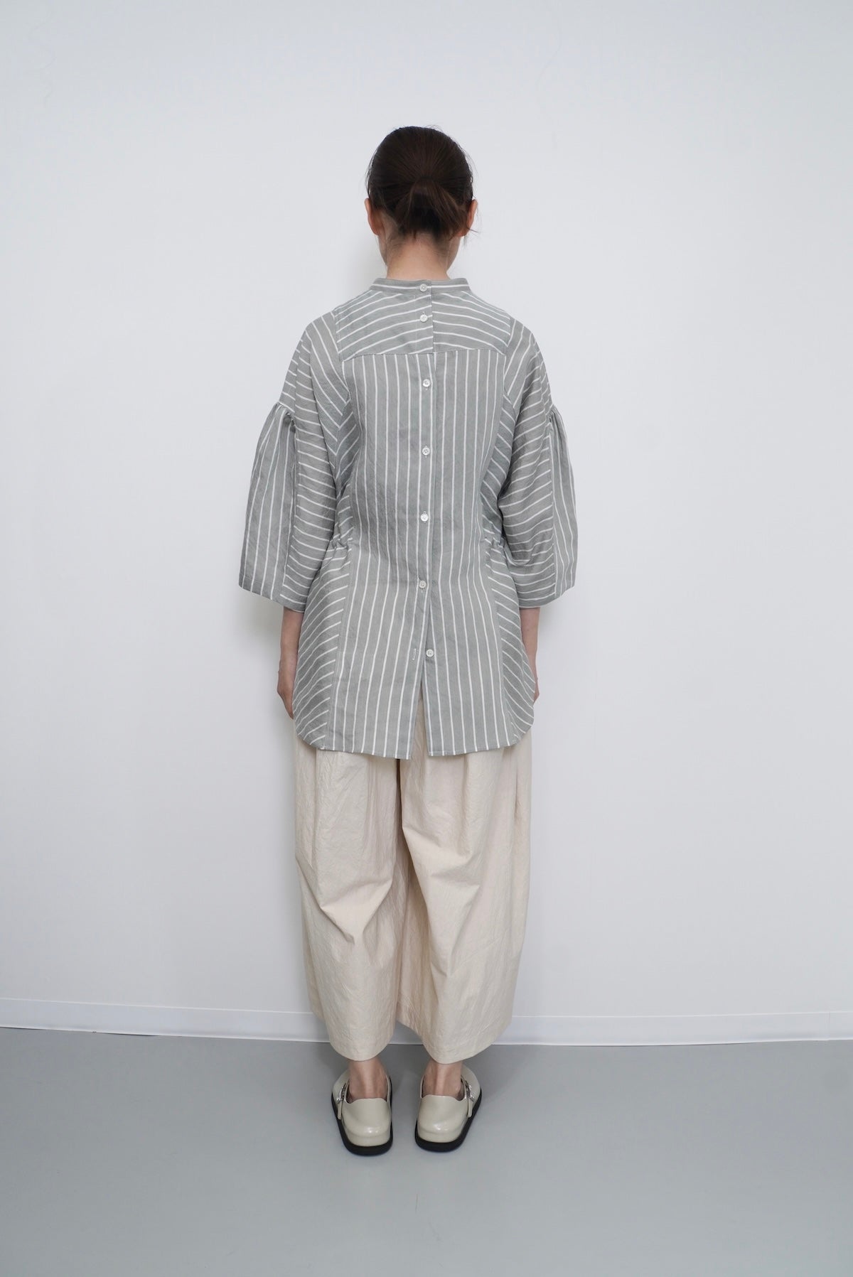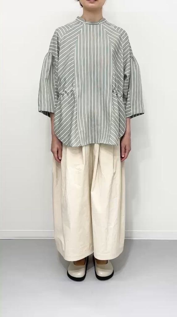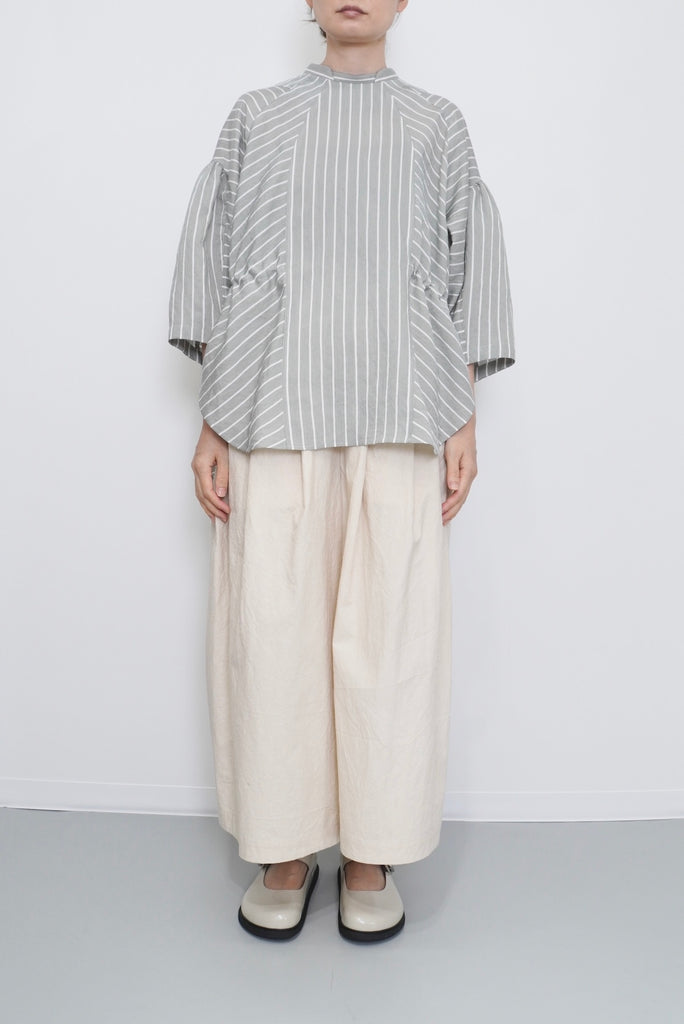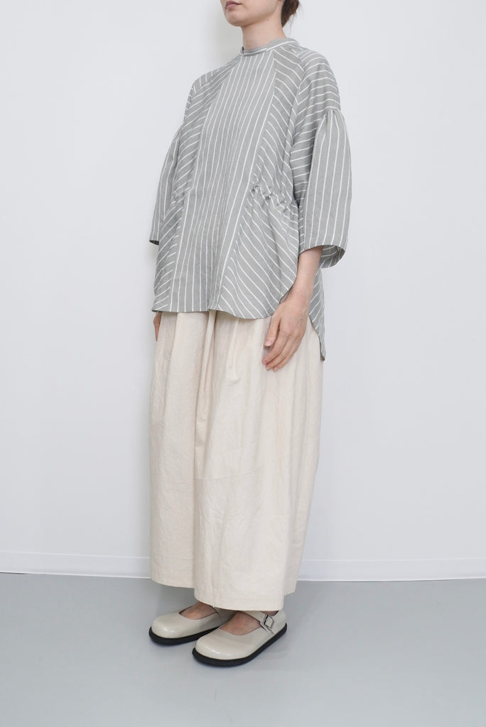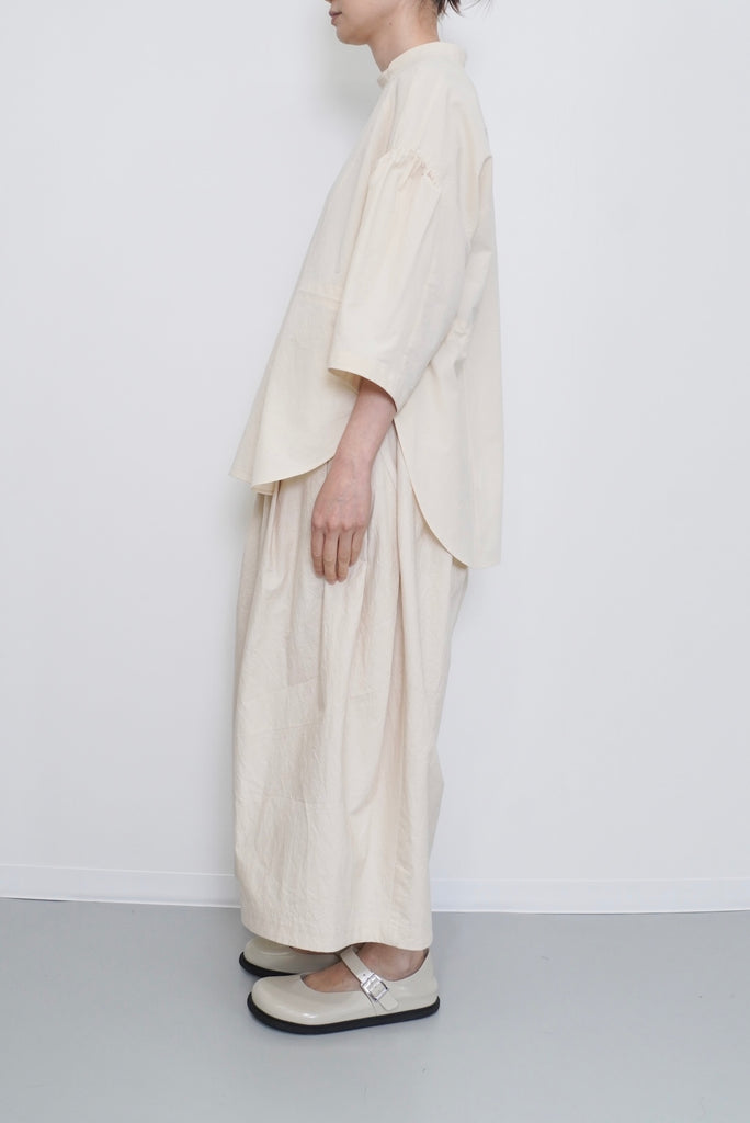 ワイドコクーンシルエットの特徴は、タックと有機的なカーブの切替線で独特な丸みのあるシルエットを作り出しています。ウエストにはゴムとサイズ調整用のドローコードが付いているため、快適な着心地を実現しています。脇に機能的なポケットが付いてます。