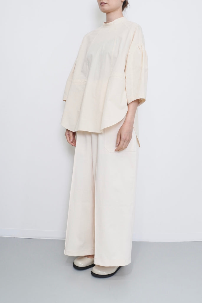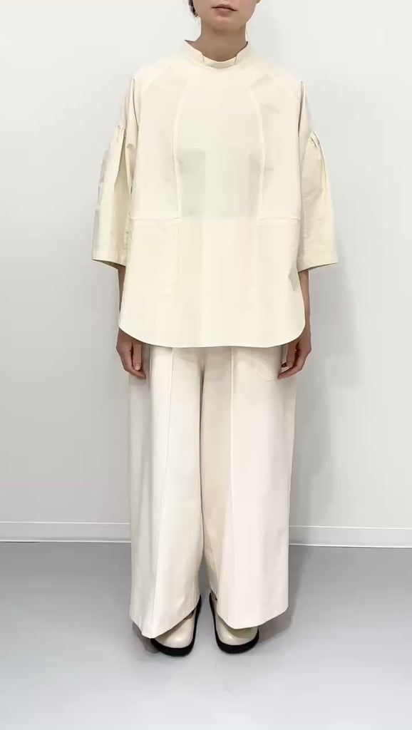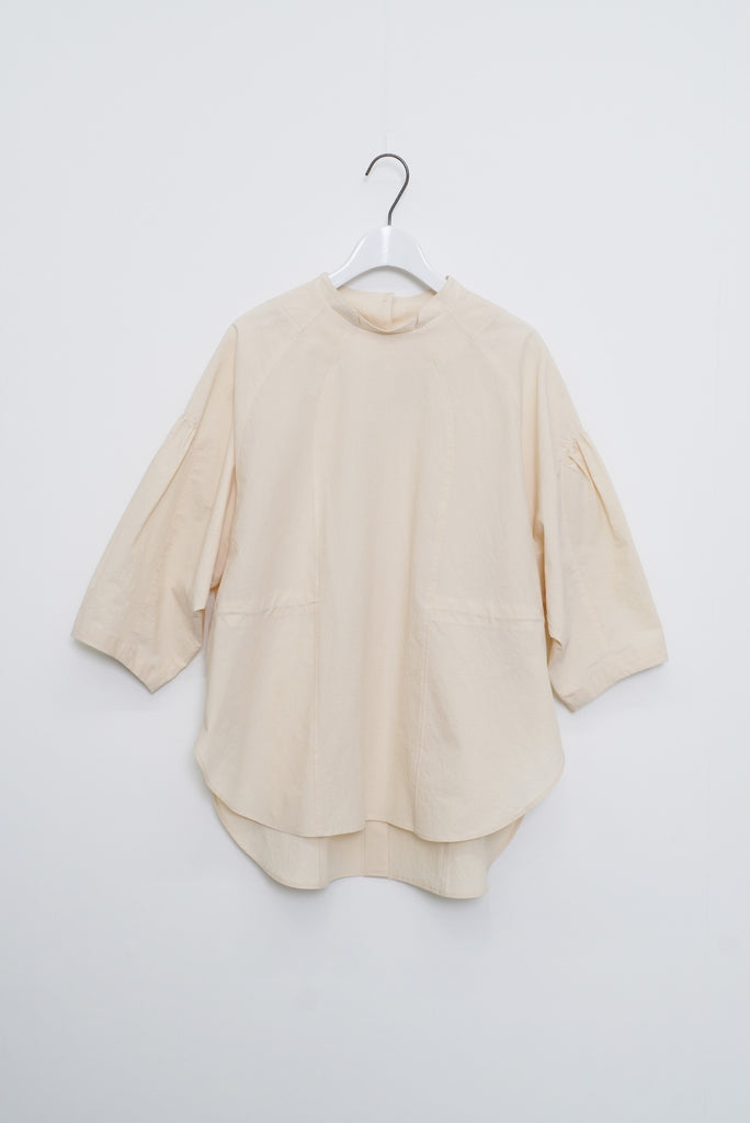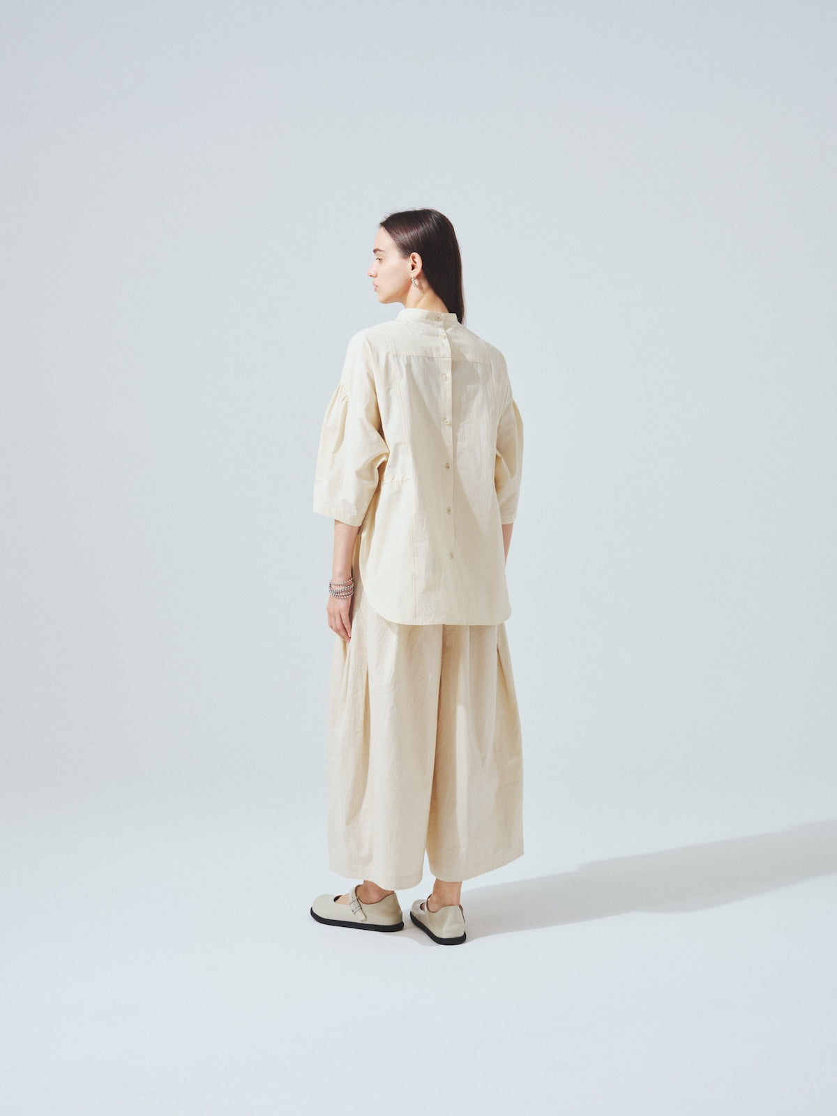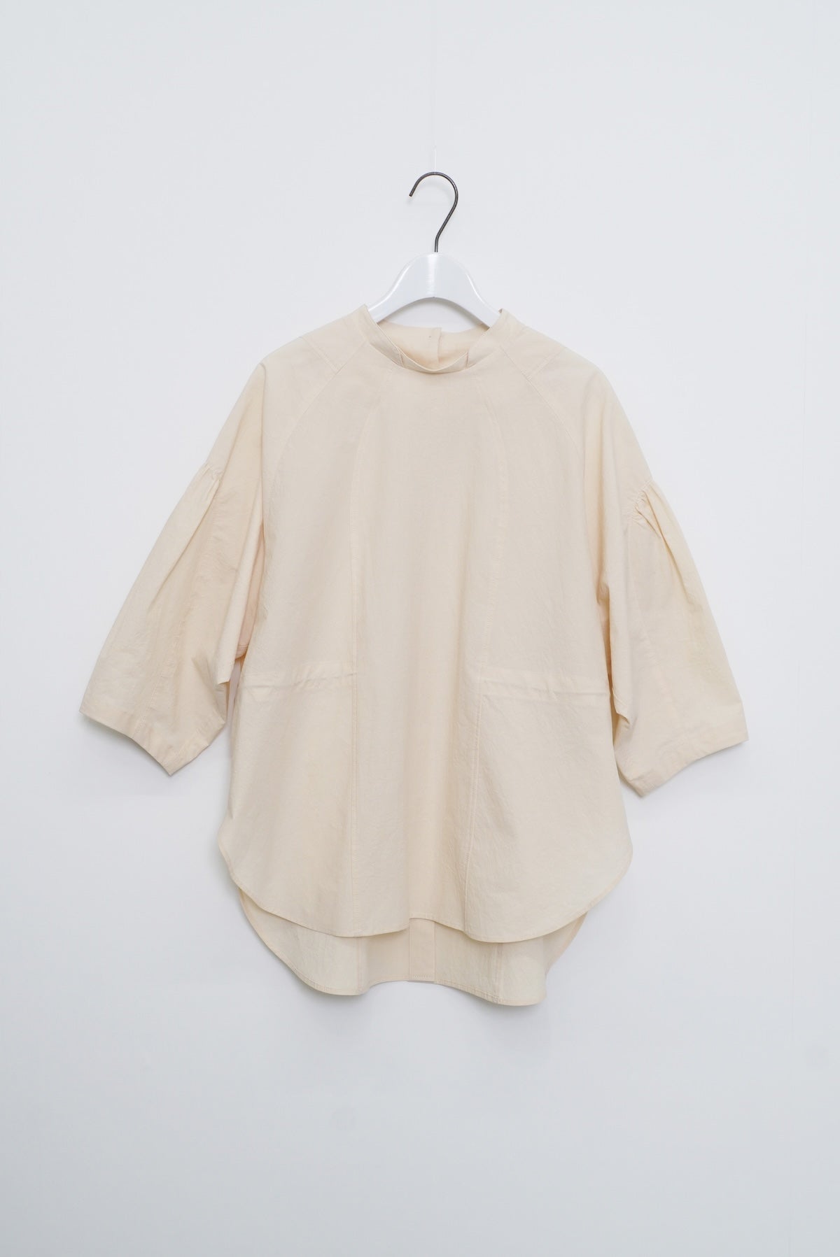 特徴的なスタンドカラーと、タックによって立体的に造形されたコクーンシルエットの袖が印象的。