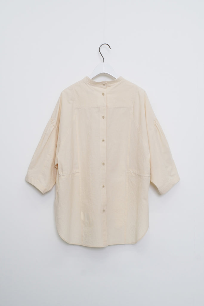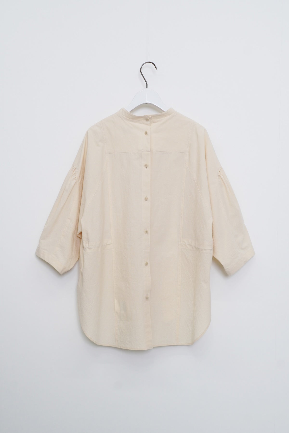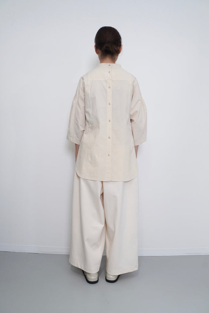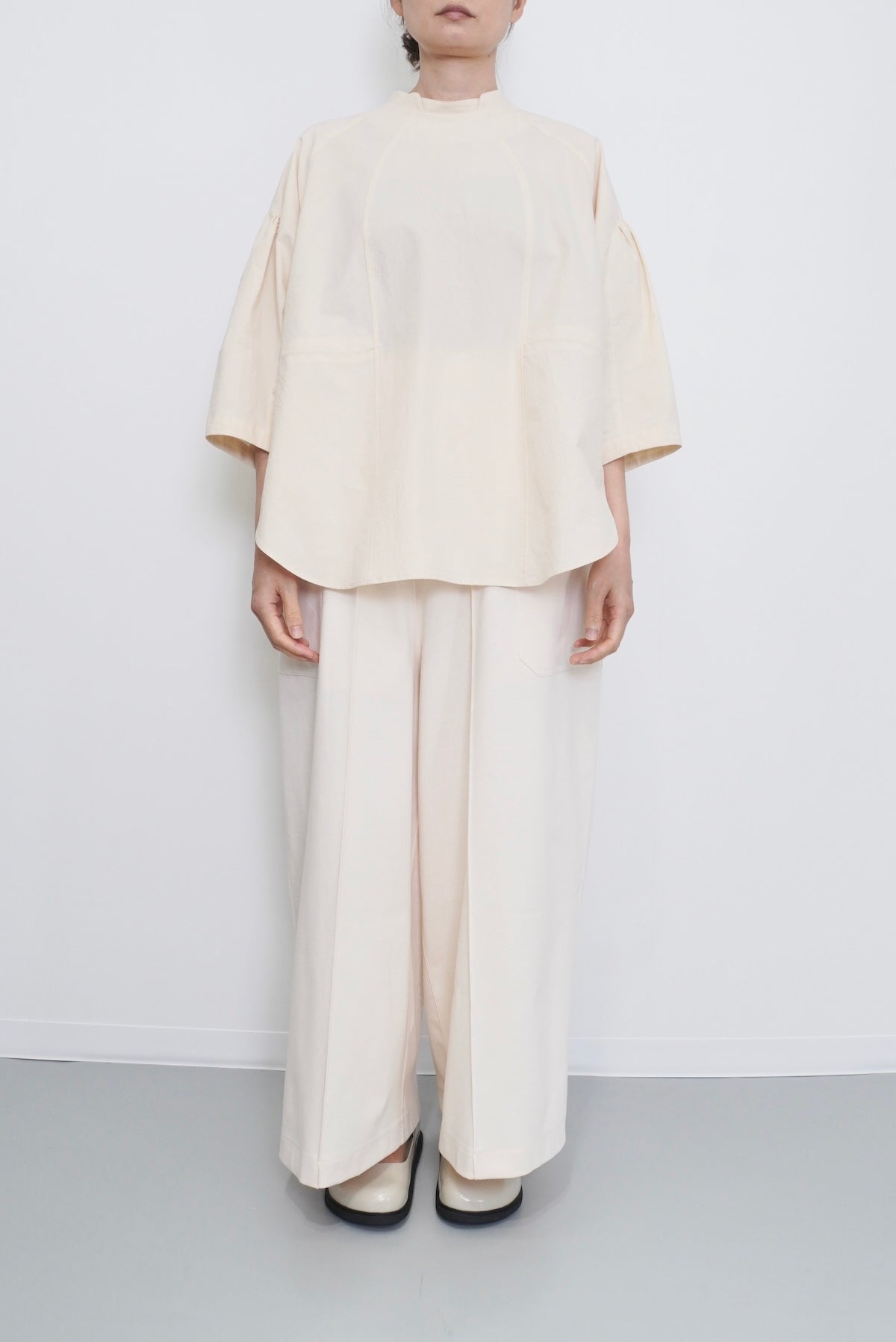 特徴的なスタンドカラーと、タックによって立体的に造形されたコクーンシルエットの袖が印象的。