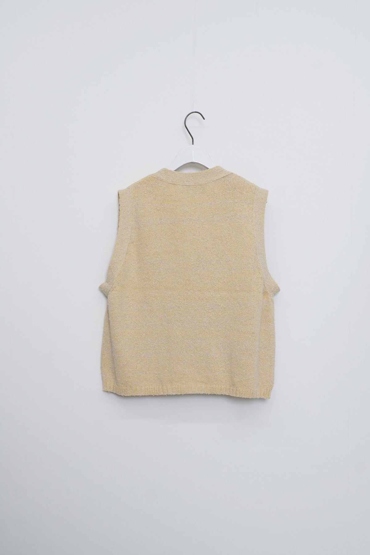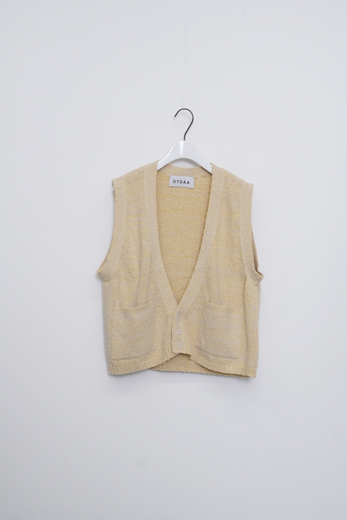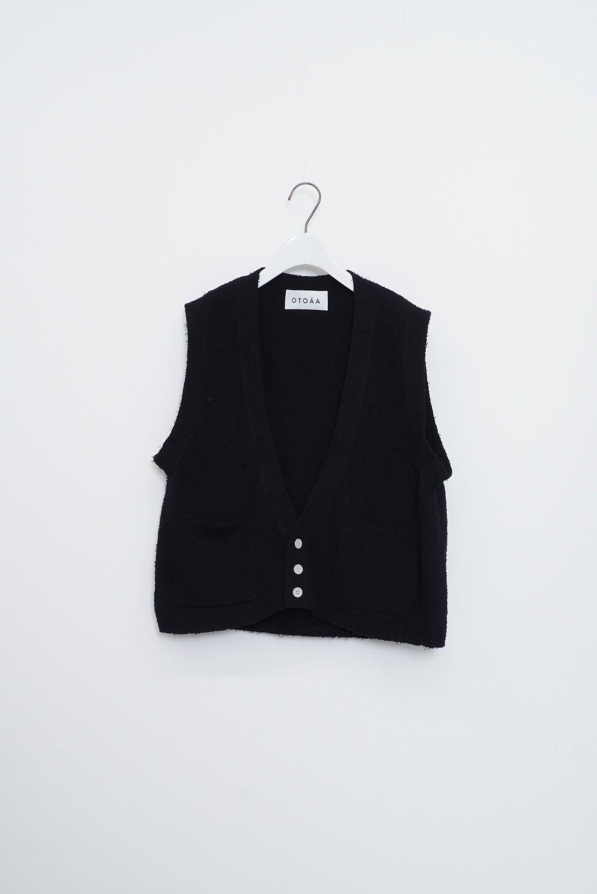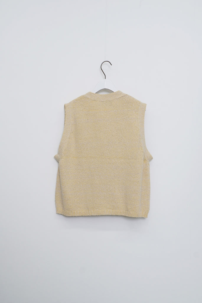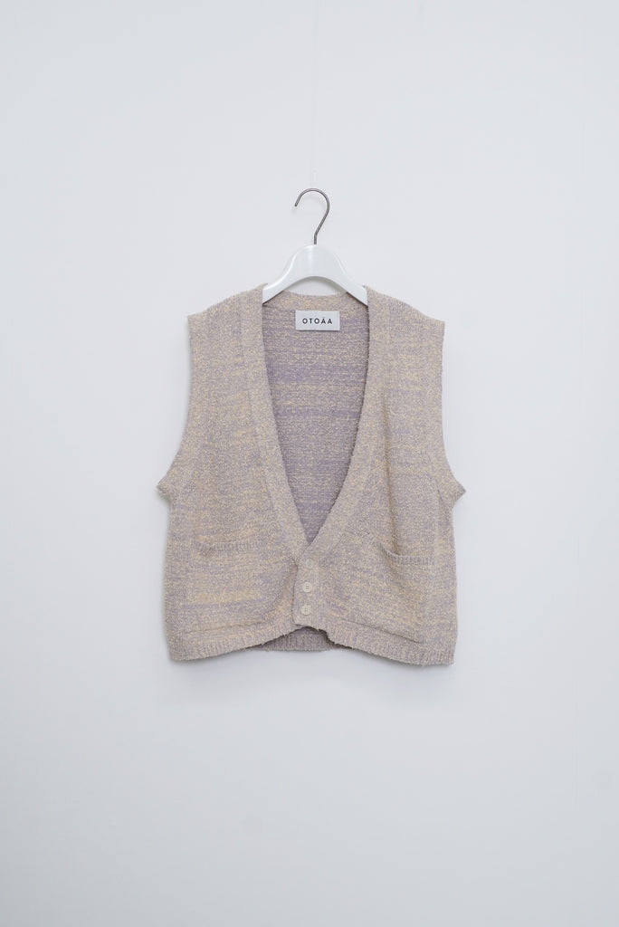 クラシカルなイメージのニットベストです。2つの糸を組み合わせて編んだ素材が特徴的な編み地は天竺の裏使いをしています。コンパクトなボックスシルエット、前身頃にポケットが付いていてデザインのバランスを良くしてます。ロゴ入りの天然のナットボタンを使用してます。