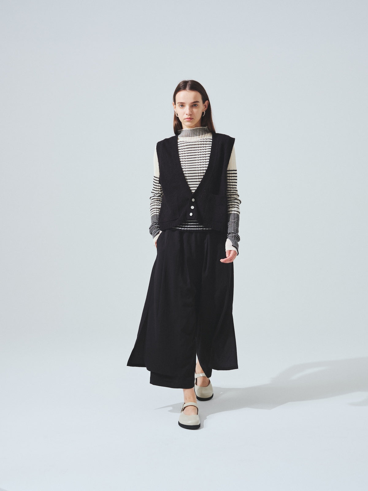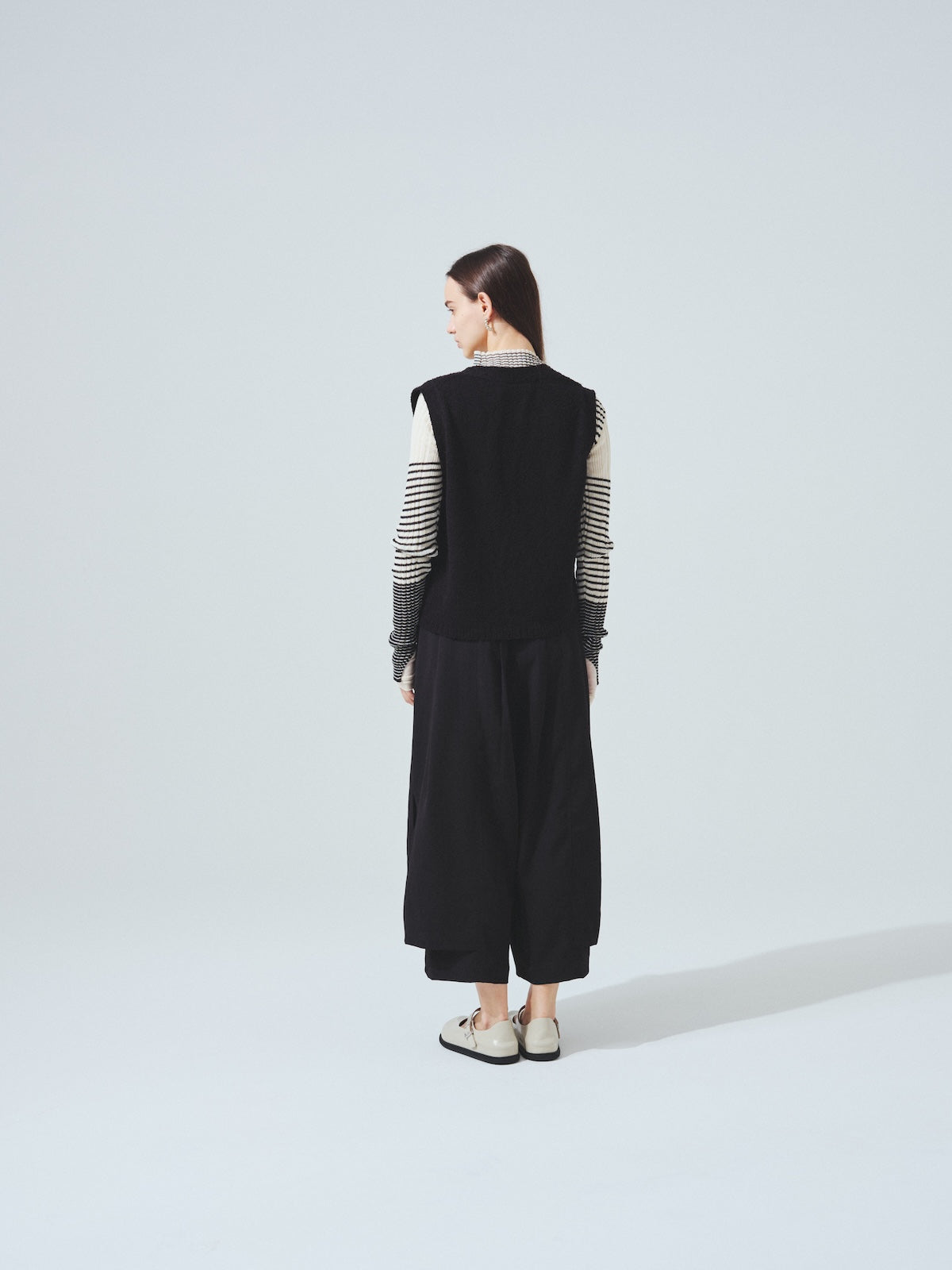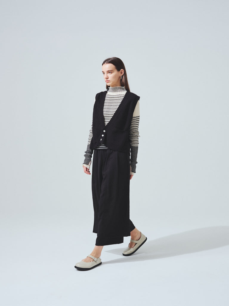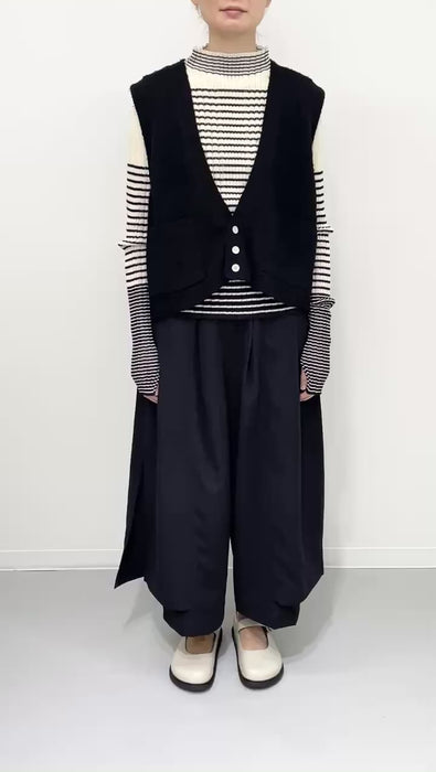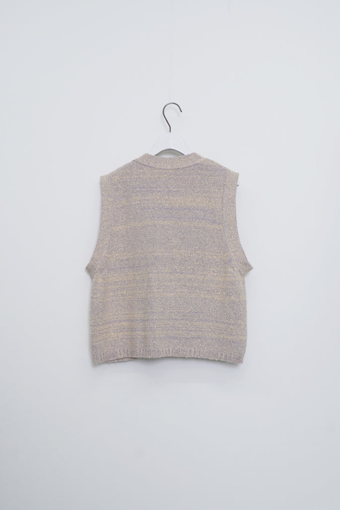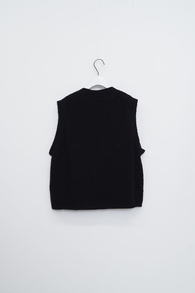 クラシカルなイメージのニットベストです。2つの糸を組み合わせて編んだ素材が特徴的な編み地は天竺の裏使いをしています。コンパクトなボックスシルエット、前身頃にポケットが付いていてデザインのバランスを良くしてます。ロゴ入りの天然のナットボタンを使用してます。