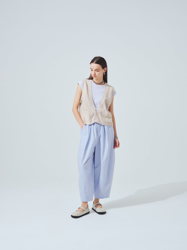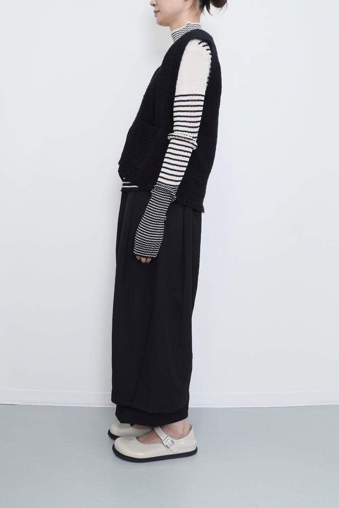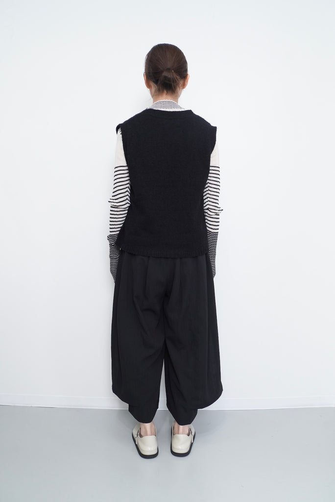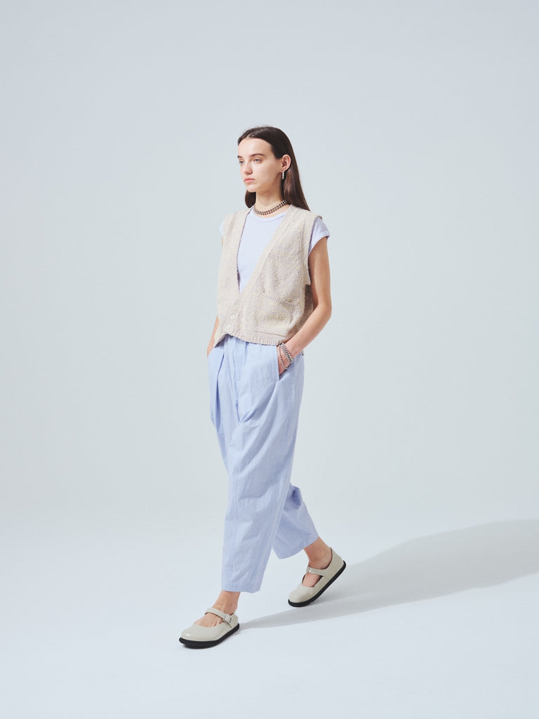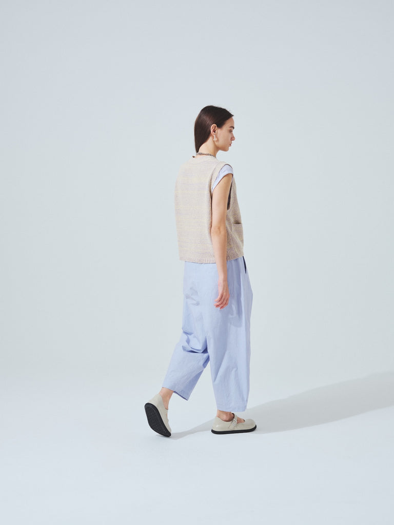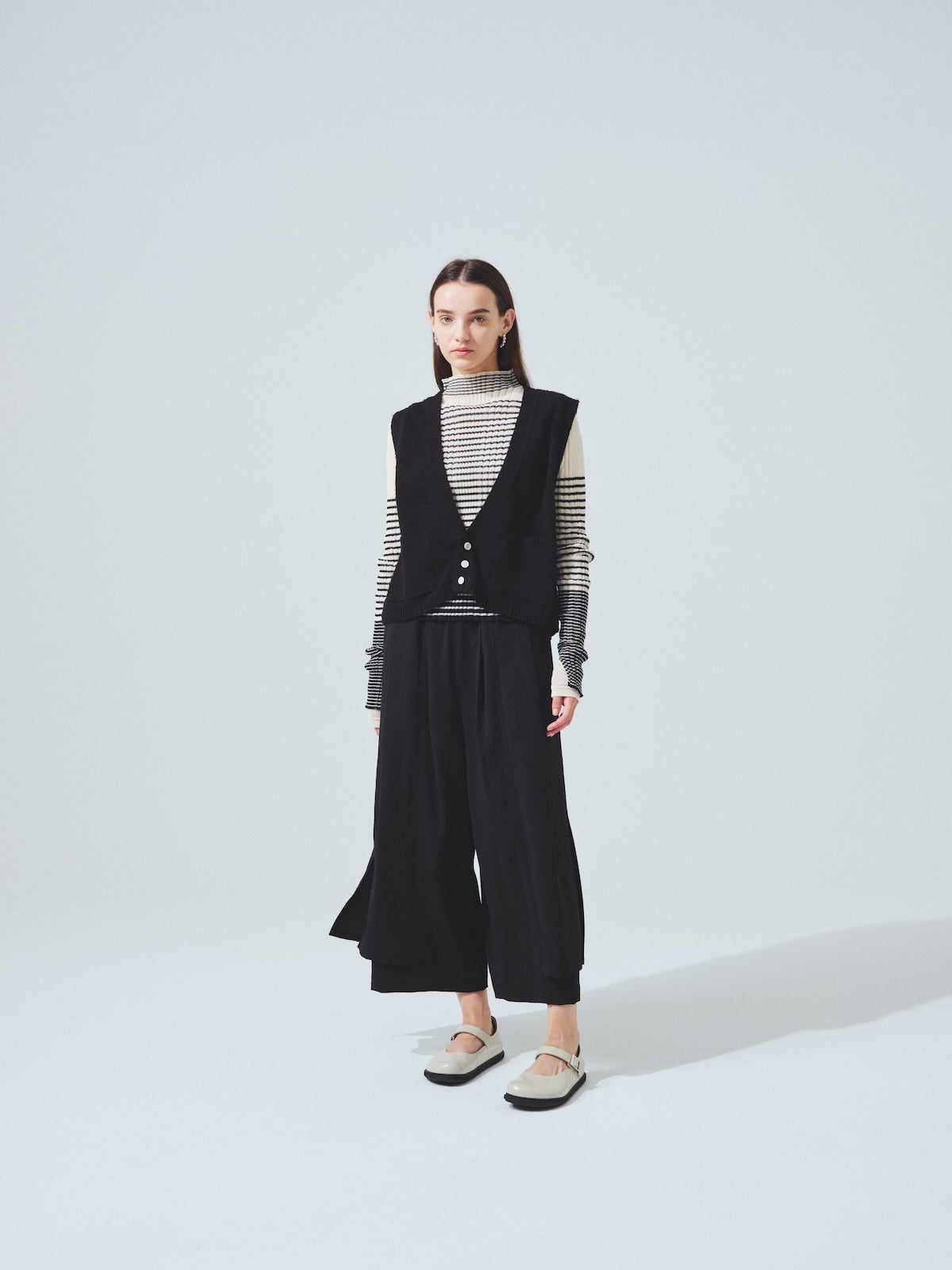 クラシカルなイメージのニットベストです。2つの糸を組み合わせて編んだ素材が特徴的な編み地は天竺の裏使いをしています。コンパクトなボックスシルエット、前身頃にポケットが付いていてデザインのバランスを良くしてます。ロゴ入りの天然のナットボタンを使用してます。