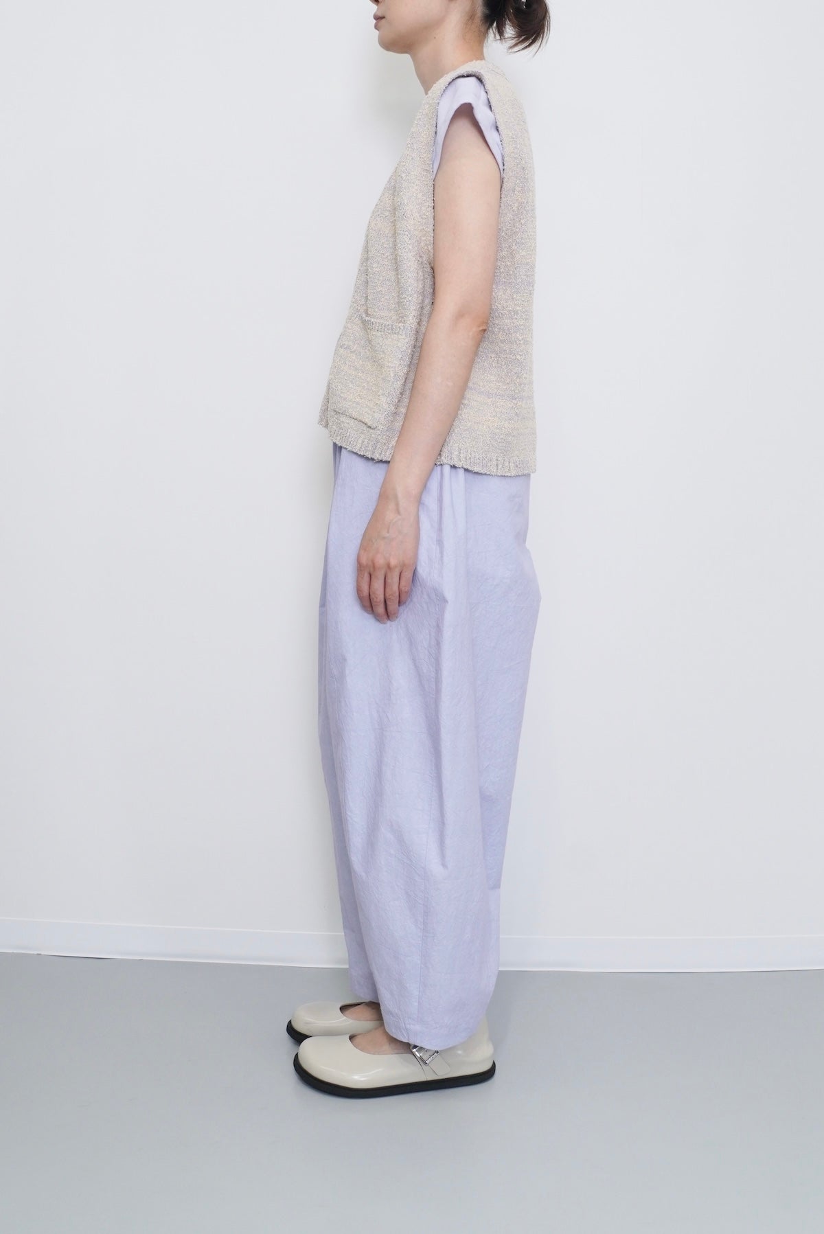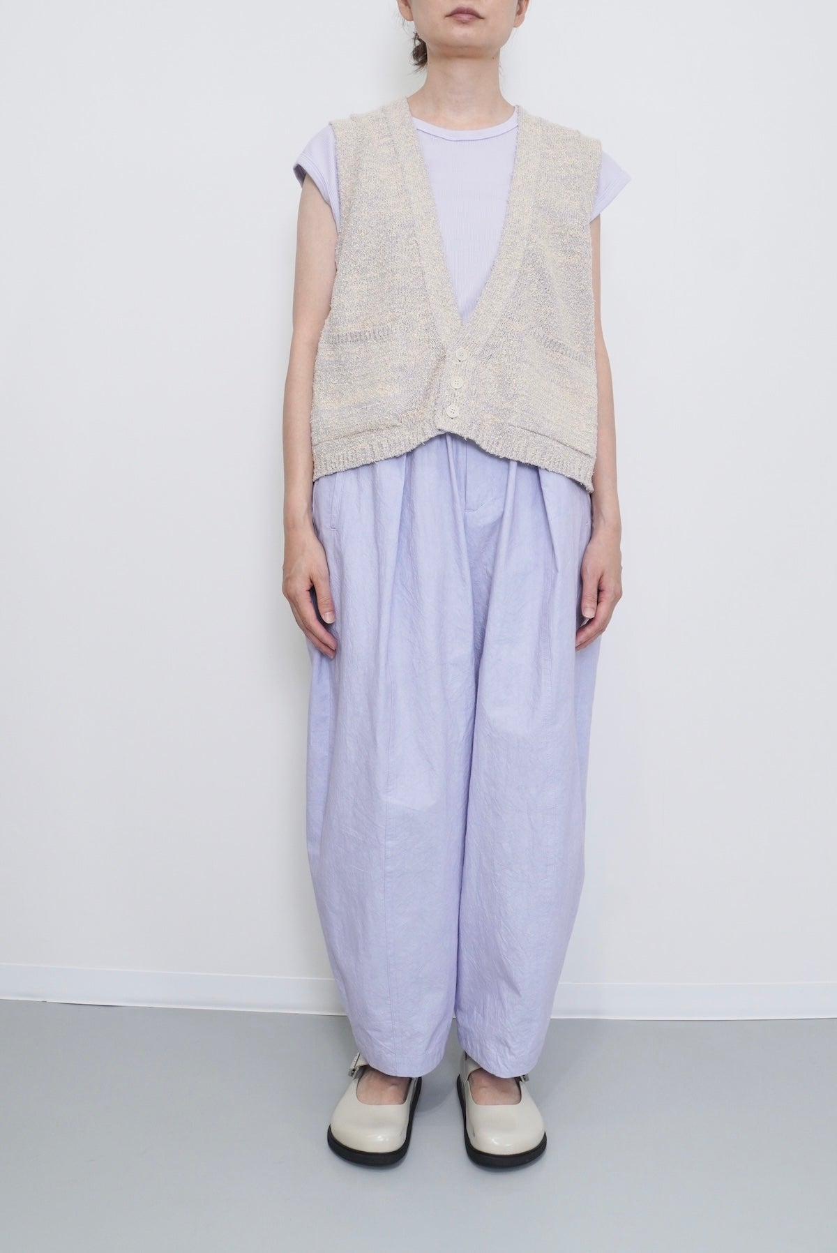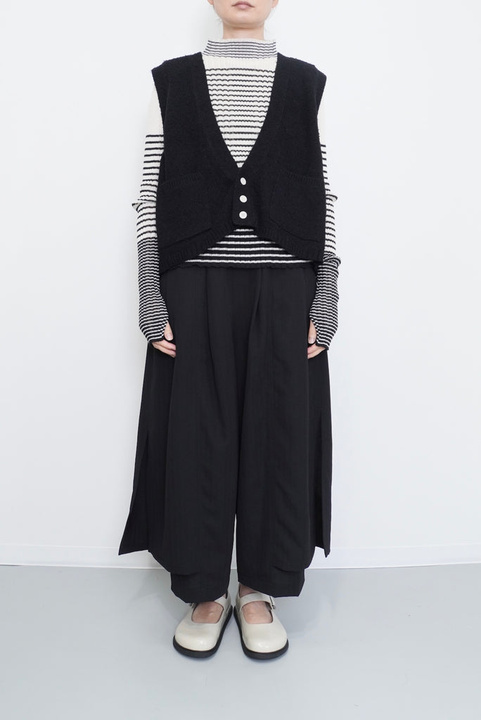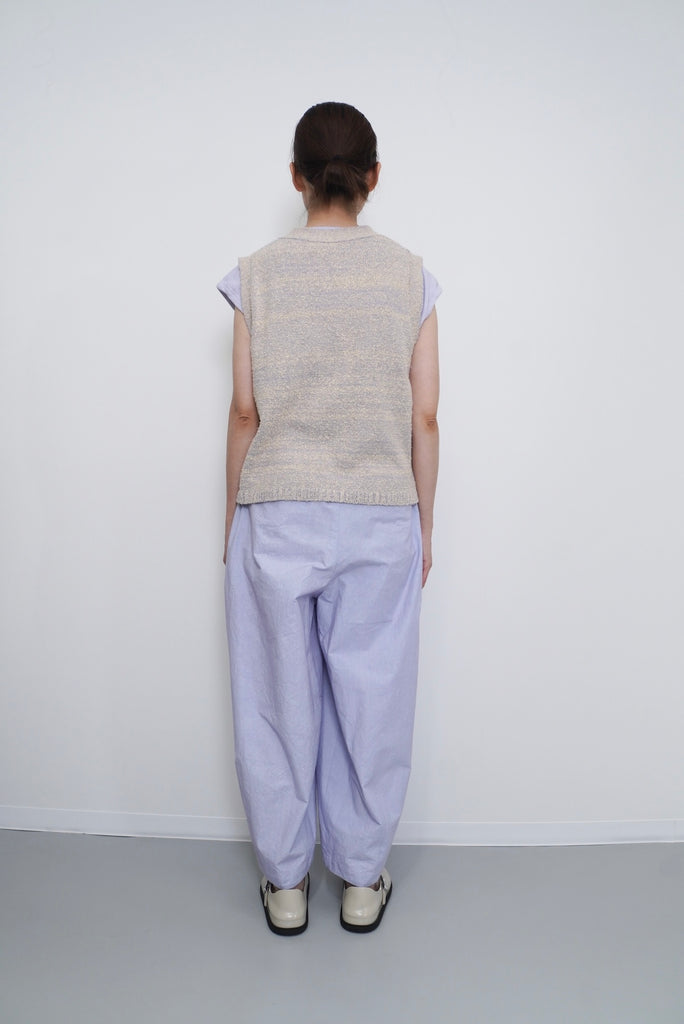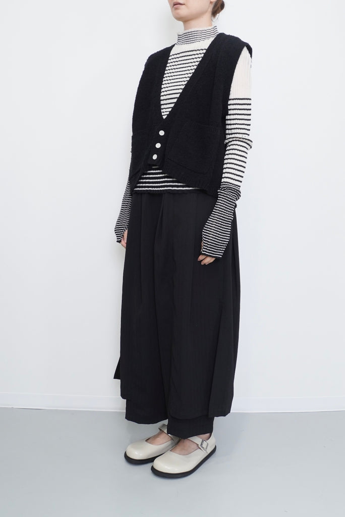 クラシカルなイメージのニットベストです。2つの糸を組み合わせて編んだ素材が特徴的な編み地は天竺の裏使いをしています。コンパクトなボックスシルエット、前身頃にポケットが付いていてデザインのバランスを良くしてます。ロゴ入りの天然のナットボタンを使用してます。