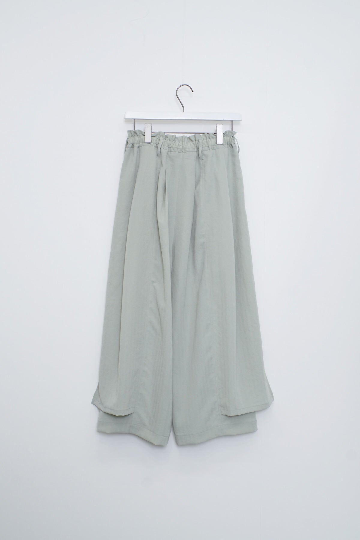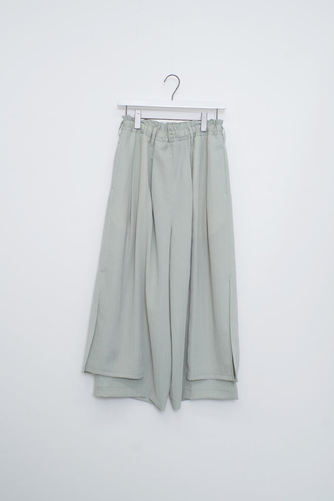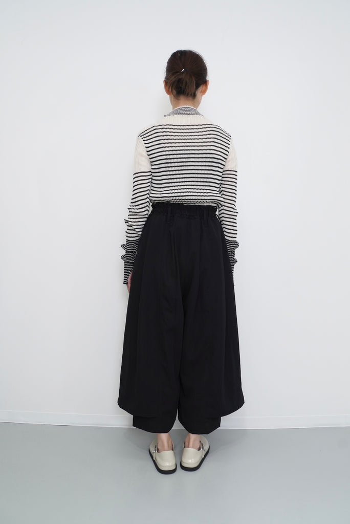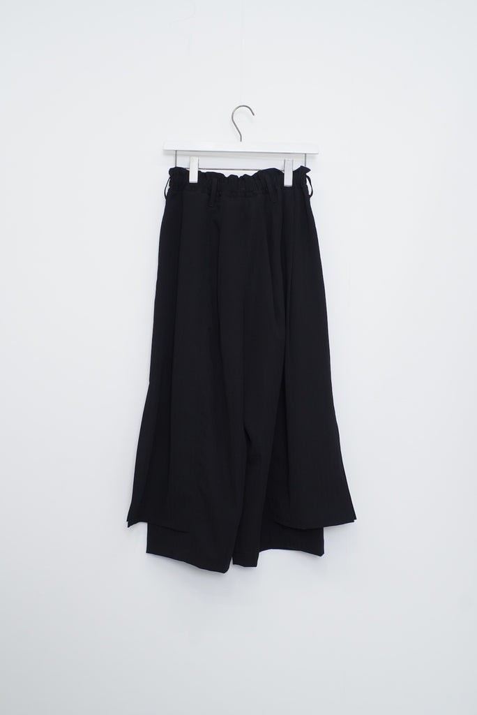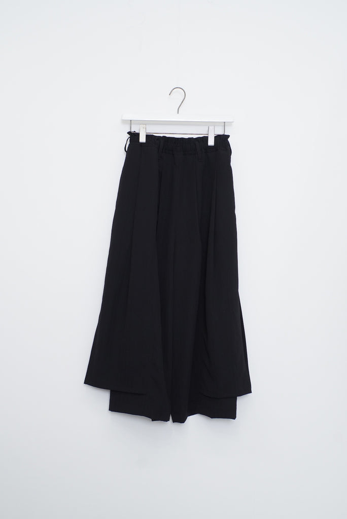 レイヤードシルエットの特徴は、左右の片側がスカートのようにデザインされており、本体のパンツとの段差が独特な立体感と動きを生み出しています。