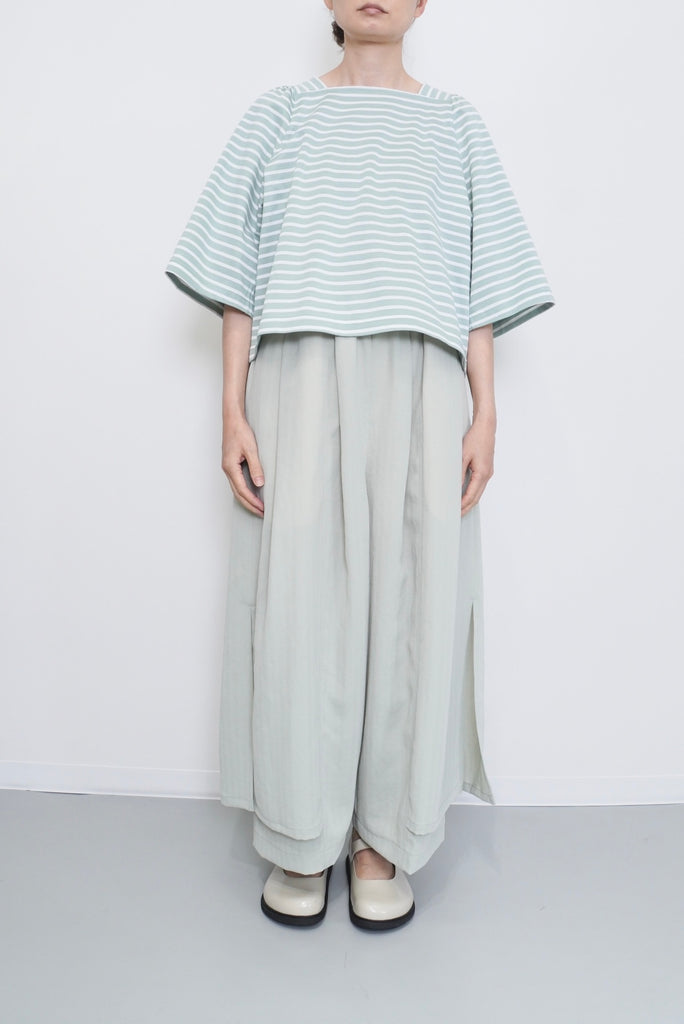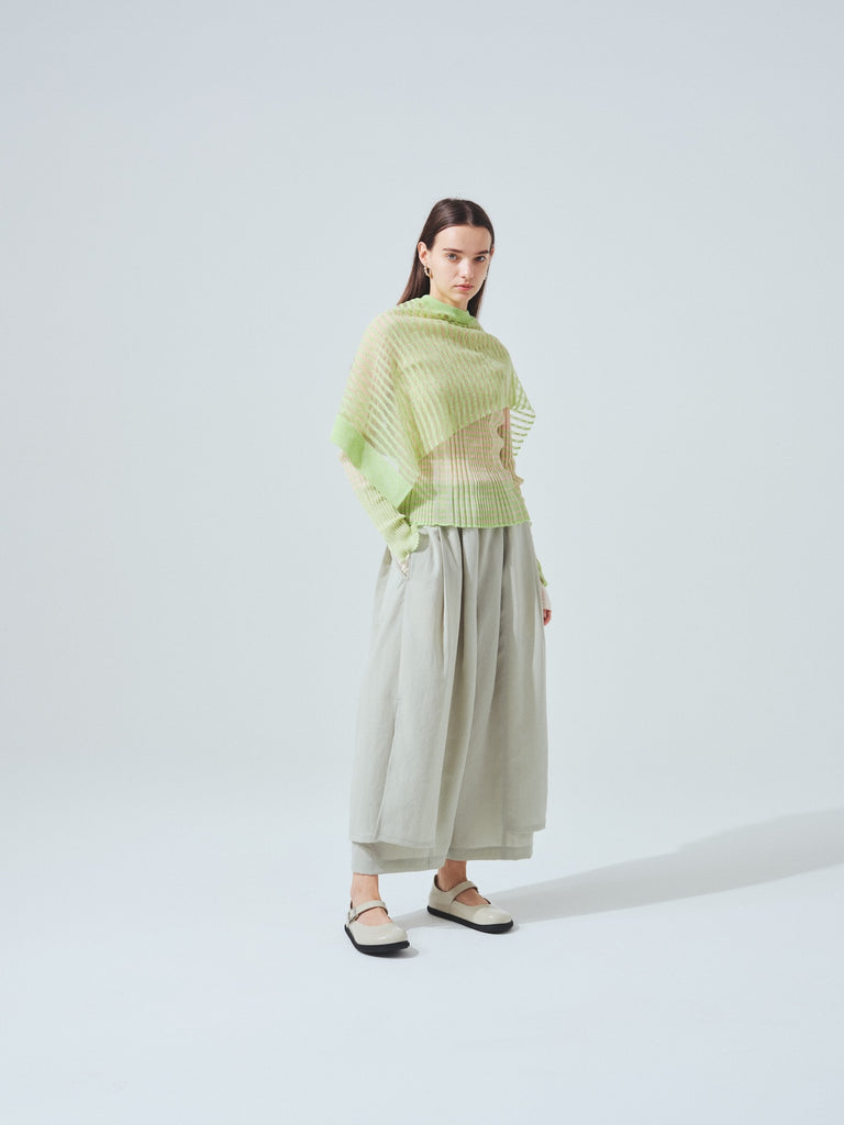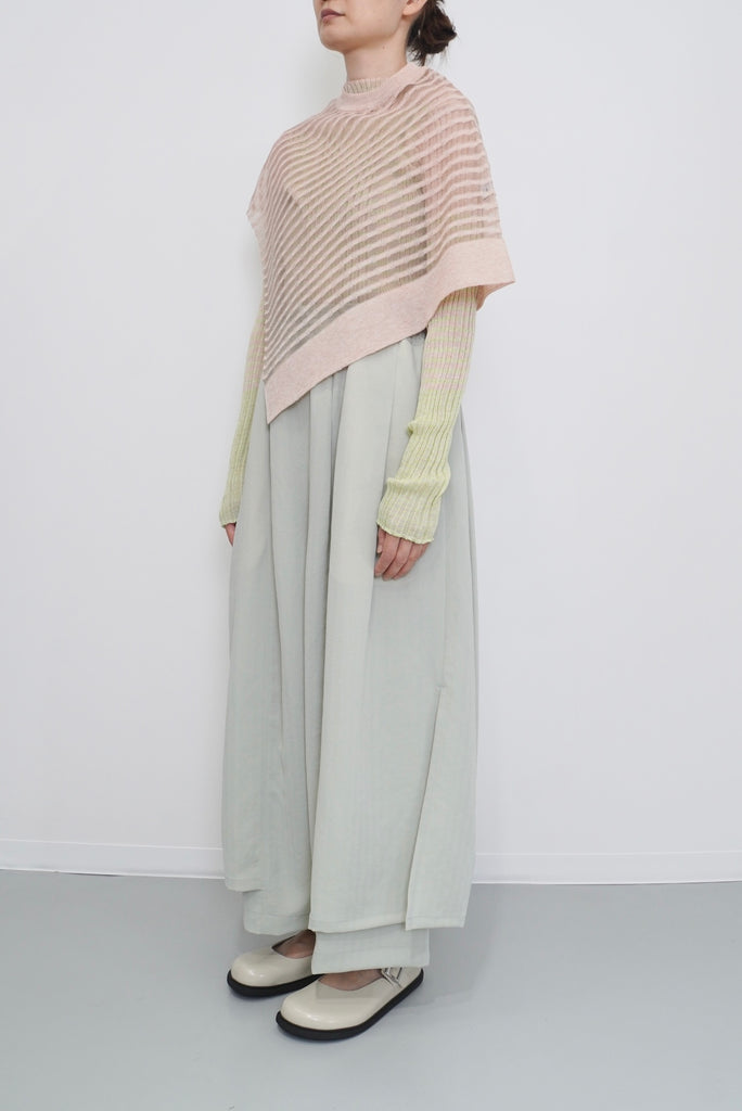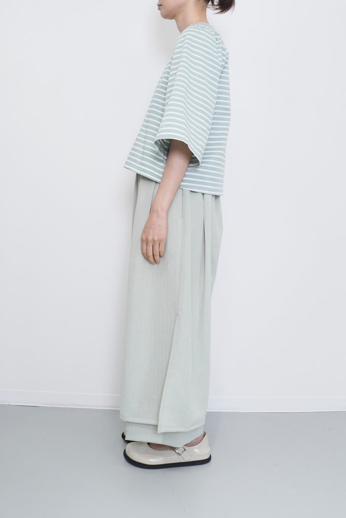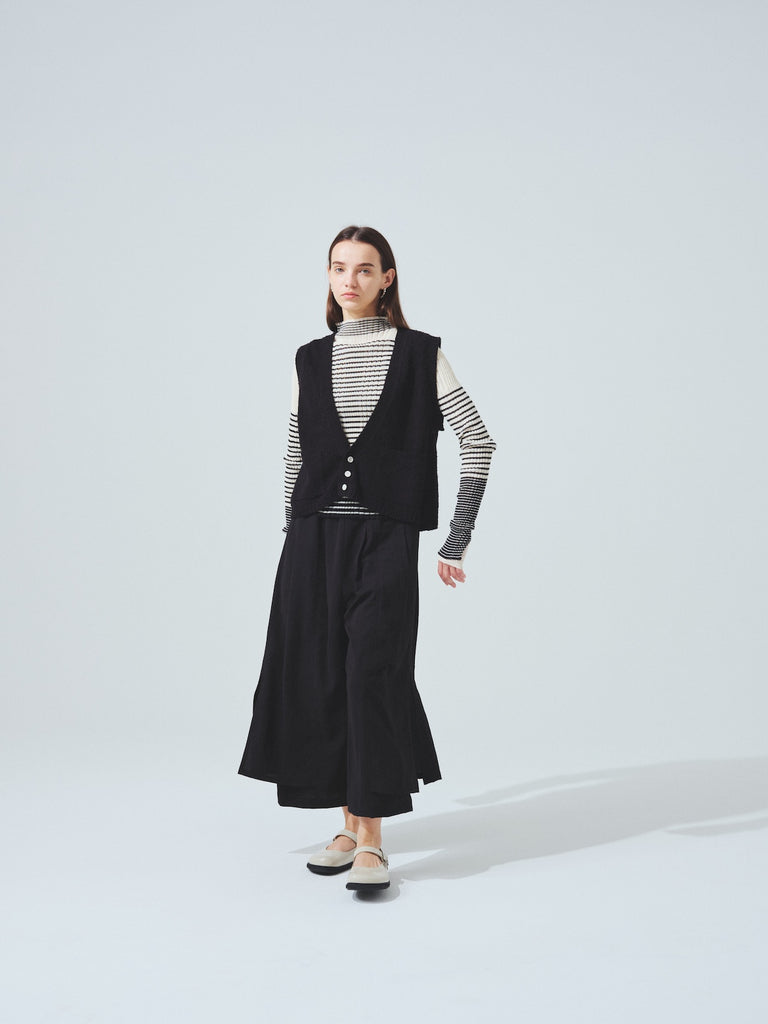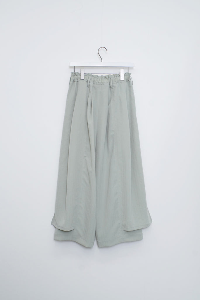 レイヤードシルエットの特徴は、左右の片側がスカートのようにデザインされており、本体のパンツとの段差が独特な立体感と動きを生み出しています。