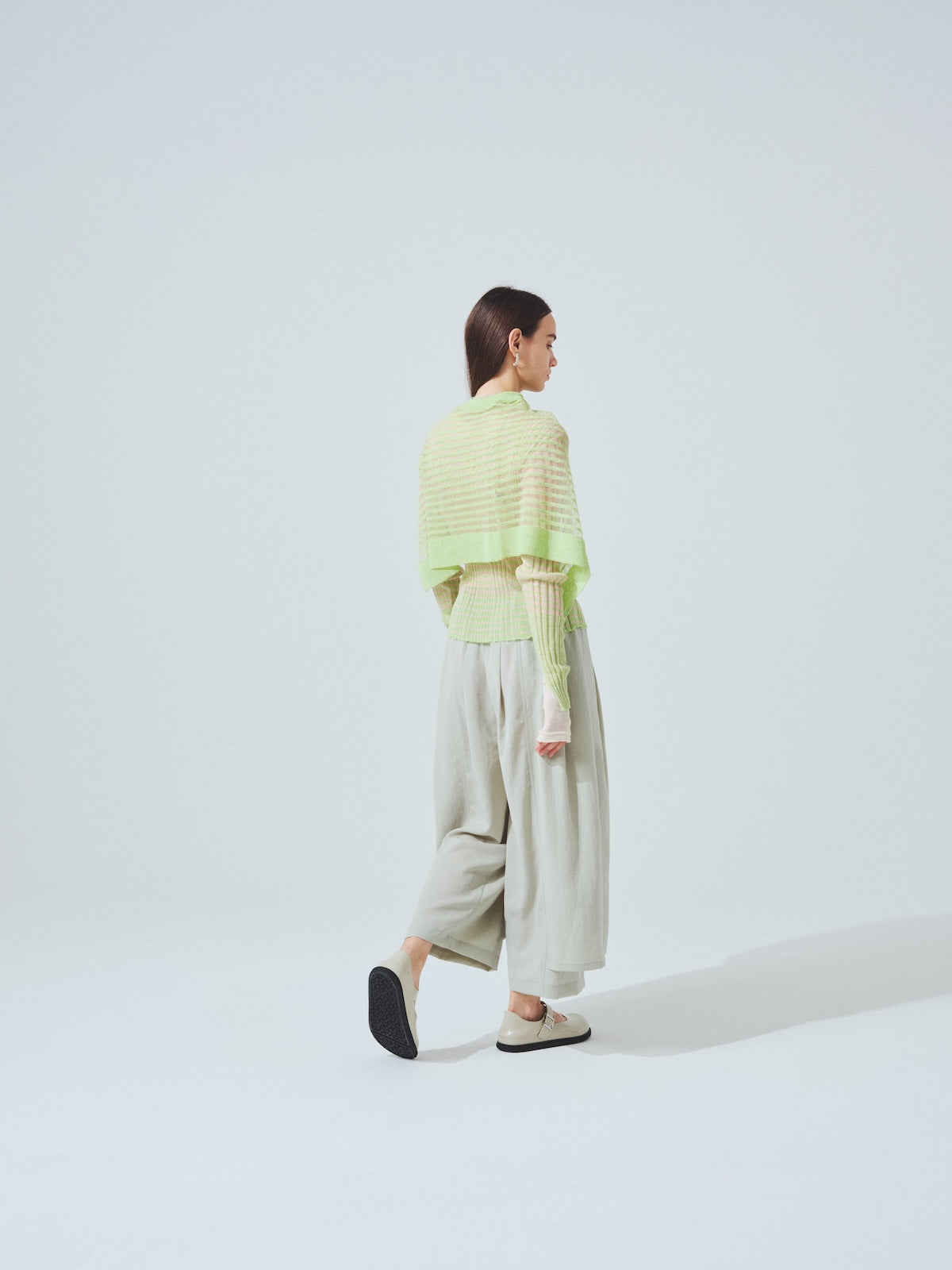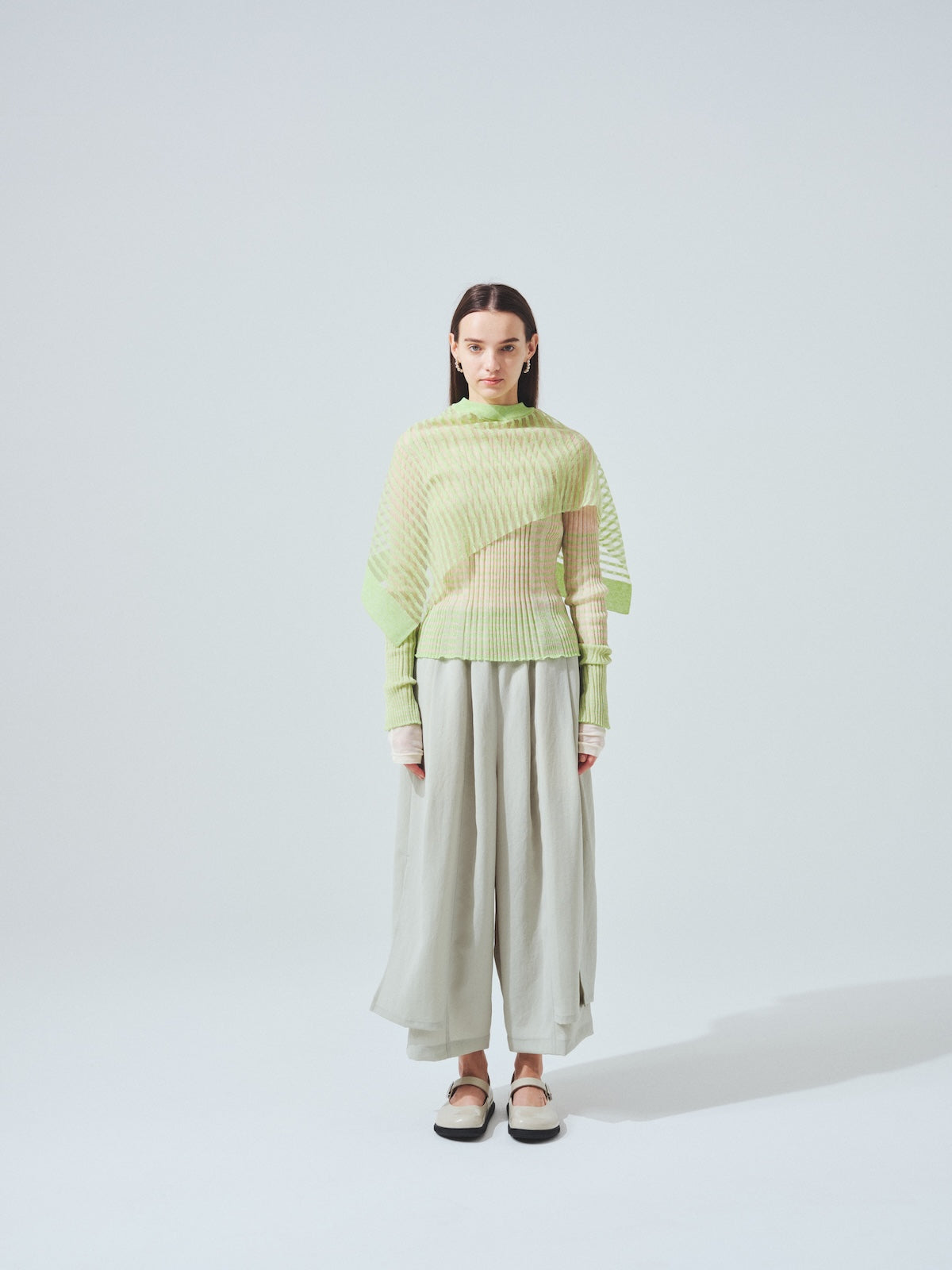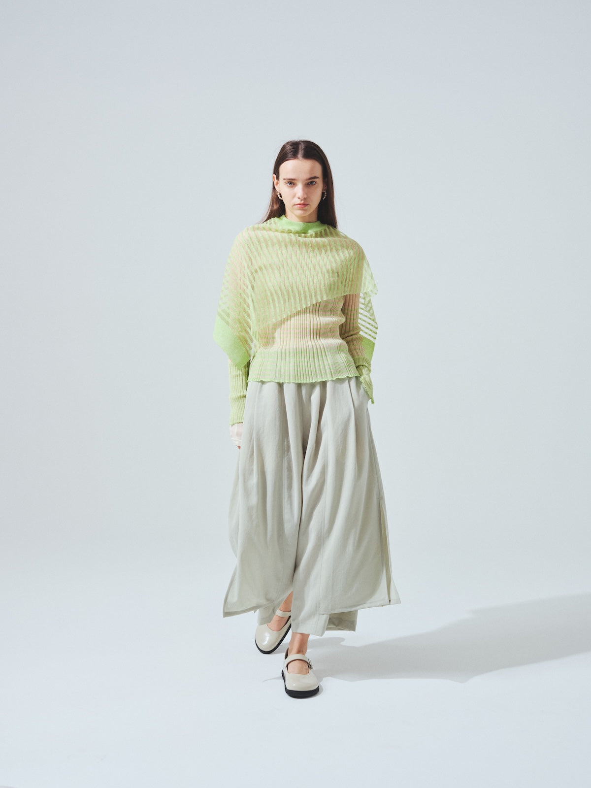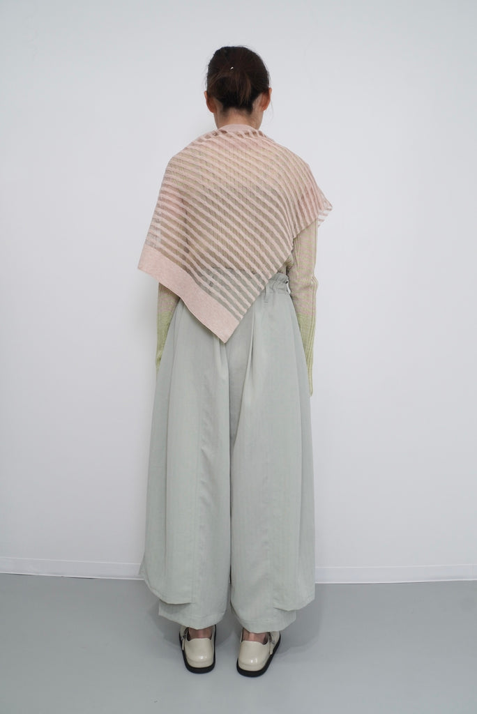 レイヤードシルエットの特徴は、左右の片側がスカートのようにデザインされており、本体のパンツとの段差が独特な立体感と動きを生み出しています。