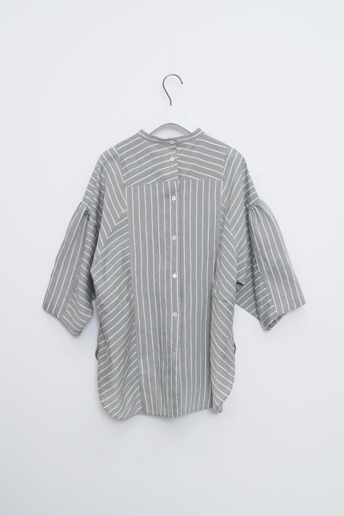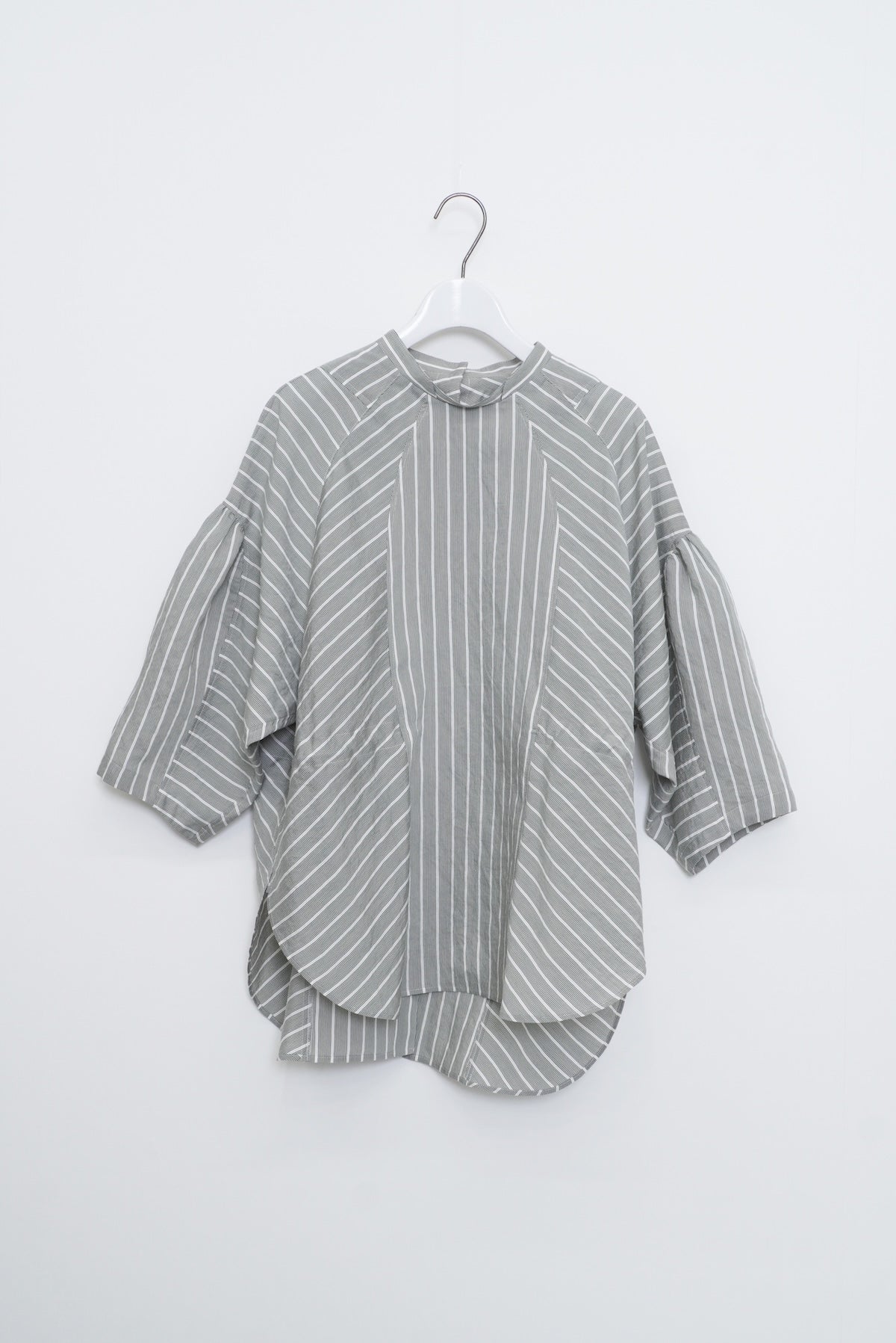 特徴的なスタンドカラーと、タックによって立体的に造形されたコクーンシルエットの袖が印象的。