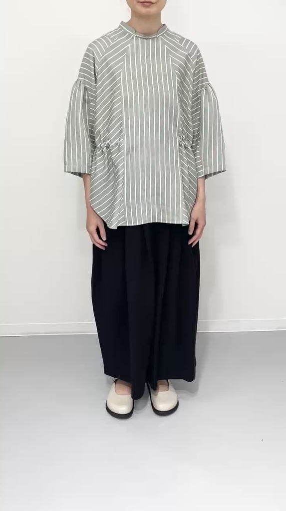 ウエスト内側のドローコードを絞ることでギャザーが生まれ、ウエストラインを細く見せるとともに、スタイリングの変化を楽しめます。