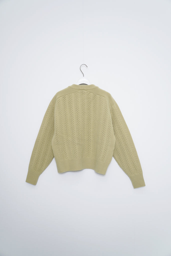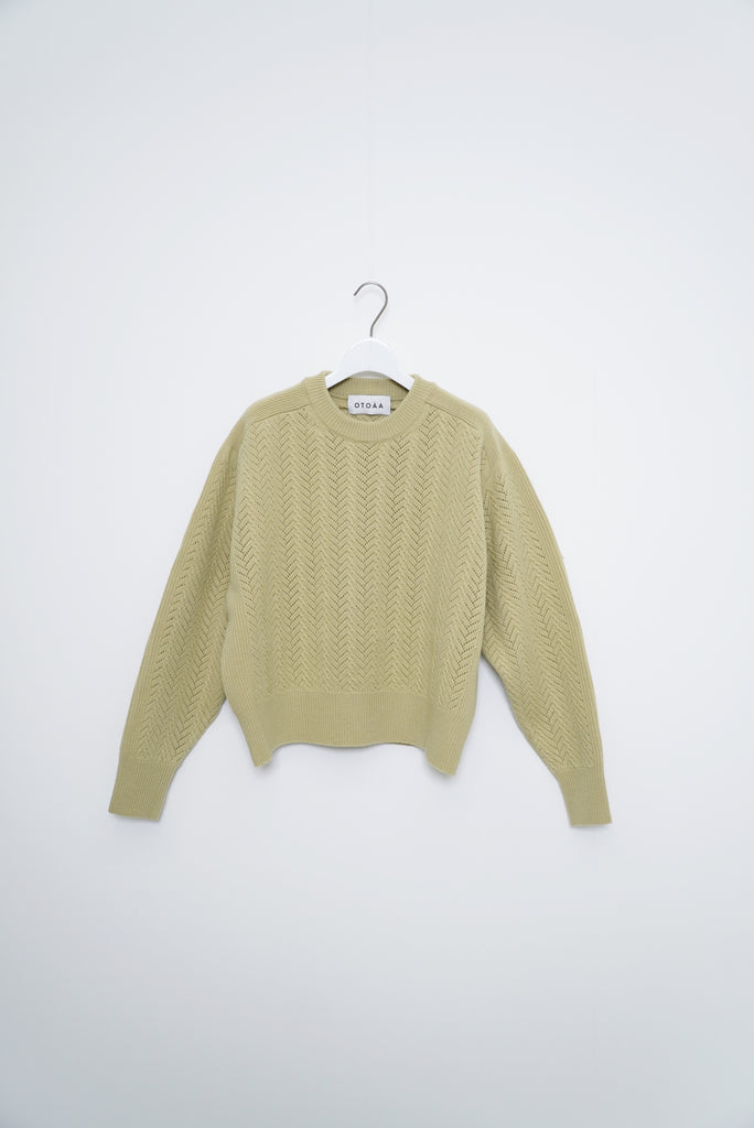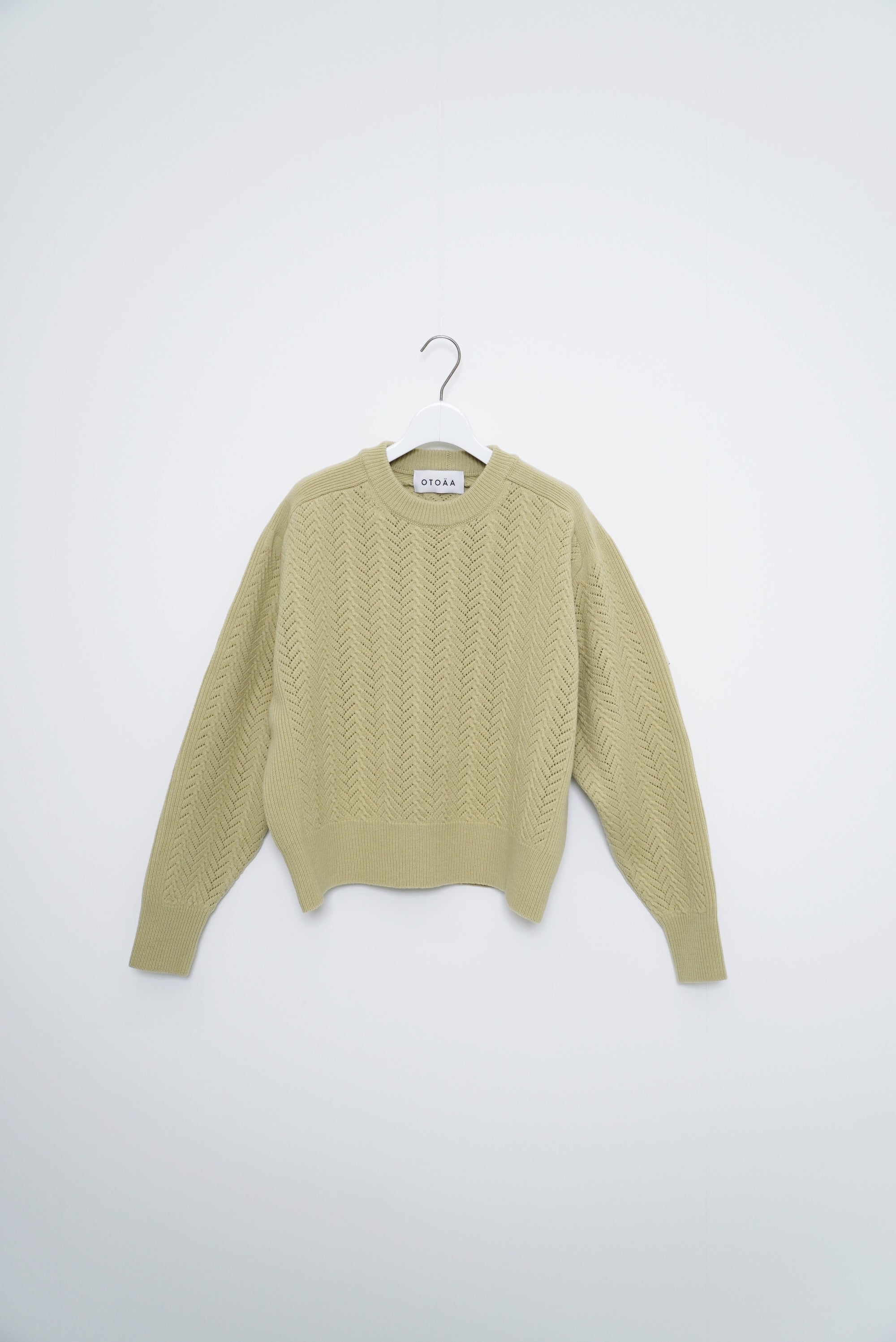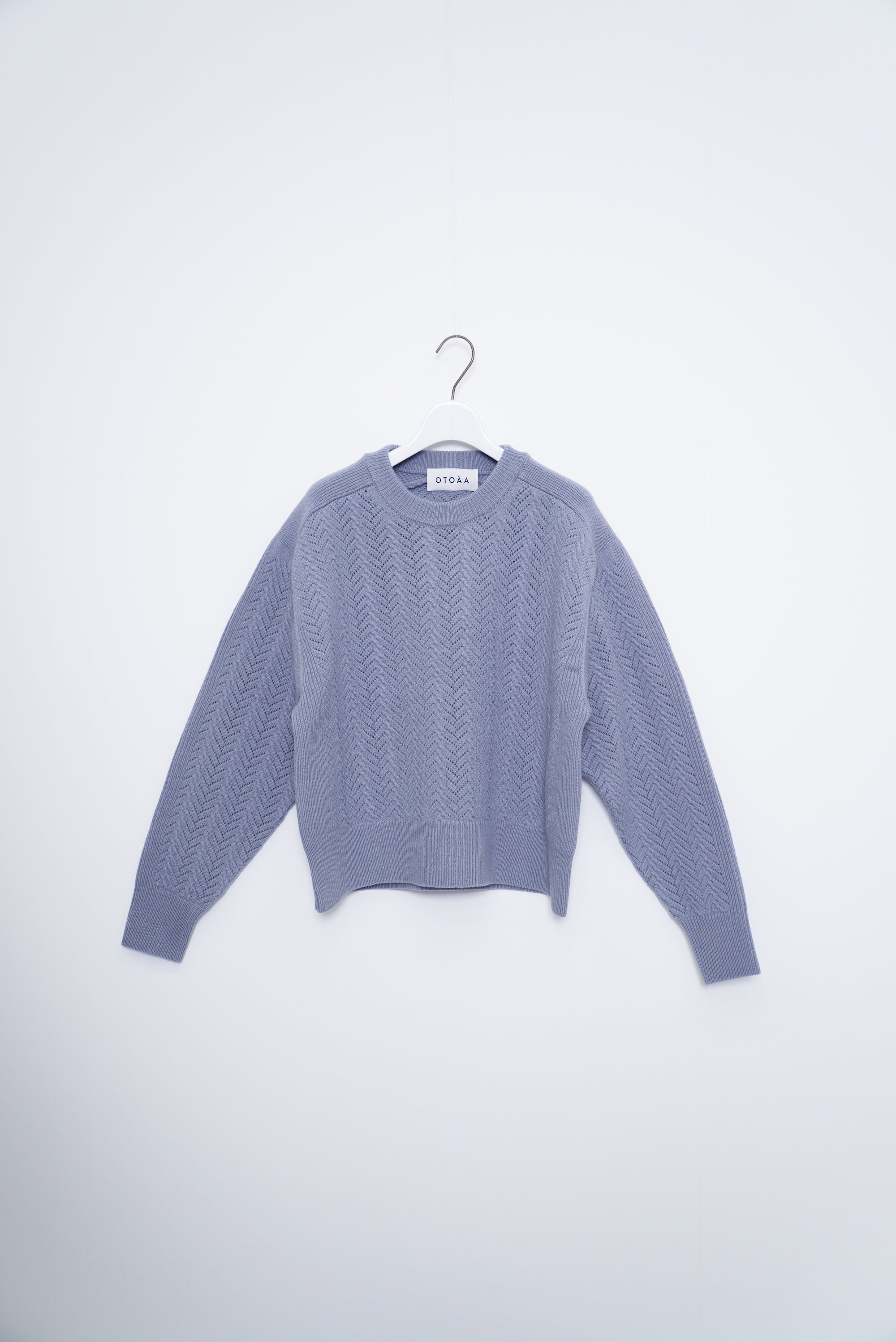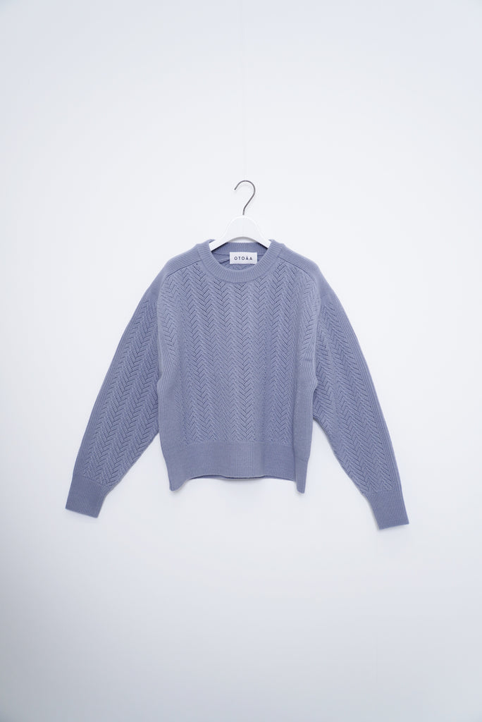 透かし編みのレースヘリンボーン柄が印象的なクルーネックニットプルオーバー。