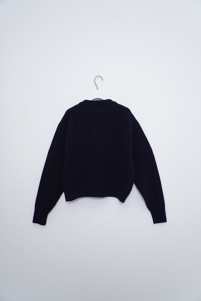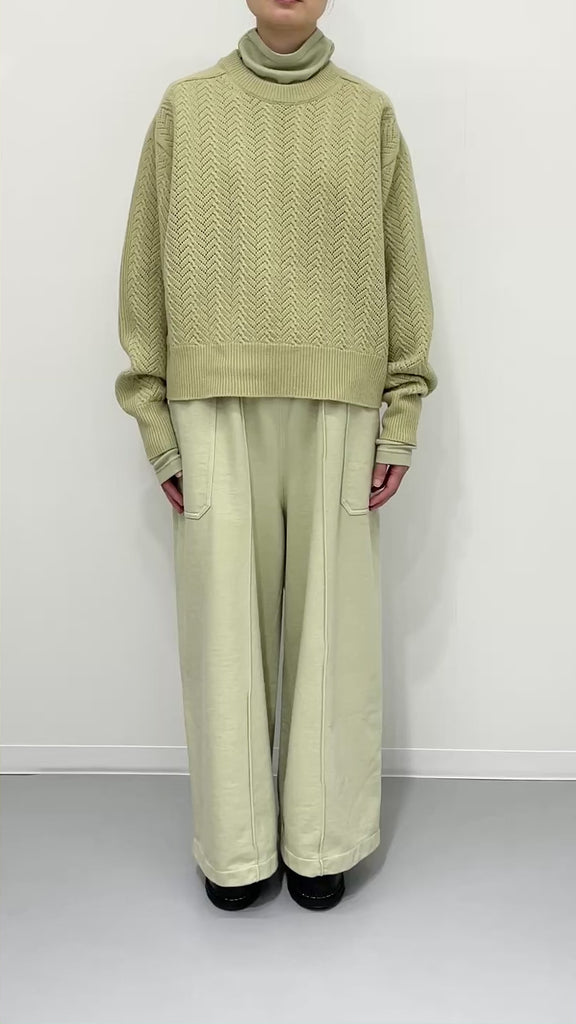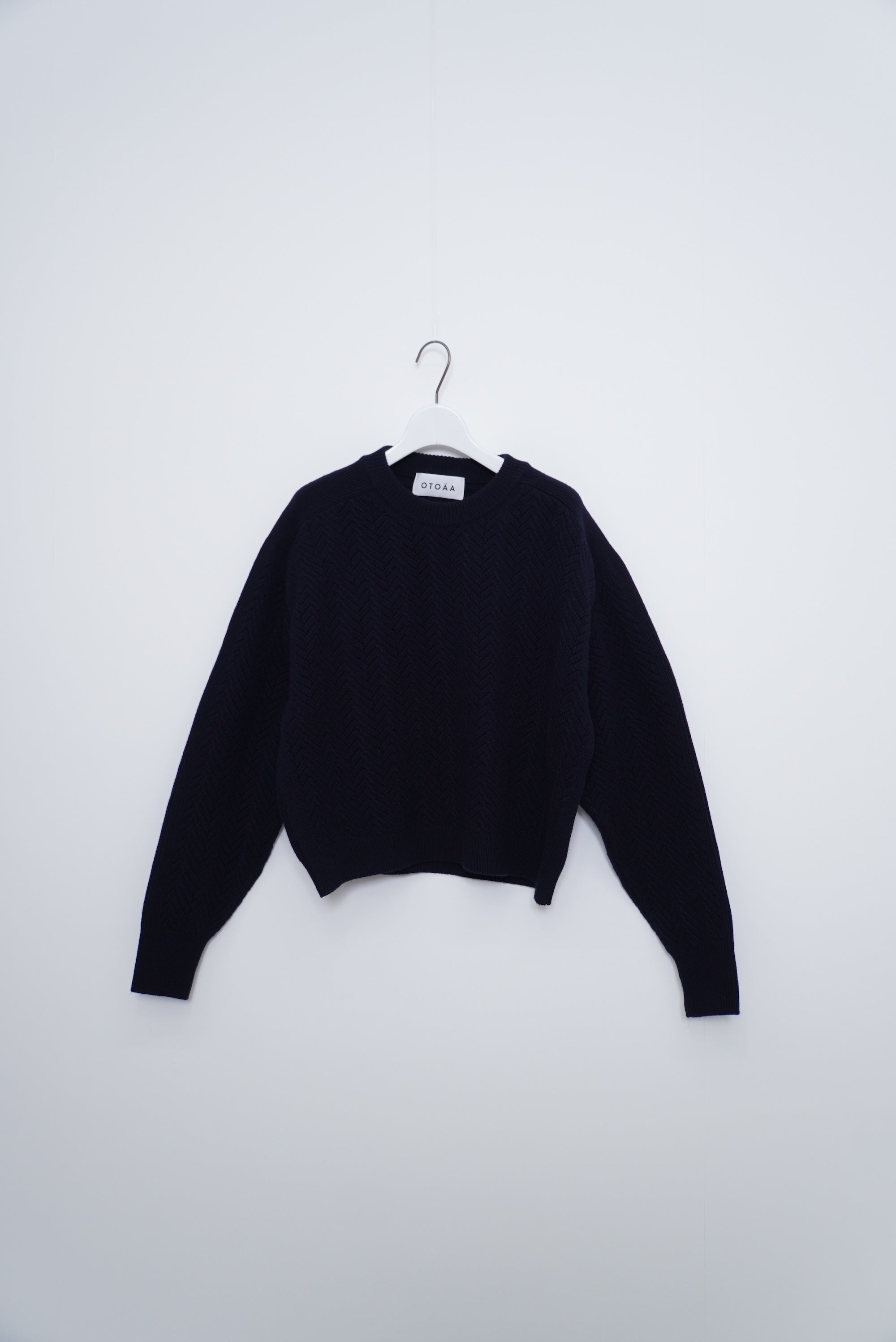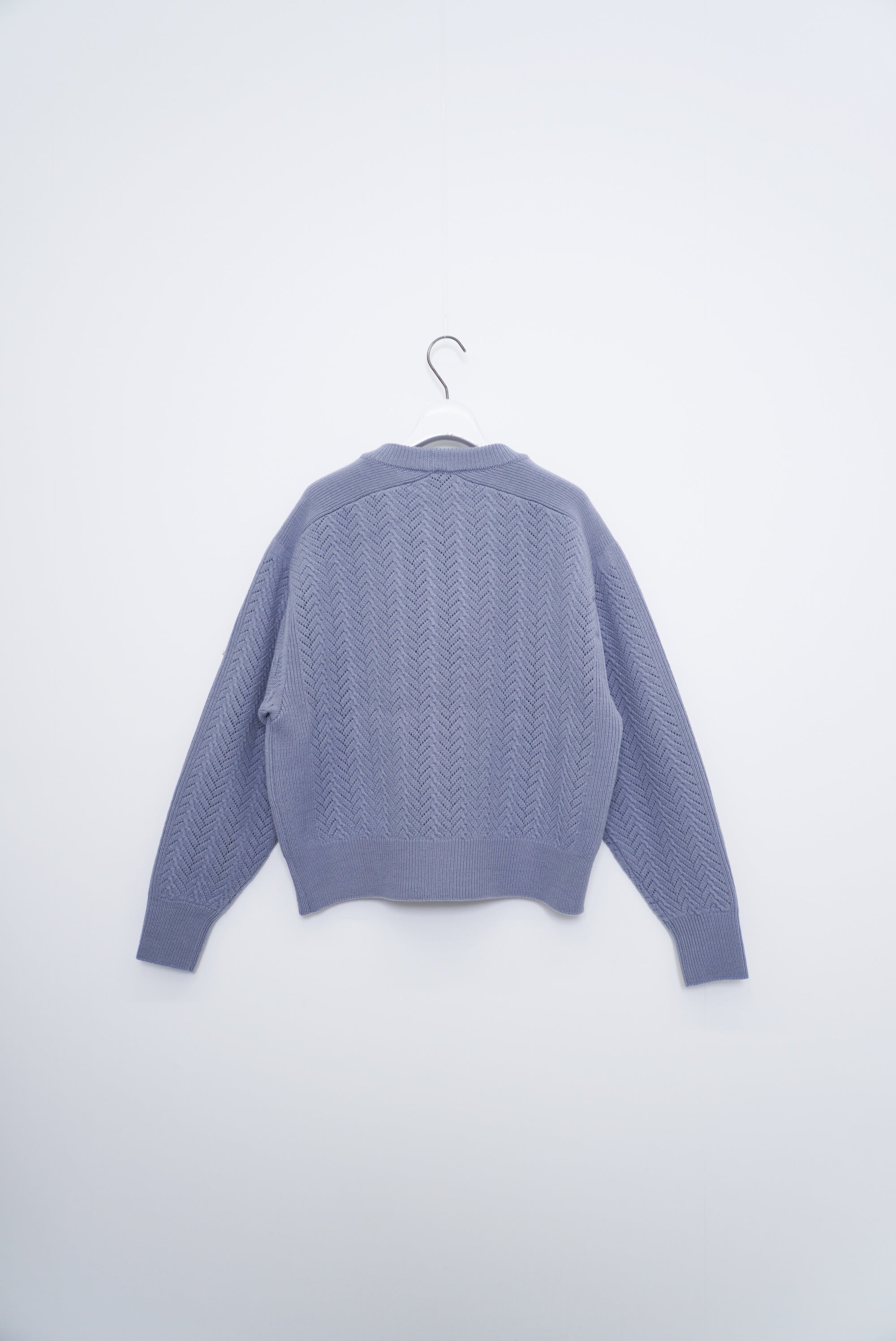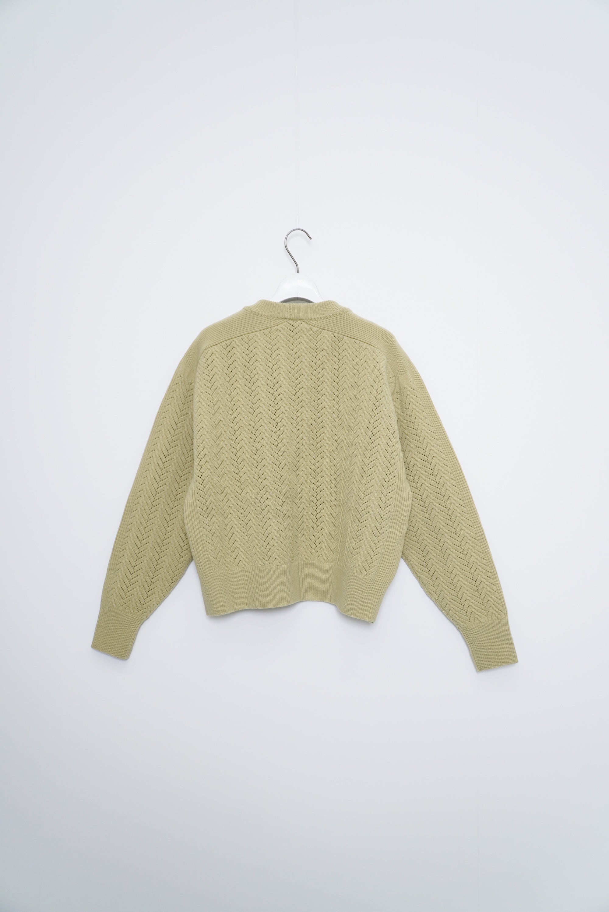 透かし編みのレースヘリンボーン柄が印象的なクルーネックニットプルオーバー。