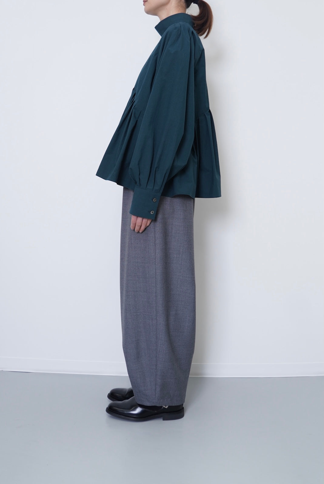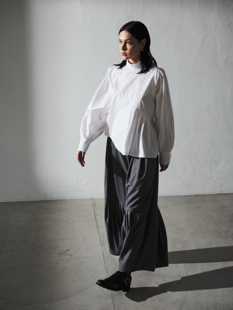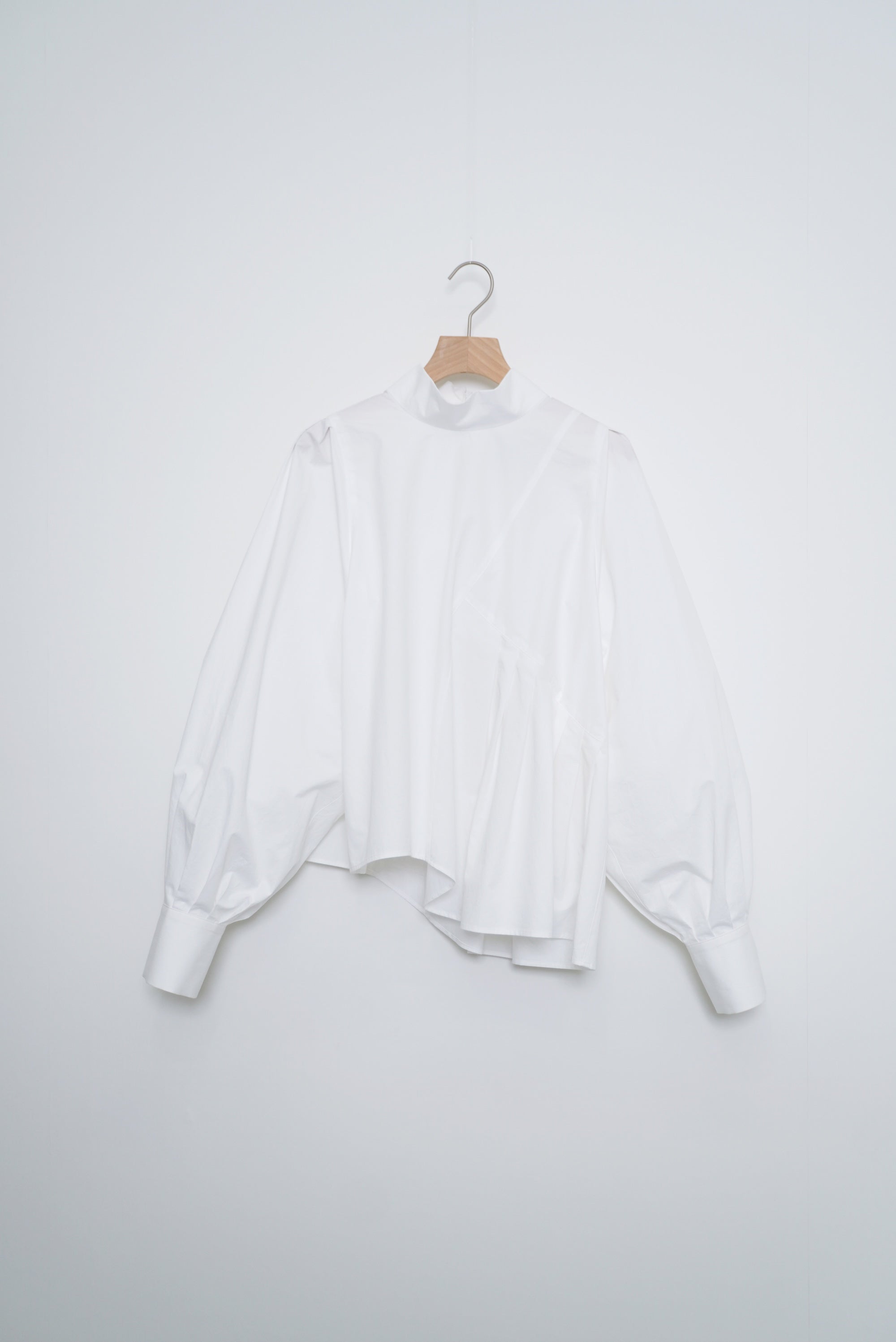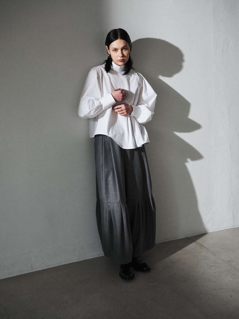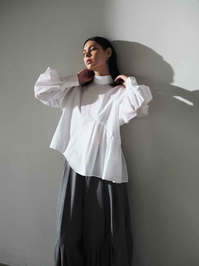 このデザインは、ハイネックで首元をすっきりと見せ、肩幅をコンパクトに設計して華奢な印象を演出しています。一方で、アームと身頃にはゆったりとしたサイズ感を持たせており、リラックスした着心地を実現しました。