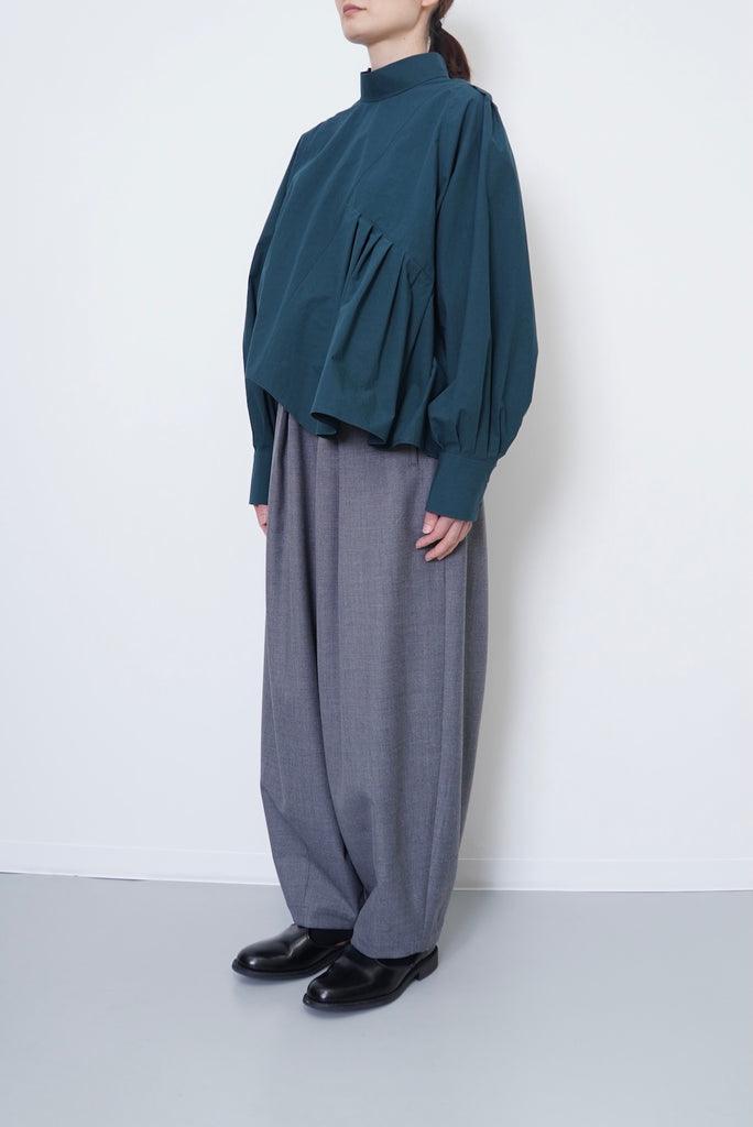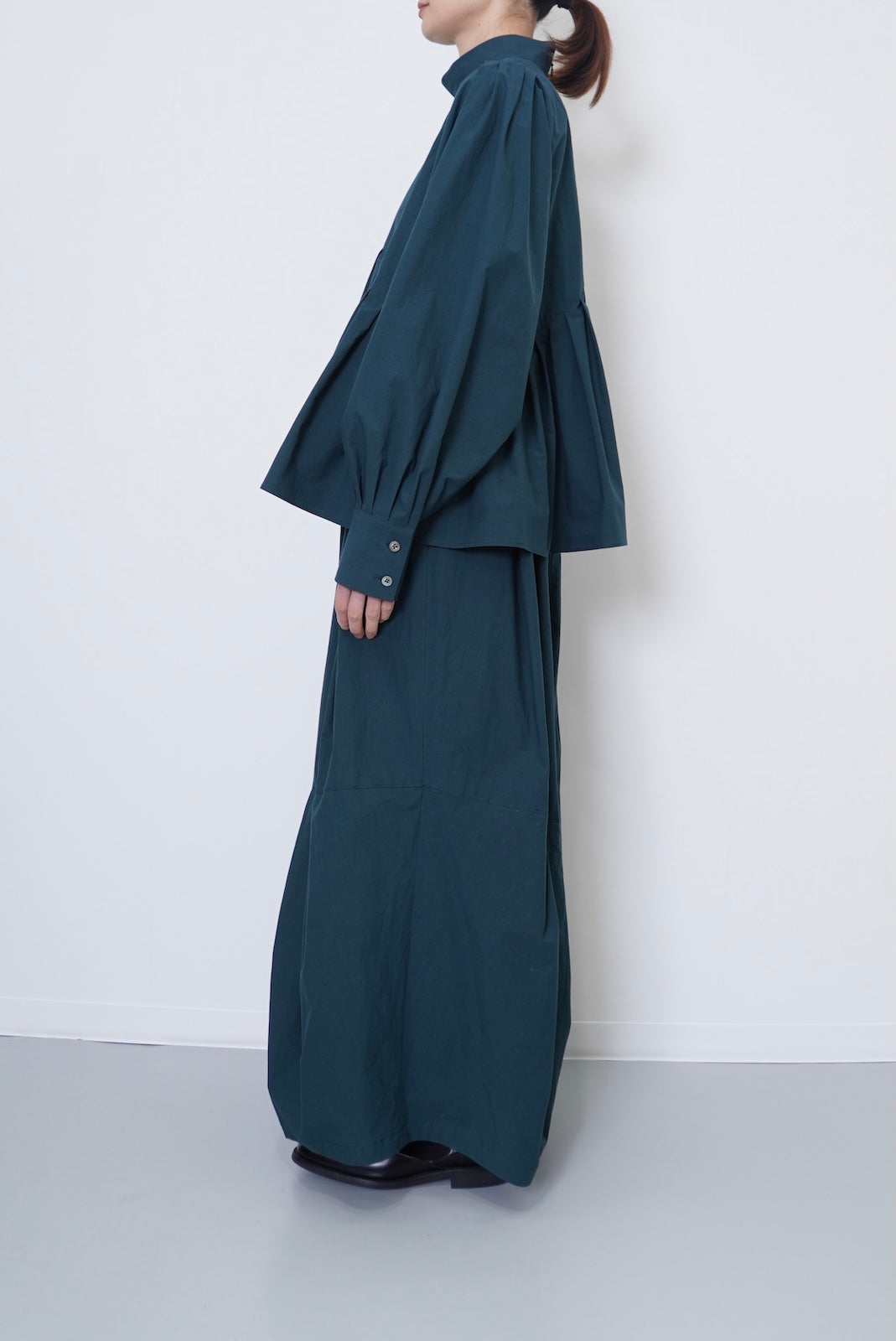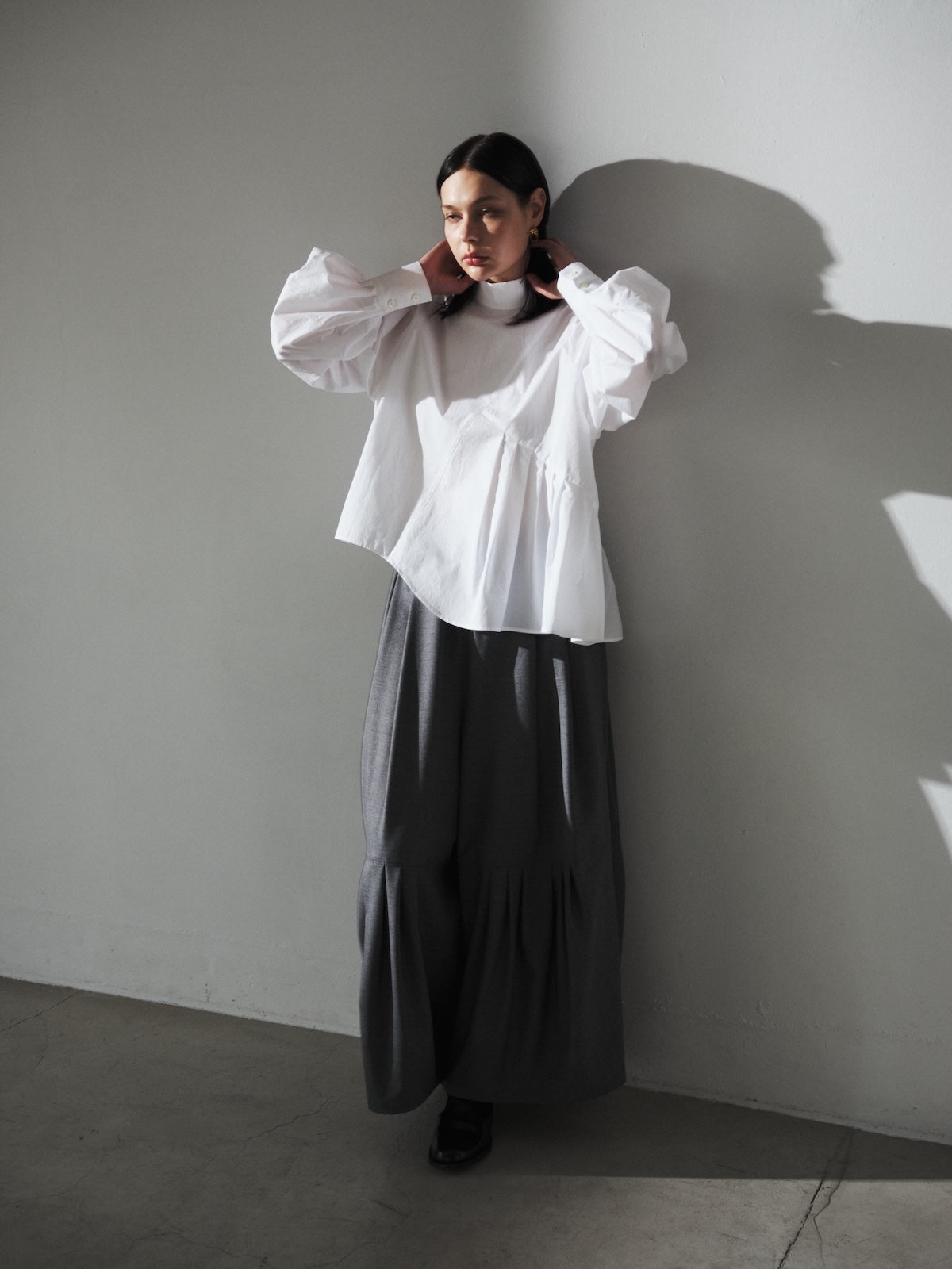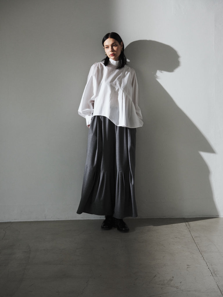 このデザインは、ハイネックで首元をすっきりと見せ、肩幅をコンパクトに設計して華奢な印象を演出しています。一方で、アームと身頃にはゆったりとしたサイズ感を持たせており、リラックスした着心地を実現しました。