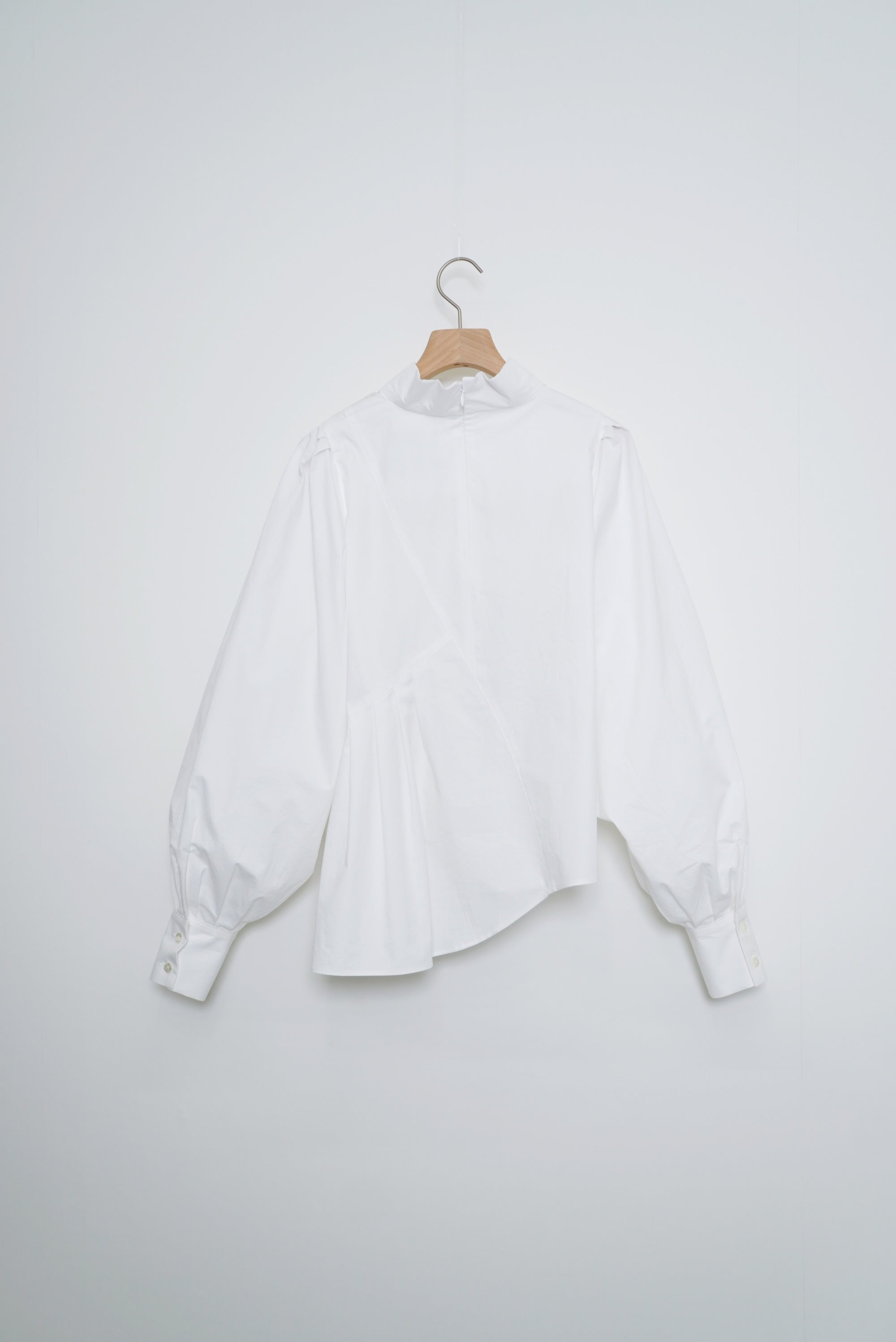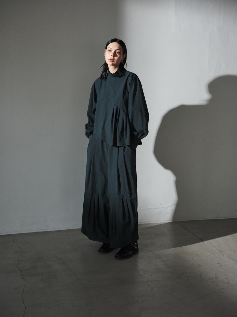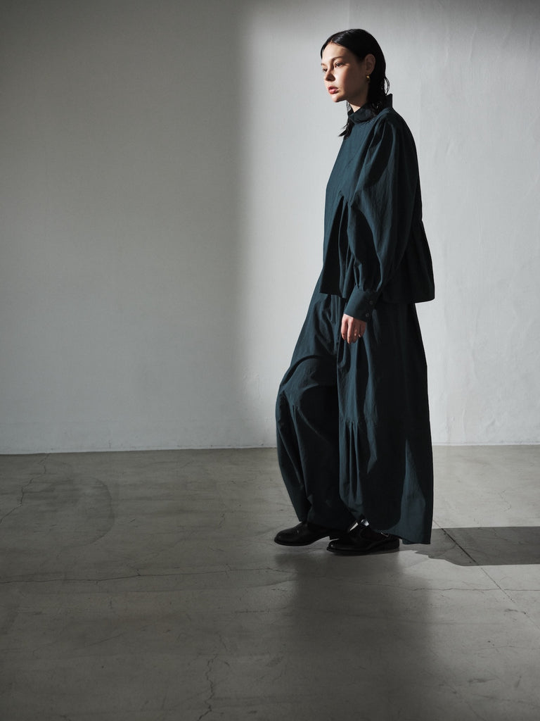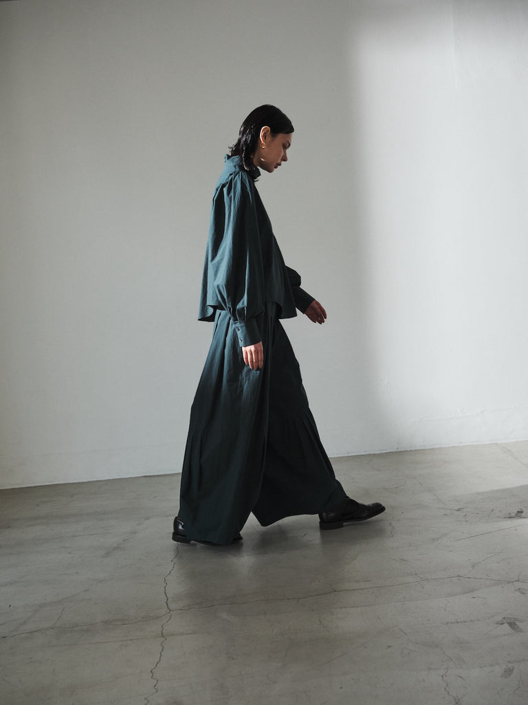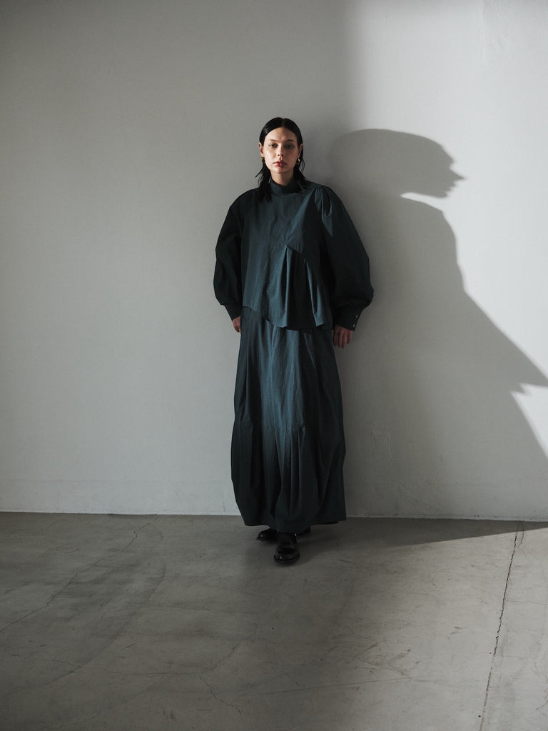 フロントデザインの左肩から裾へ流れる美しい切線はアシンメトリーなデザインになっております。左身頃のウエストのタックは裾に向かってAラインになっており、体型を美しくカバーします。背面にはコンシールファスナーを使用し、すっきりとした後ろ開きです。また、袖口には共生地のくるみボタンを使用しております。身体と衣服の間に程よい空間を持たせたデザインフィロソフィーを反映し、スタイルと快適さのバランスを追求した一着です。