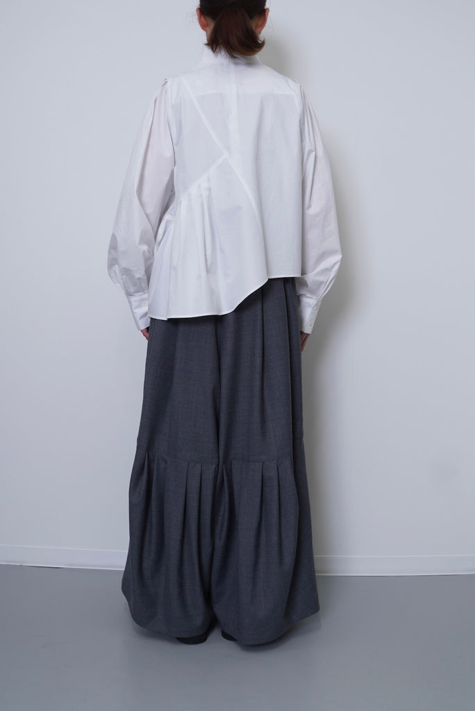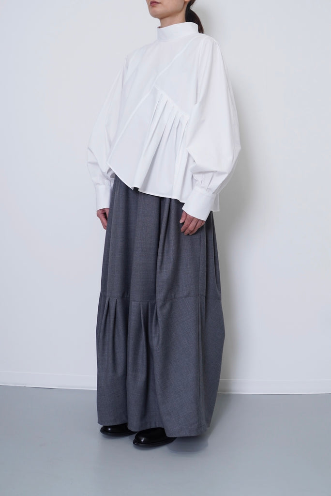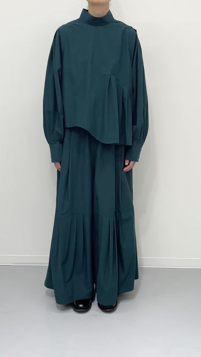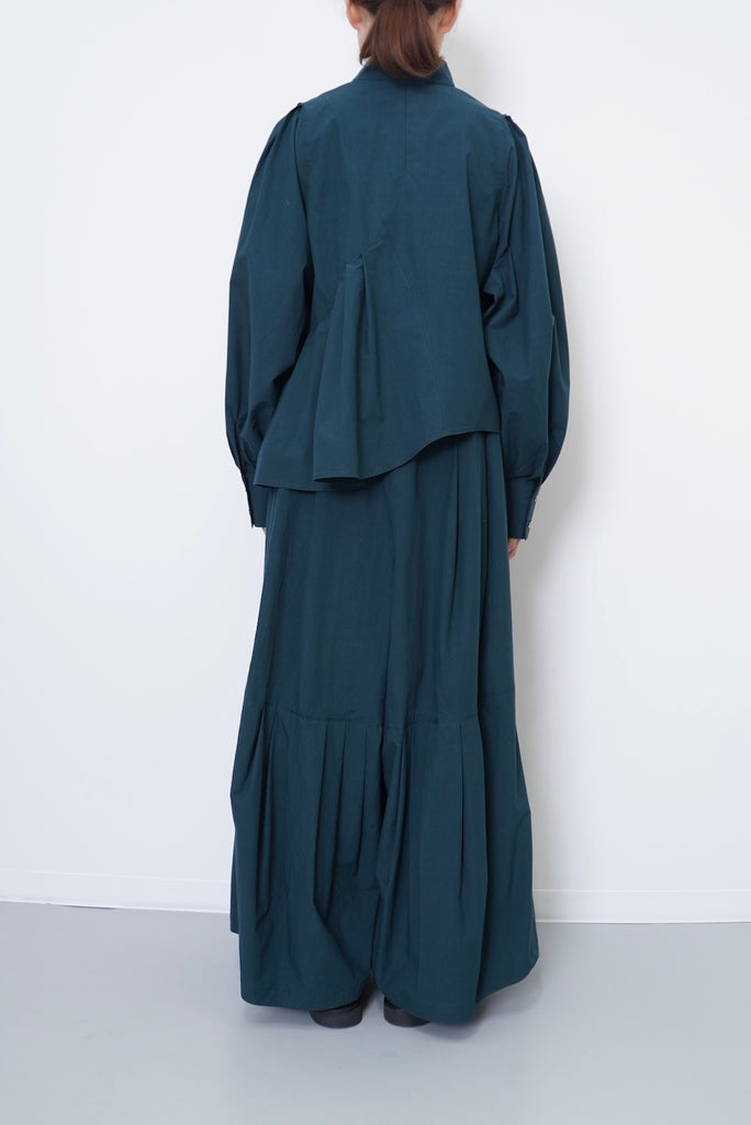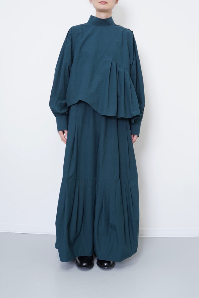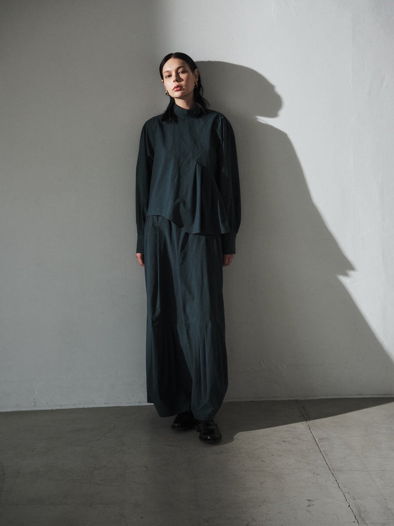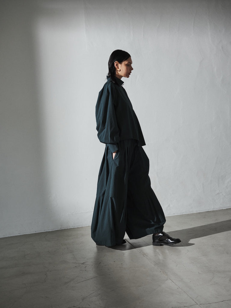 フロントデザインの左肩から裾へ流れる美しい切線はアシンメトリーなデザインになっております。左身頃のウエストのタックは裾に向かってAラインになっており、体型を美しくカバーします。背面にはコンシールファスナーを使用し、すっきりとした後ろ開きです。また、袖口には共生地のくるみボタンを使用しております。身体と衣服の間に程よい空間を持たせたデザインフィロソフィーを反映し、スタイルと快適さのバランスを追求した一着です。