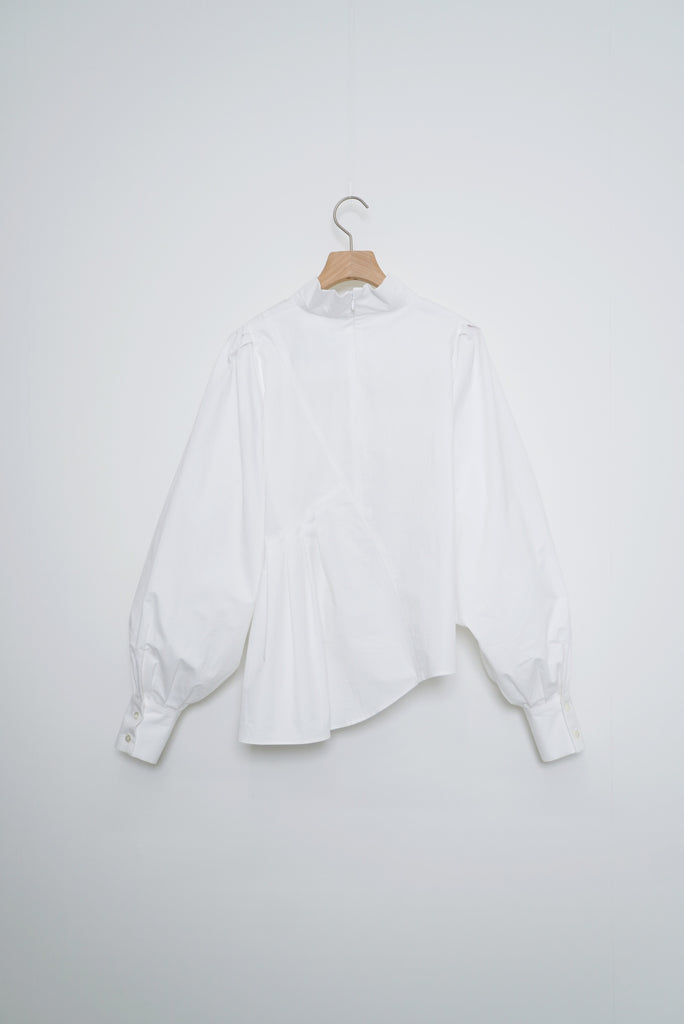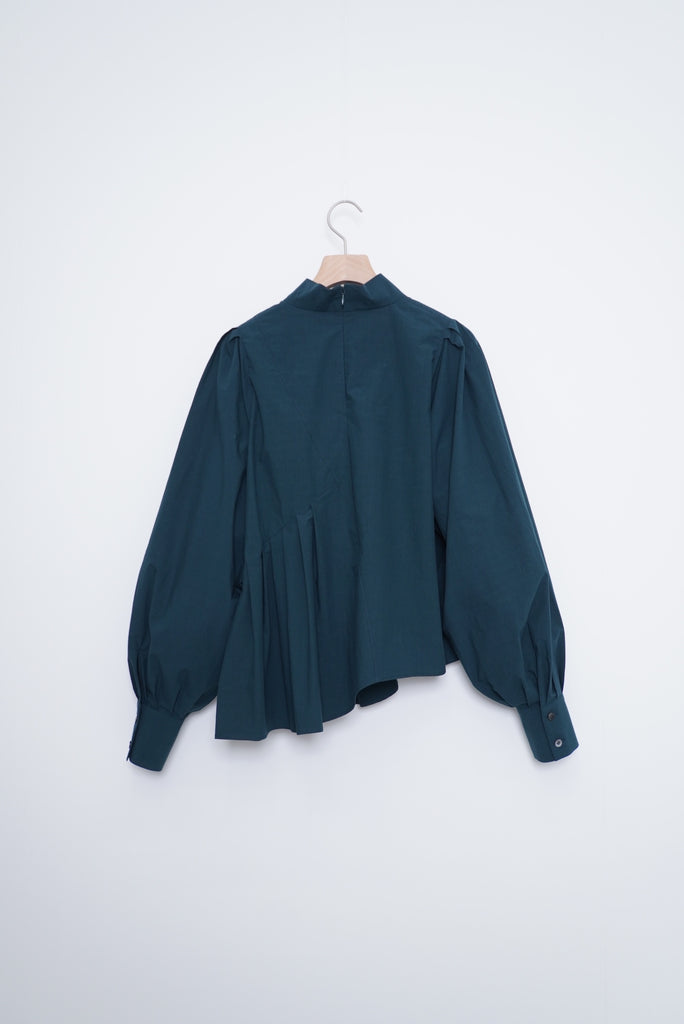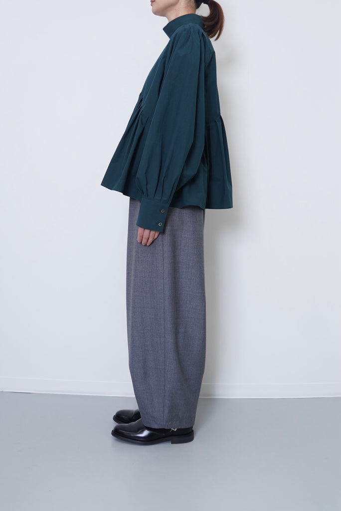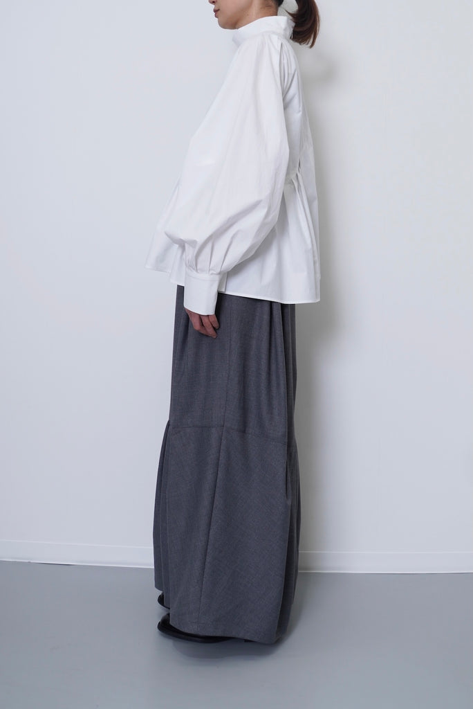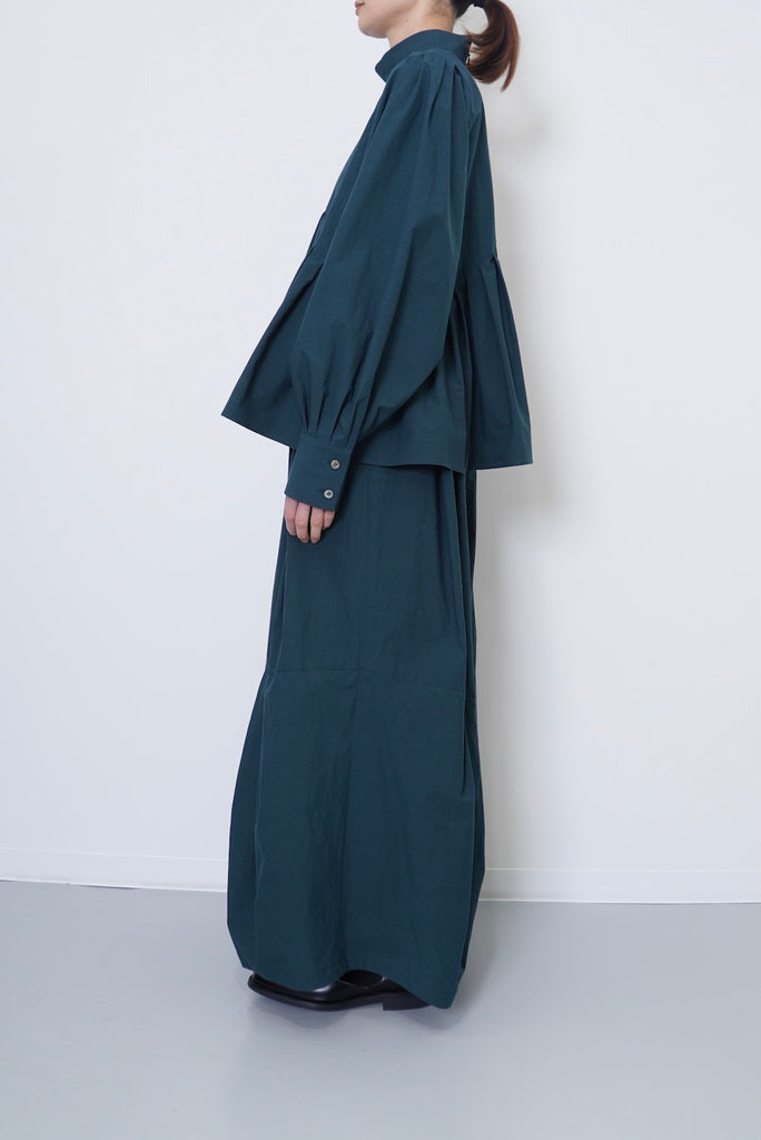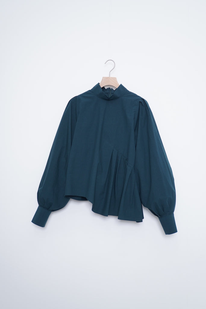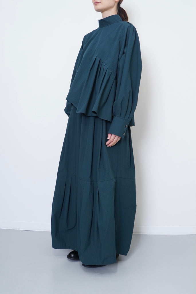 フロントデザインの左肩から裾へ流れる美しい切線はアシンメトリーなデザインになっております。左身頃のウエストのタックは裾に向かってAラインになっており、体型を美しくカバーします。背面にはコンシールファスナーを使用し、すっきりとした後ろ開きです。また、袖口には共生地のくるみボタンを使用しております。身体と衣服の間に程よい空間を持たせたデザインフィロソフィーを反映し、スタイルと快適さのバランスを追求した一着です。