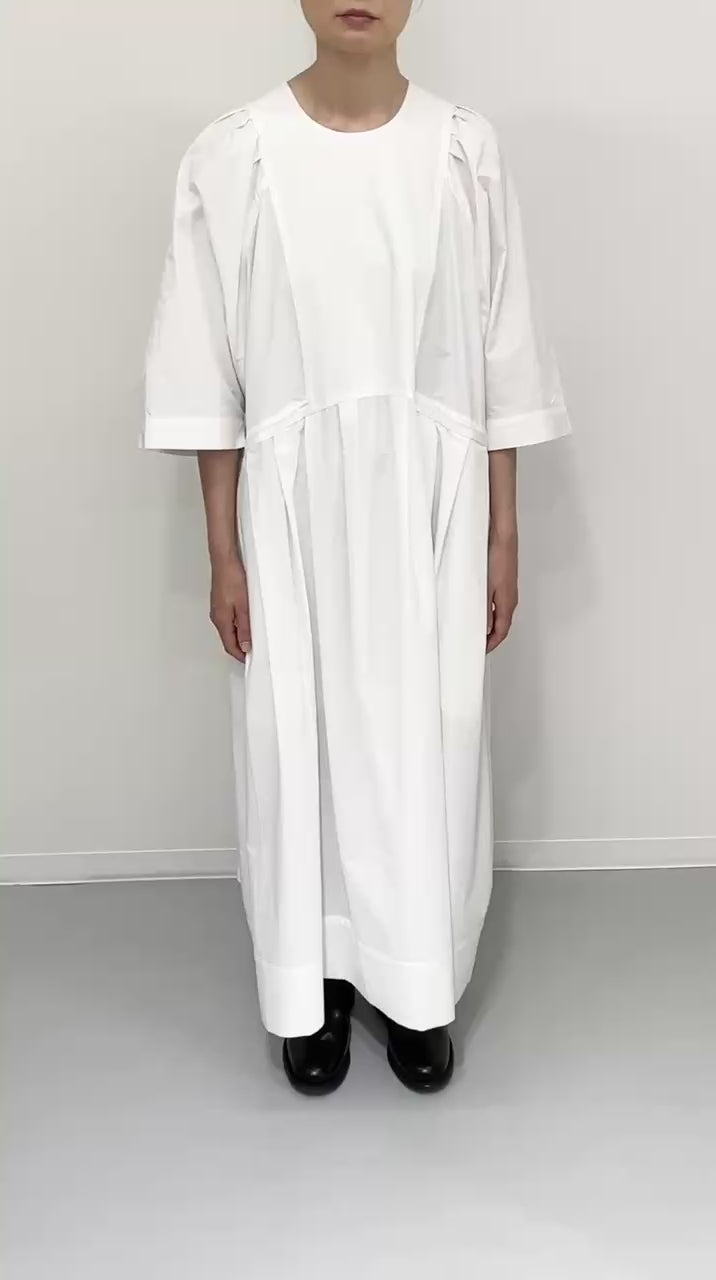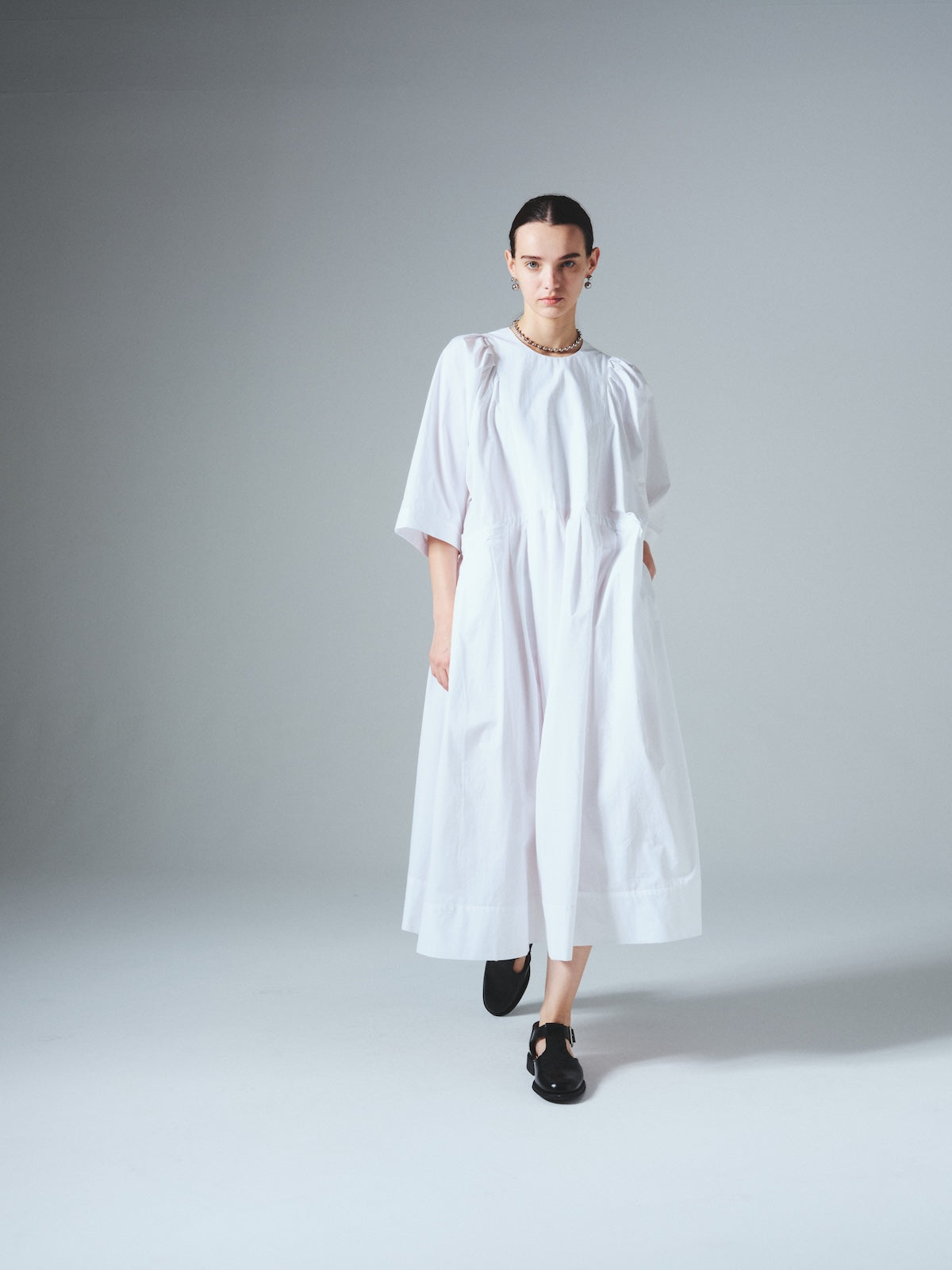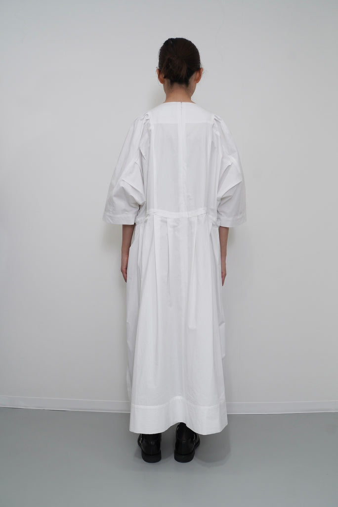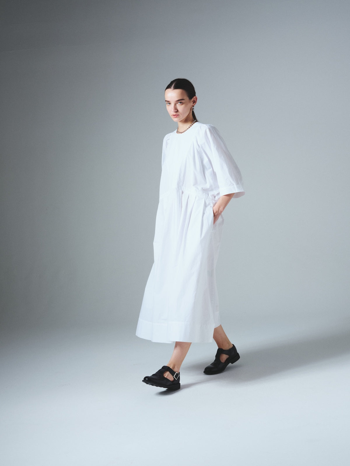 スカートのシルエットはバルーンタイプのラインになっており、体型を美しくカバーします。背面にはコンシールファスナーを使用し、すっきりとした後ろ開きです。デザインにタックを多くデザインし、ボリュームのある独特な丸みのあるシルエットを作り出しています。ウエストにはゴムとサイズ調整用のドローコードが付いているため、快適な着心地を実現しています。