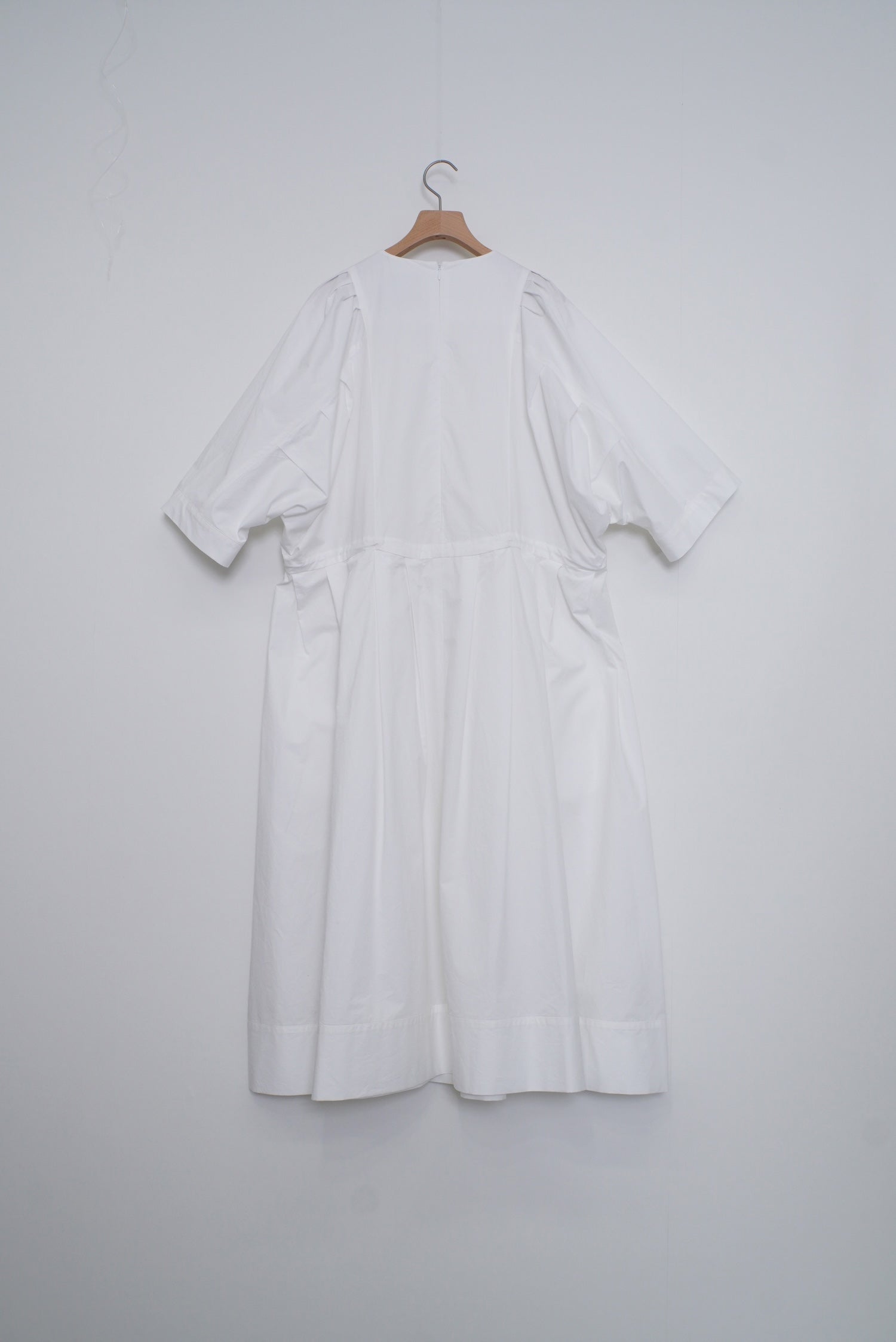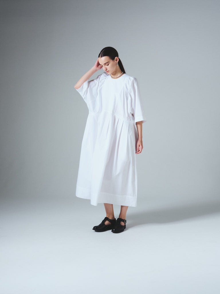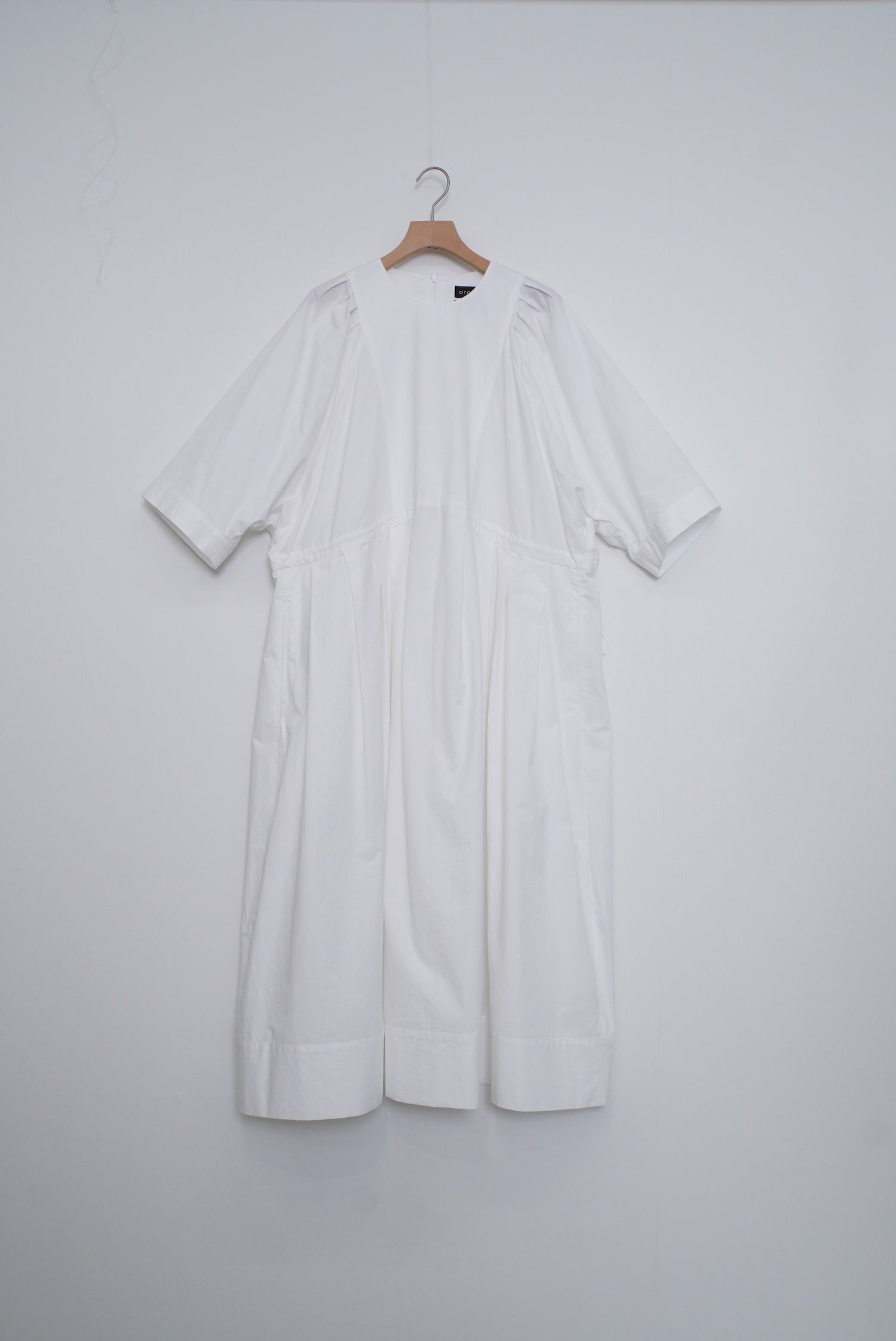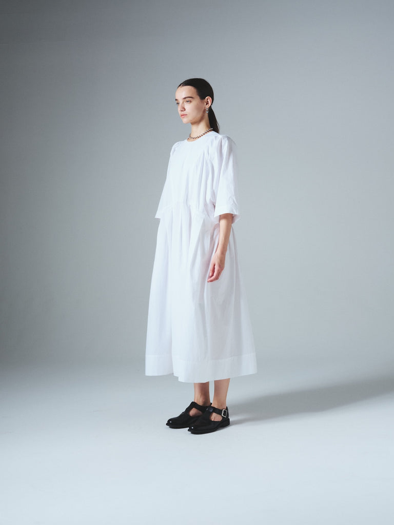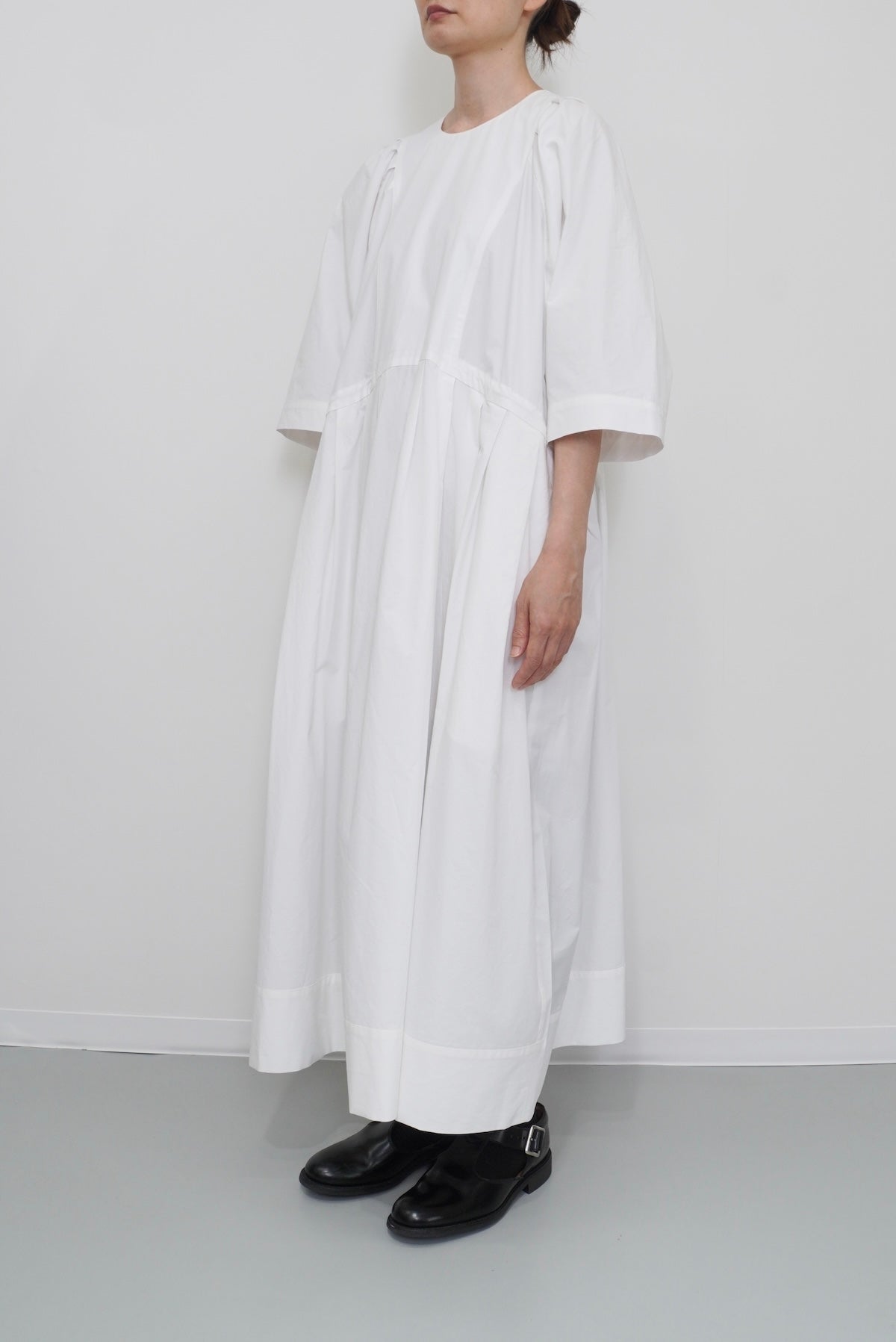 スカートのシルエットはバルーンタイプのラインになっており、体型を美しくカバーします。背面にはコンシールファスナーを使用し、すっきりとした後ろ開きです。デザインにタックを多くデザインし、ボリュームのある独特な丸みのあるシルエットを作り出しています。ウエストにはゴムとサイズ調整用のドローコードが付いているため、快適な着心地を実現しています。