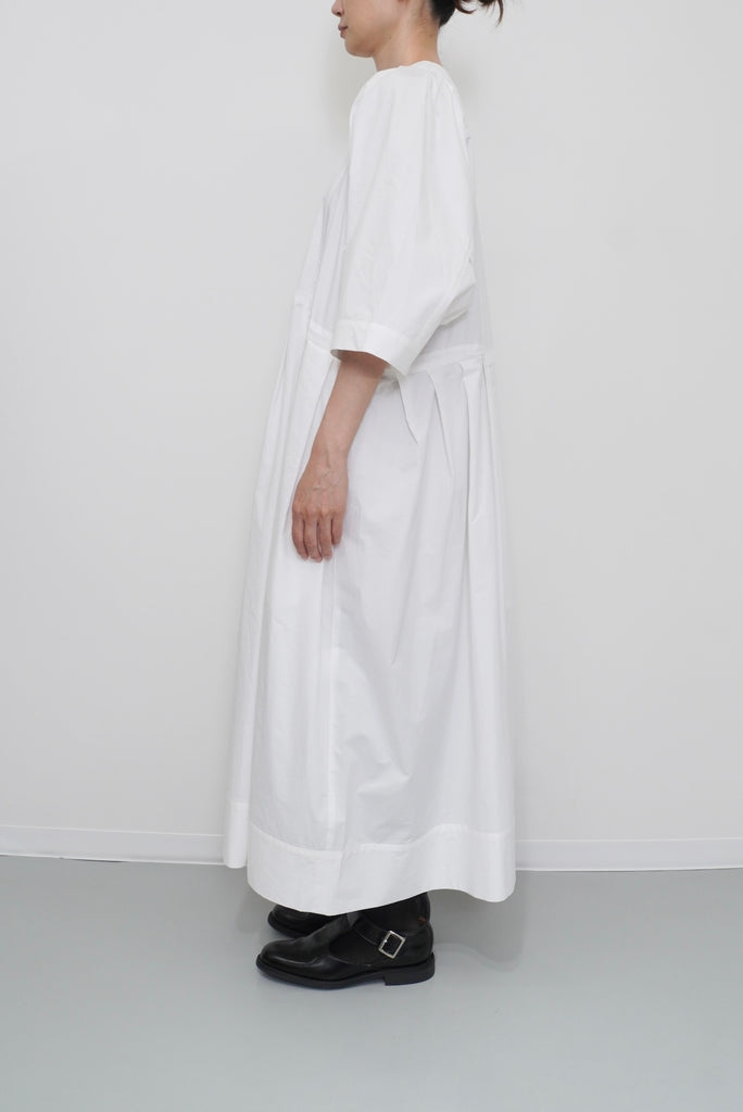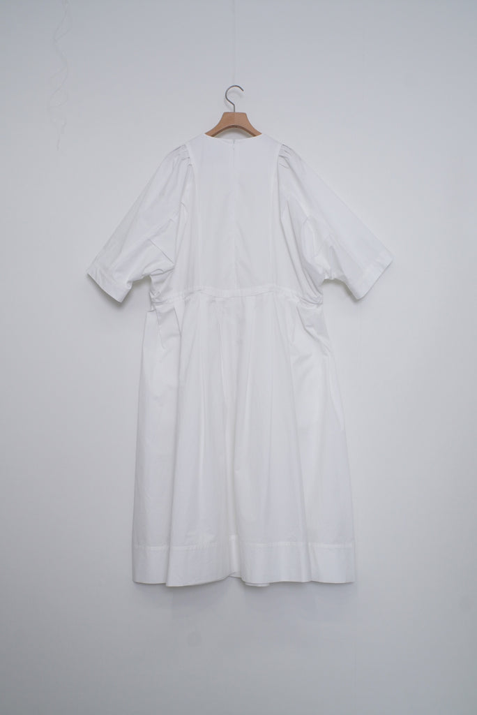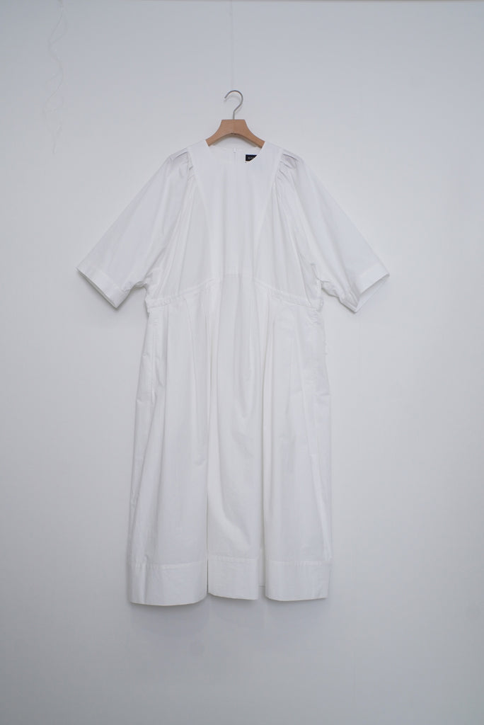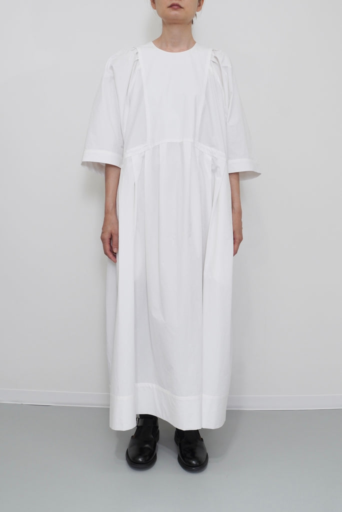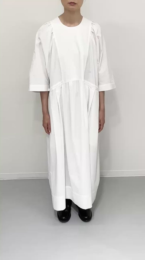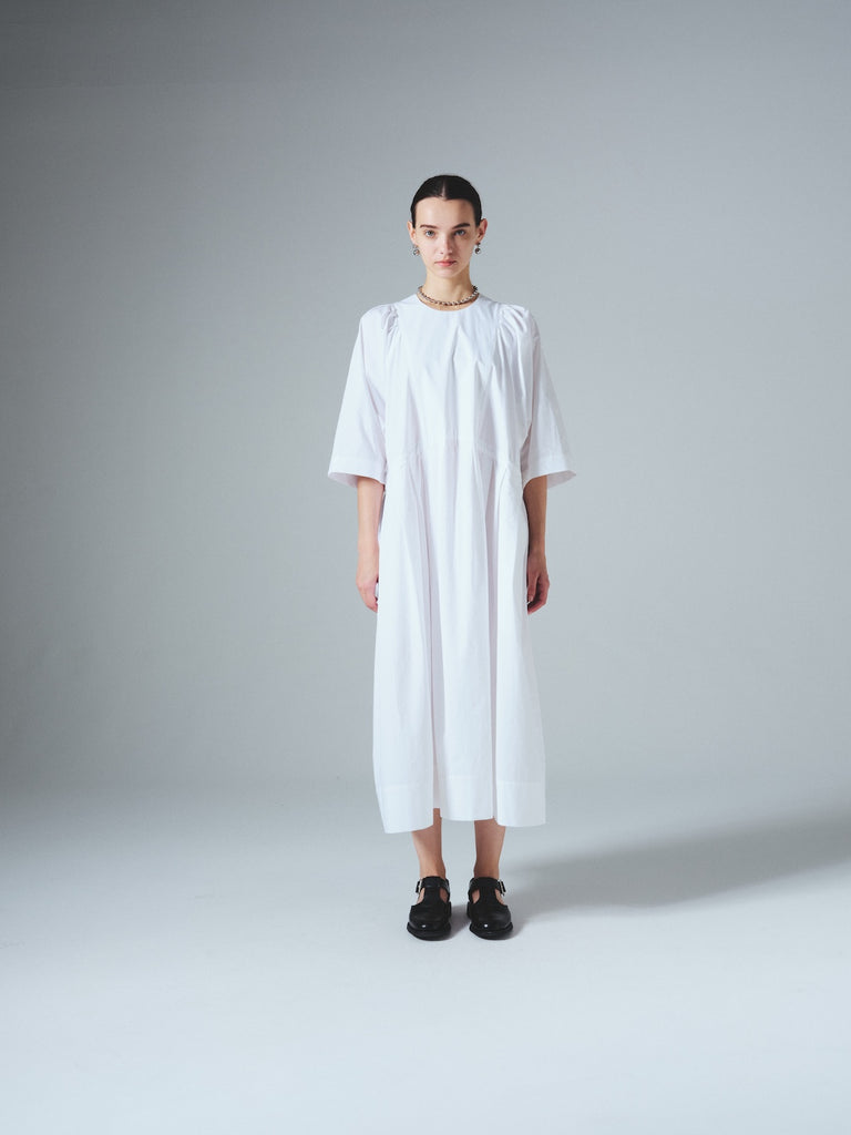 スカートのシルエットはバルーンタイプのラインになっており、体型を美しくカバーします。背面にはコンシールファスナーを使用し、すっきりとした後ろ開きです。デザインにタックを多くデザインし、ボリュームのある独特な丸みのあるシルエットを作り出しています。ウエストにはゴムとサイズ調整用のドローコードが付いているため、快適な着心地を実現しています。