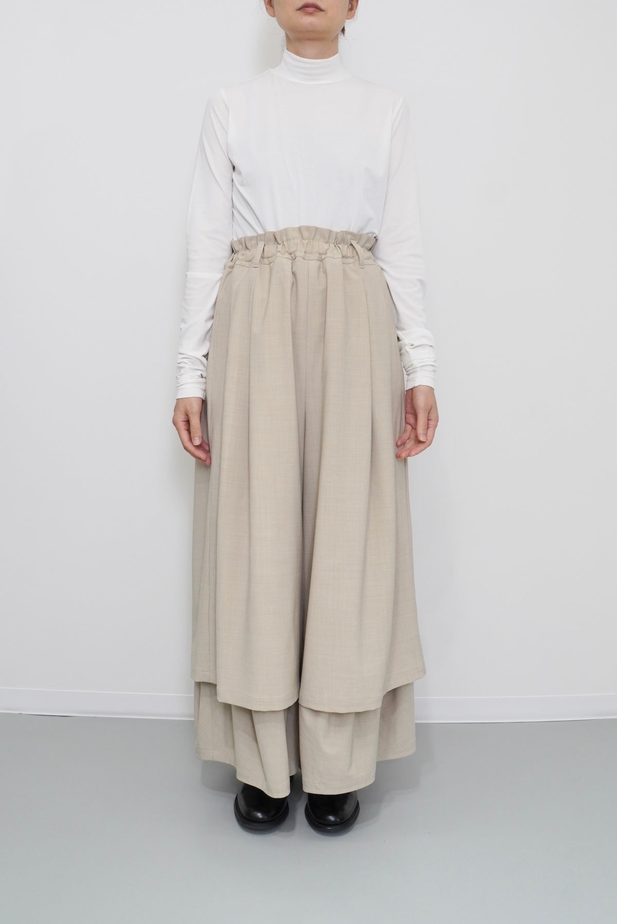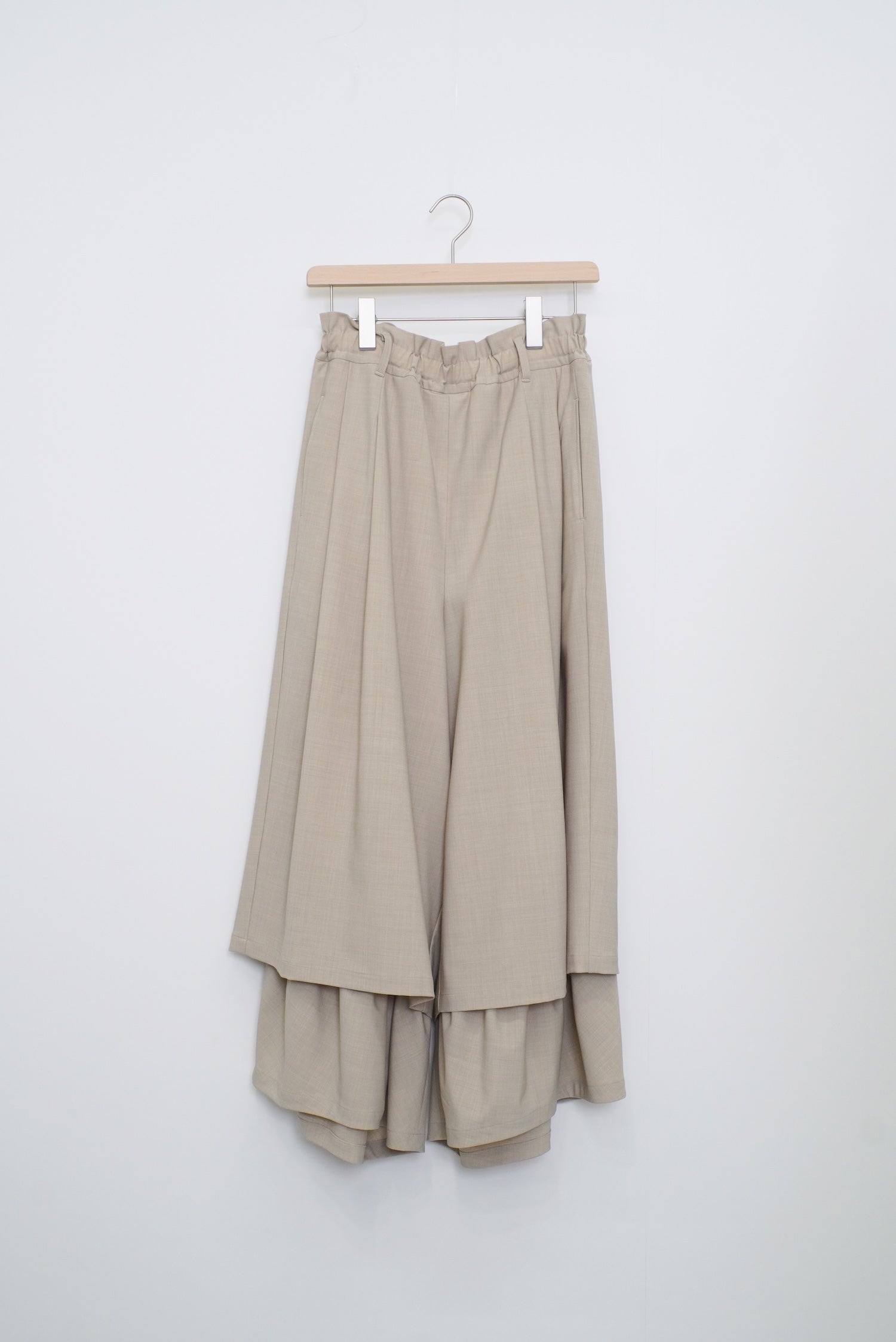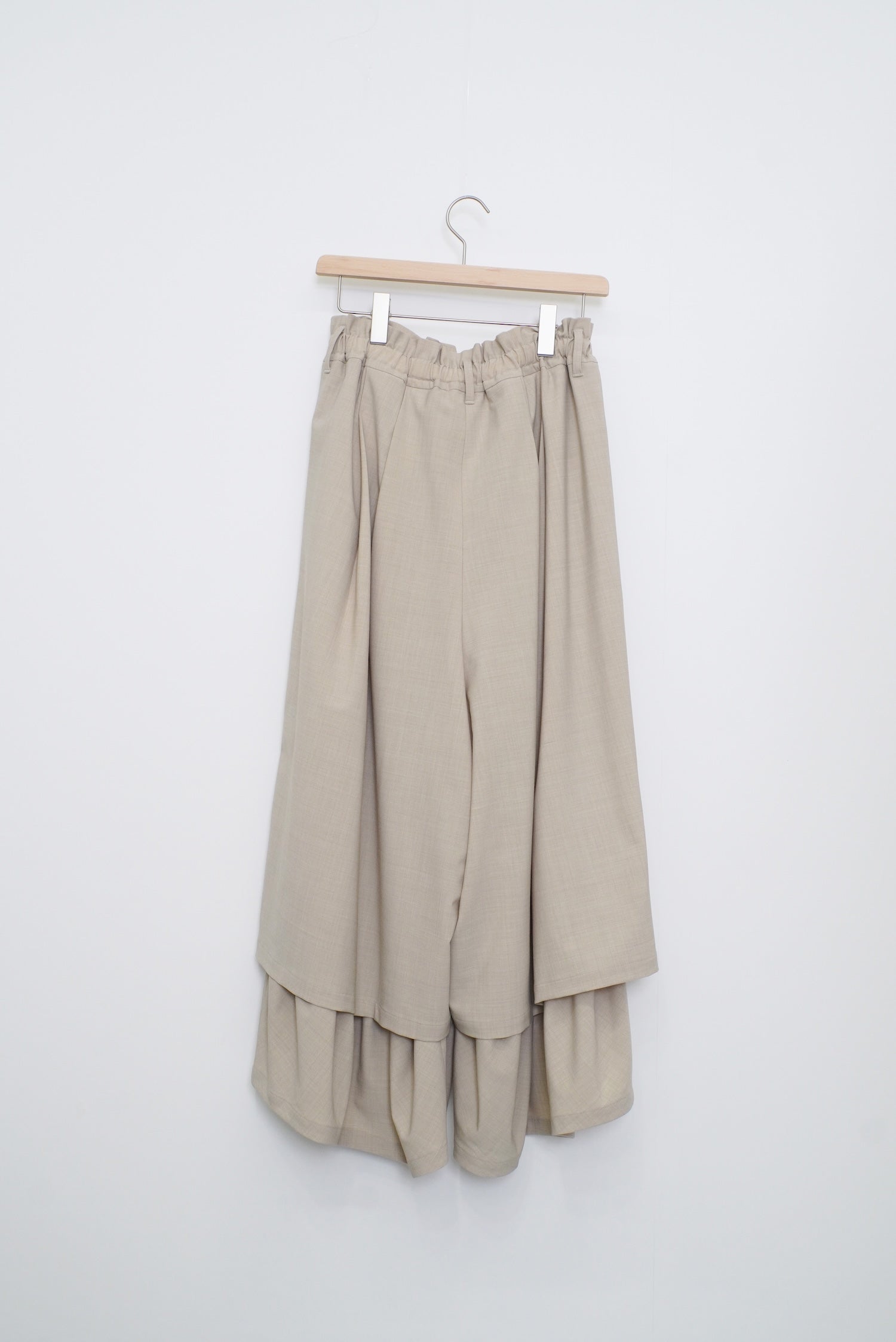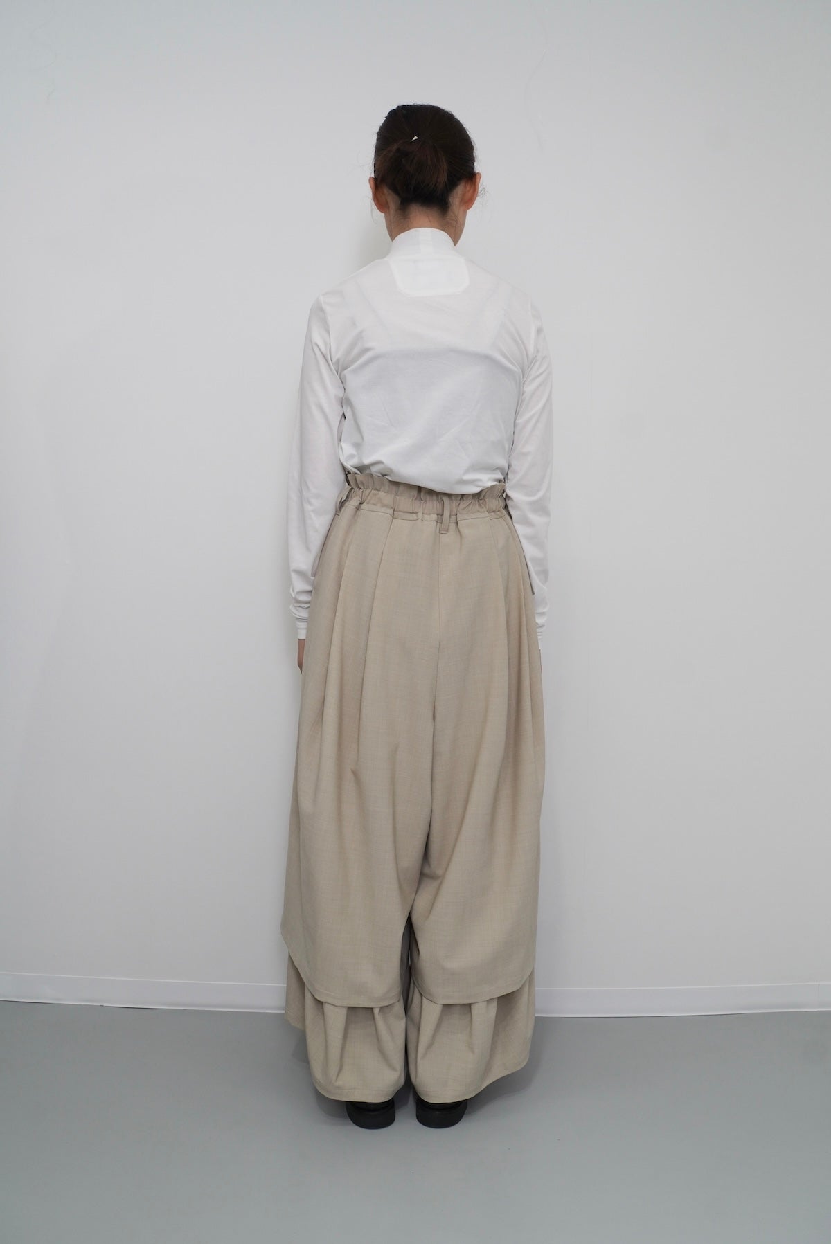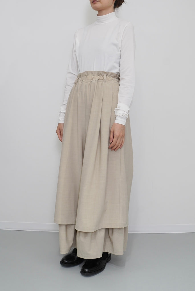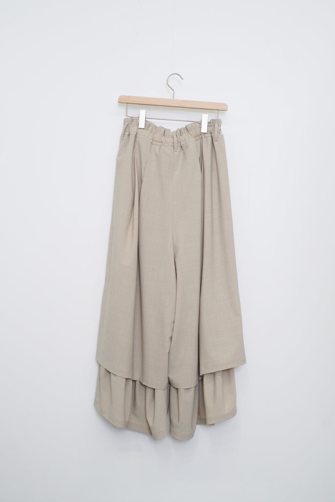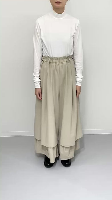 ダブルレーヤードシルエットの特徴は、独特な動きのある2重構造のワイドシルエットです。内側の裾にギャザーでボリュームを取り入れギャップを出してます。そして独特な丸みのあるシルエットを作り出しています。ウエストにはゴムとサイズ調整用のドローコードが付いているため、快適な着心地を実現しています。
