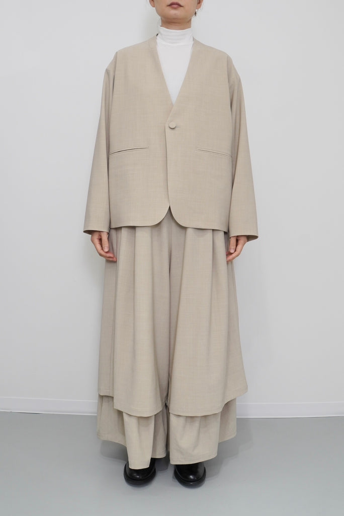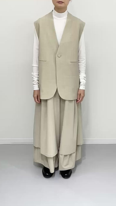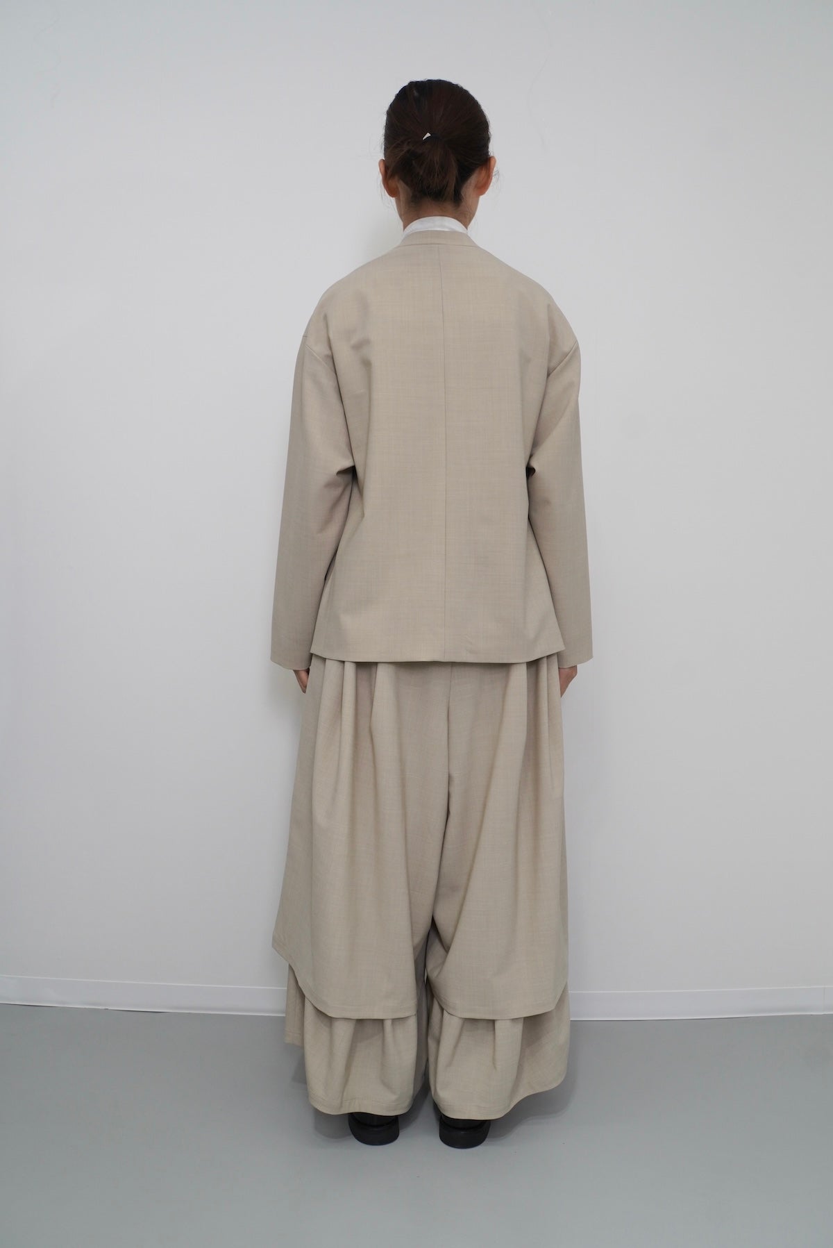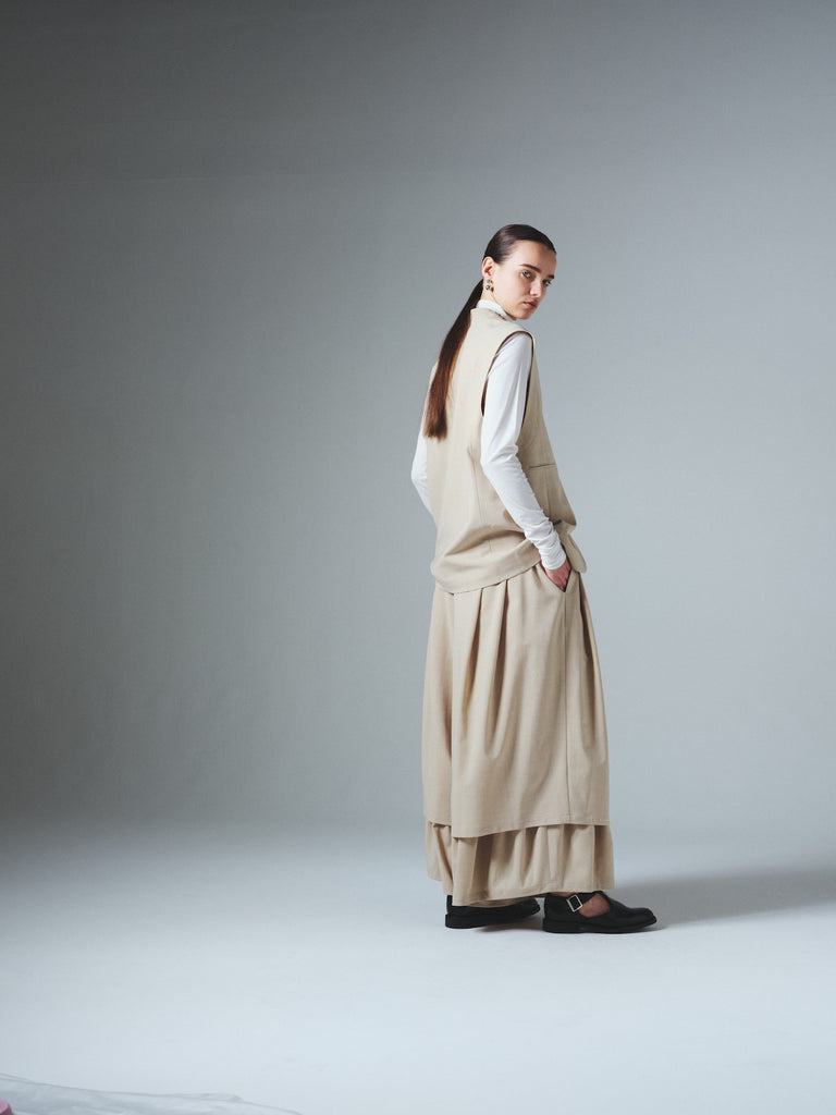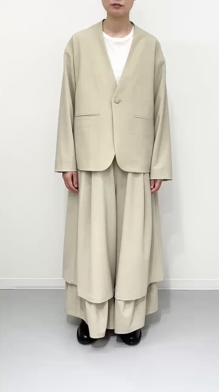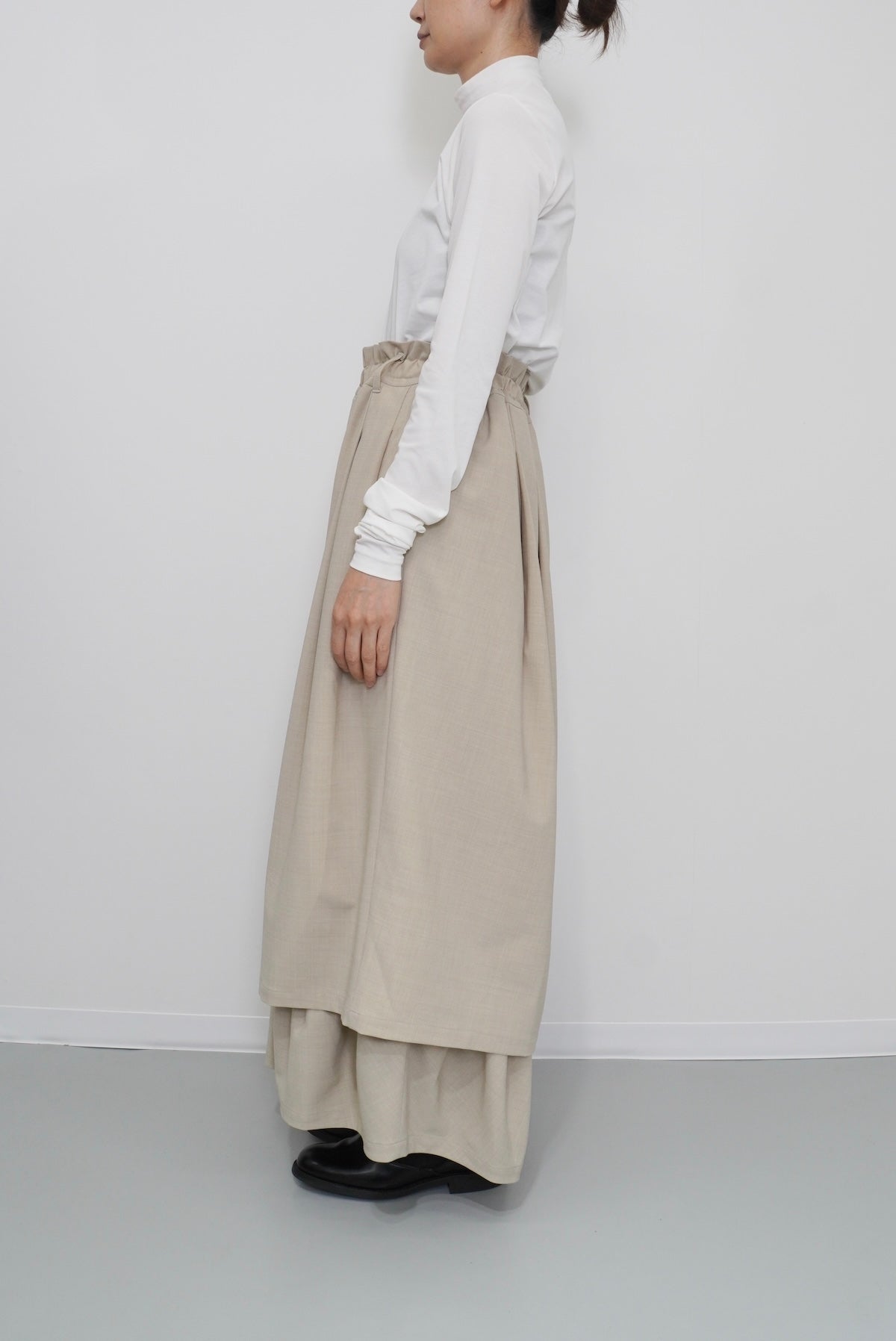 ダブルレーヤードシルエットの特徴は、独特な動きのある2重構造のワイドシルエットです。内側の裾にギャザーでボリュームを取り入れギャップを出してます。そして独特な丸みのあるシルエットを作り出しています。ウエストにはゴムとサイズ調整用のドローコードが付いているため、快適な着心地を実現しています。
