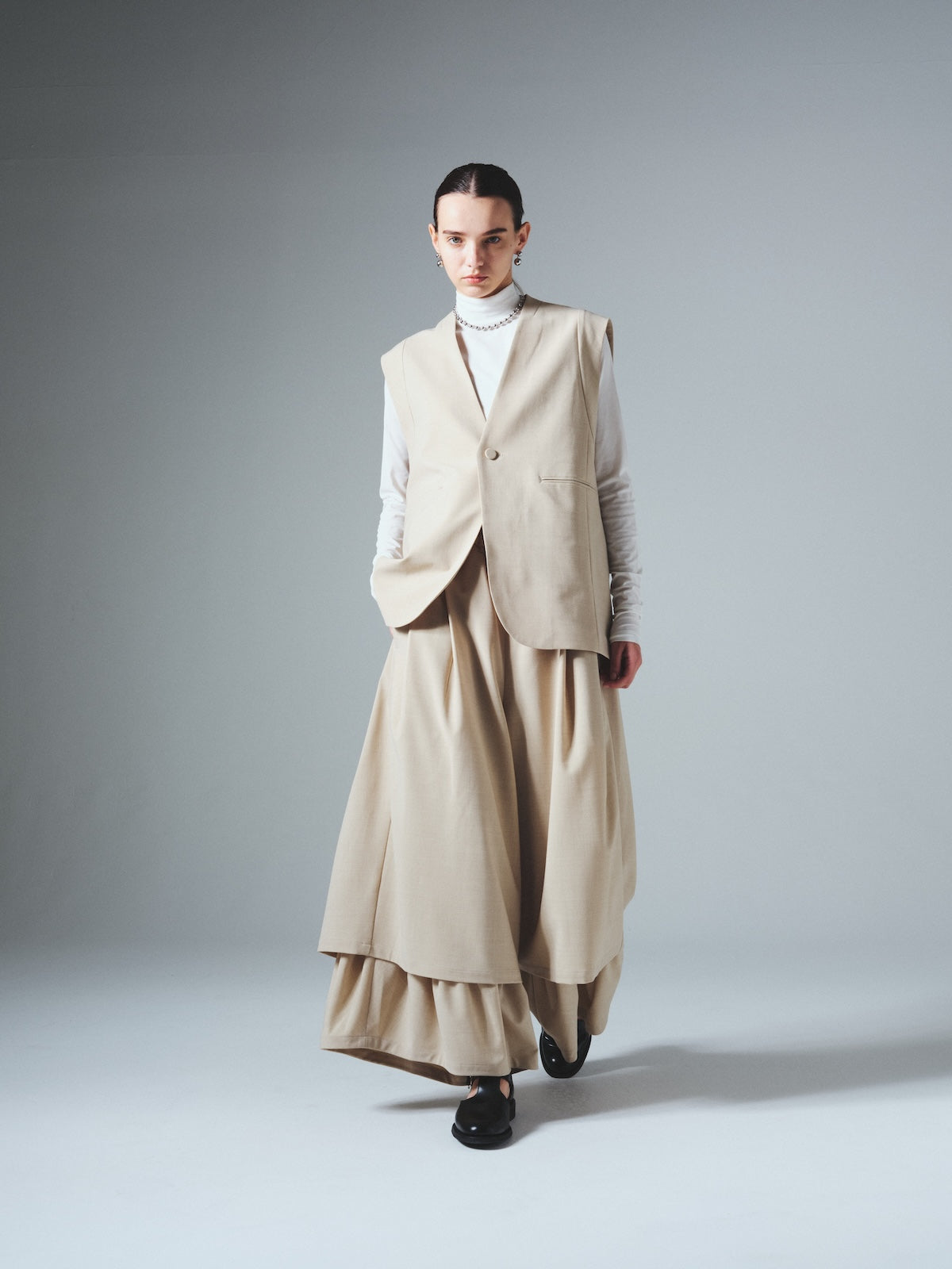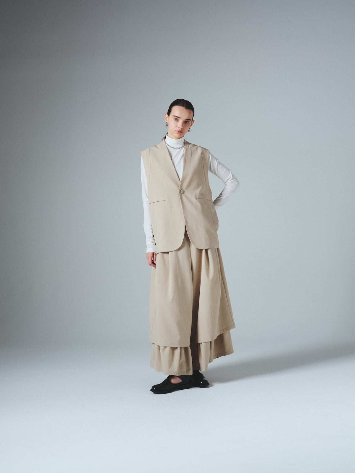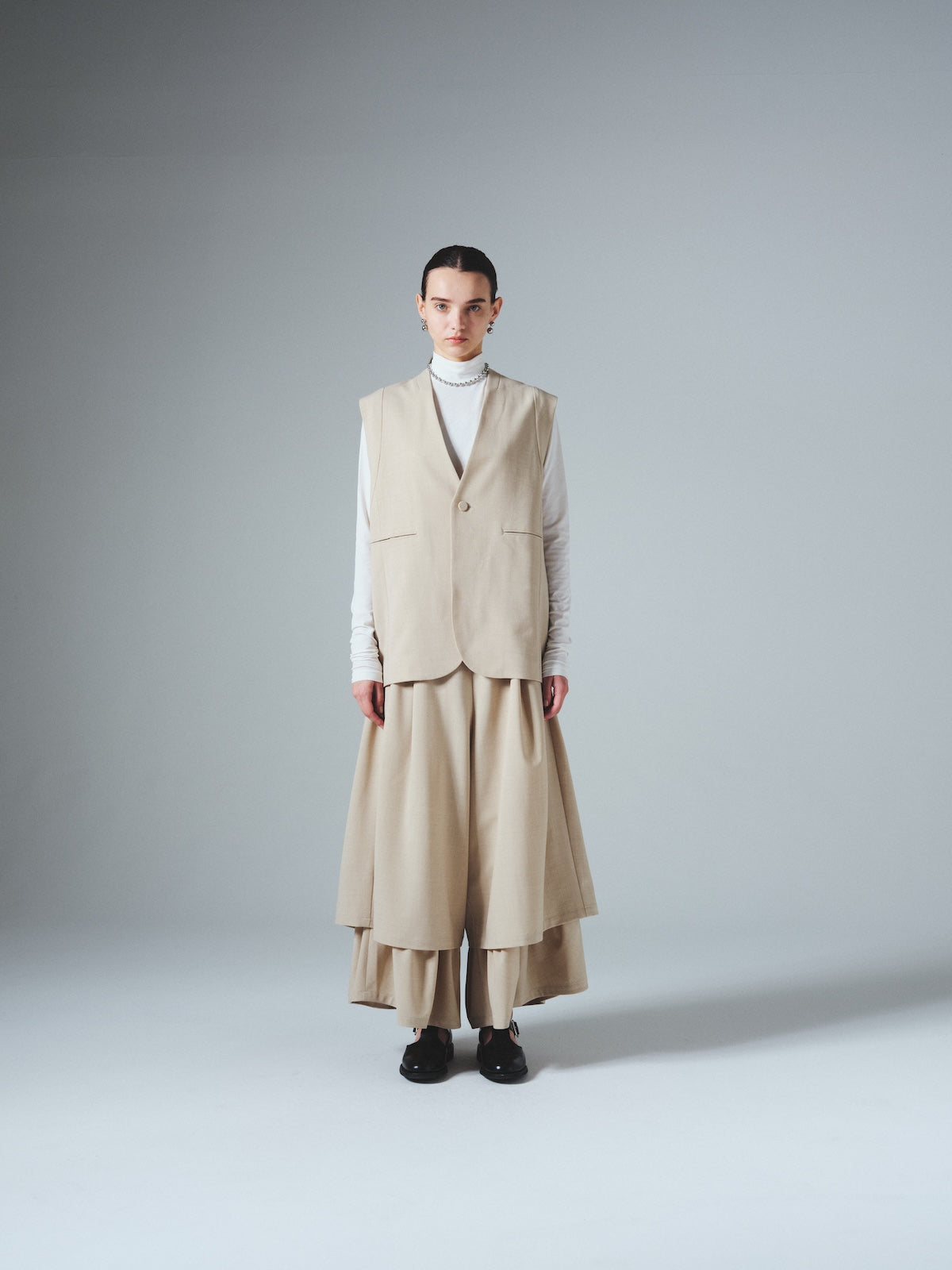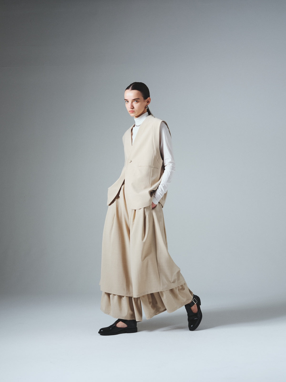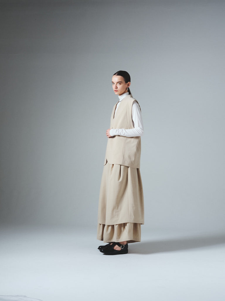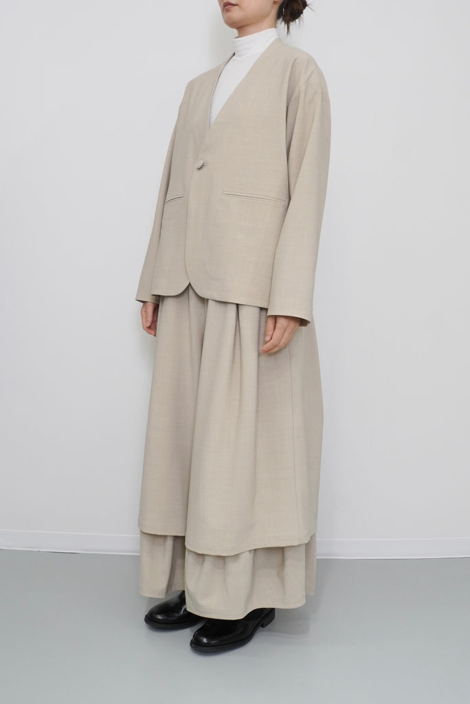ダブルレーヤードシルエットの特徴は、独特な動きのある2重構造のワイドシルエットです。内側の裾にギャザーでボリュームを取り入れギャップを出してます。そして独特な丸みのあるシルエットを作り出しています。ウエストにはゴムとサイズ調整用のドローコードが付いているため、快適な着心地を実現しています。
