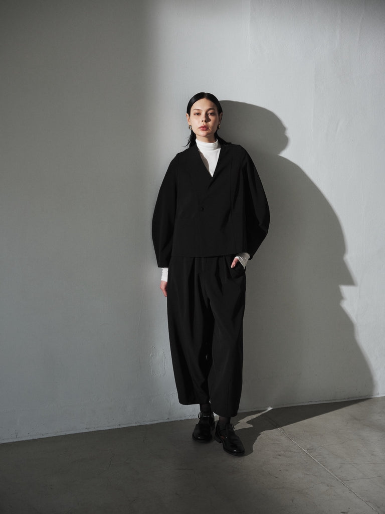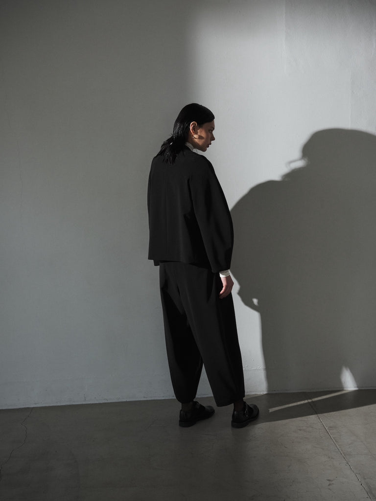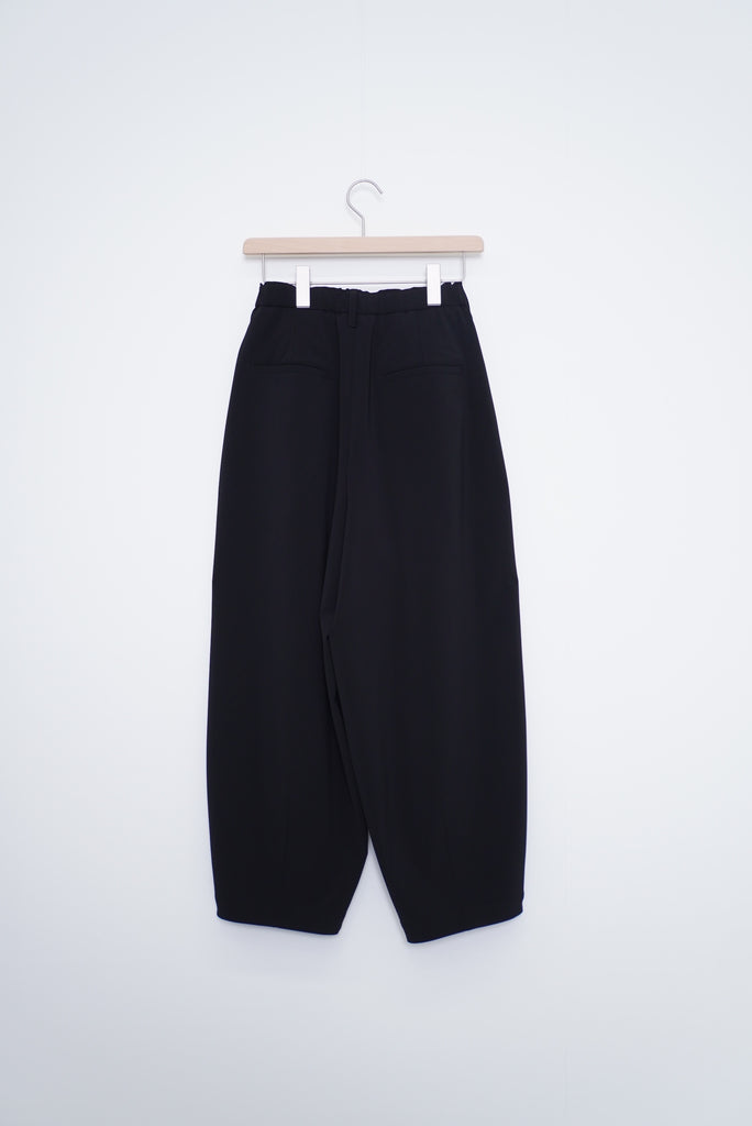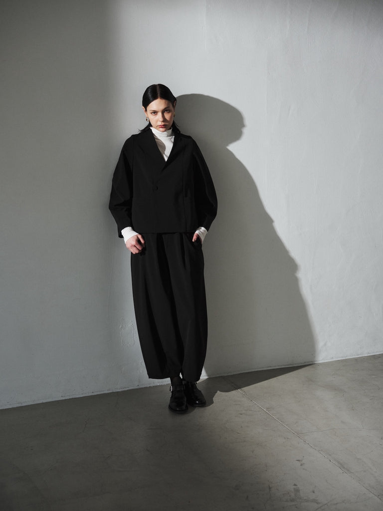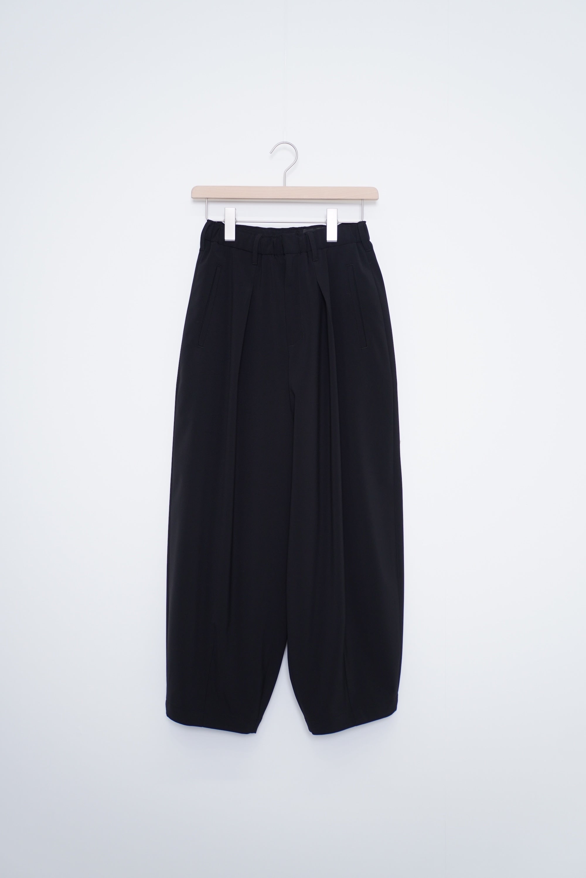 陶器のような丸いイメージのポッテリーシルエットの特徴は、ワイドなシルエットを、裾のデザインダーツで調整し、独特な丸みのあるシルエットを作り出しています。前開き部分にはデザイン性の高いメタルフックを使用し、ウエストにはゴムとサイズ調整用のドローコードが付いているため、快適な着心地を実現しています。