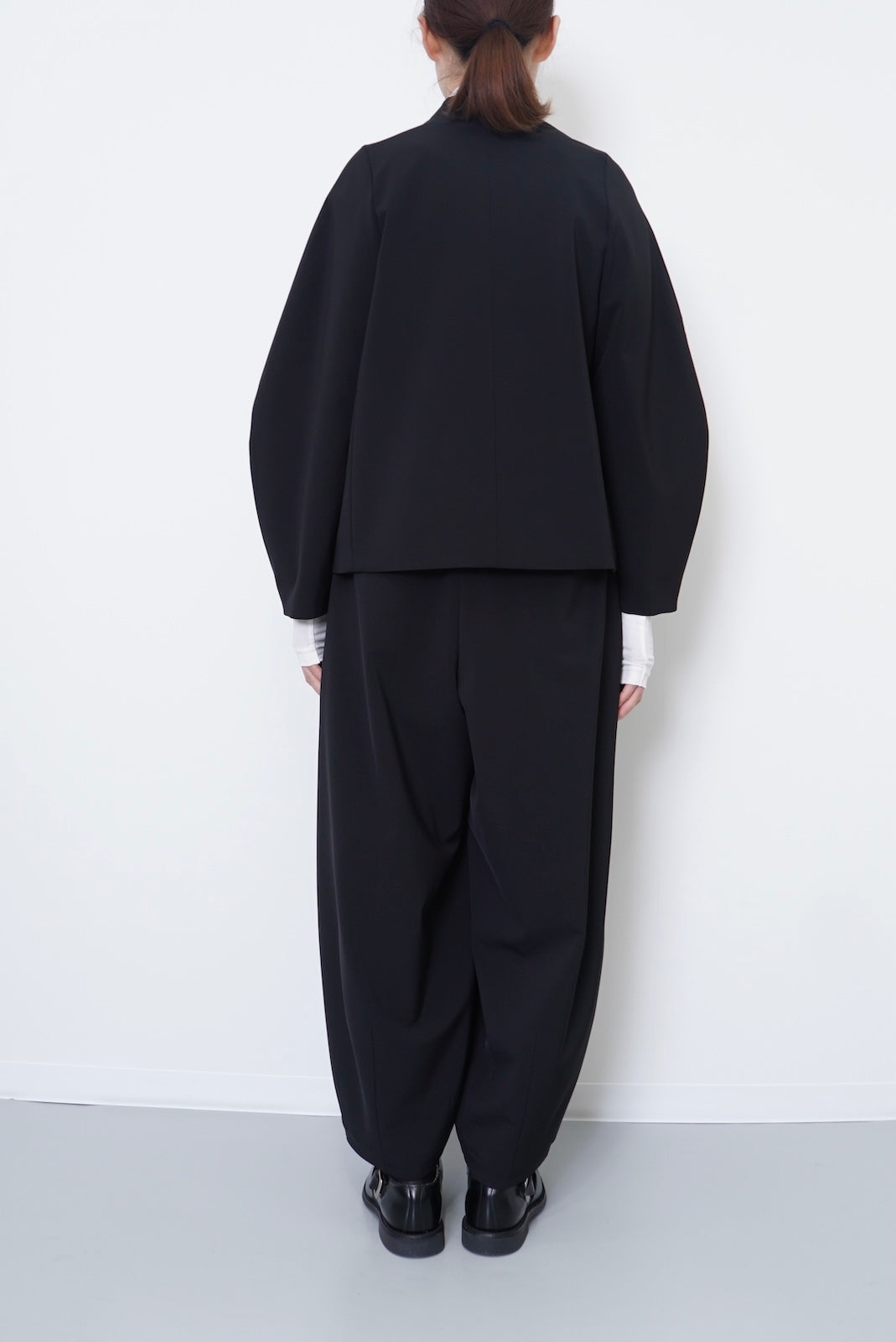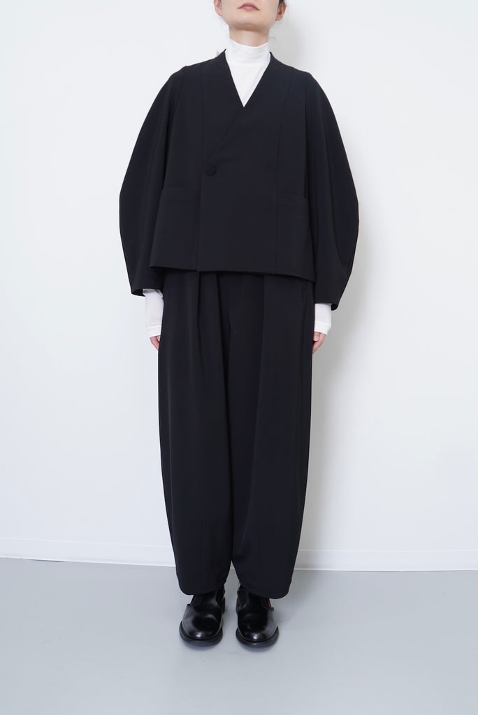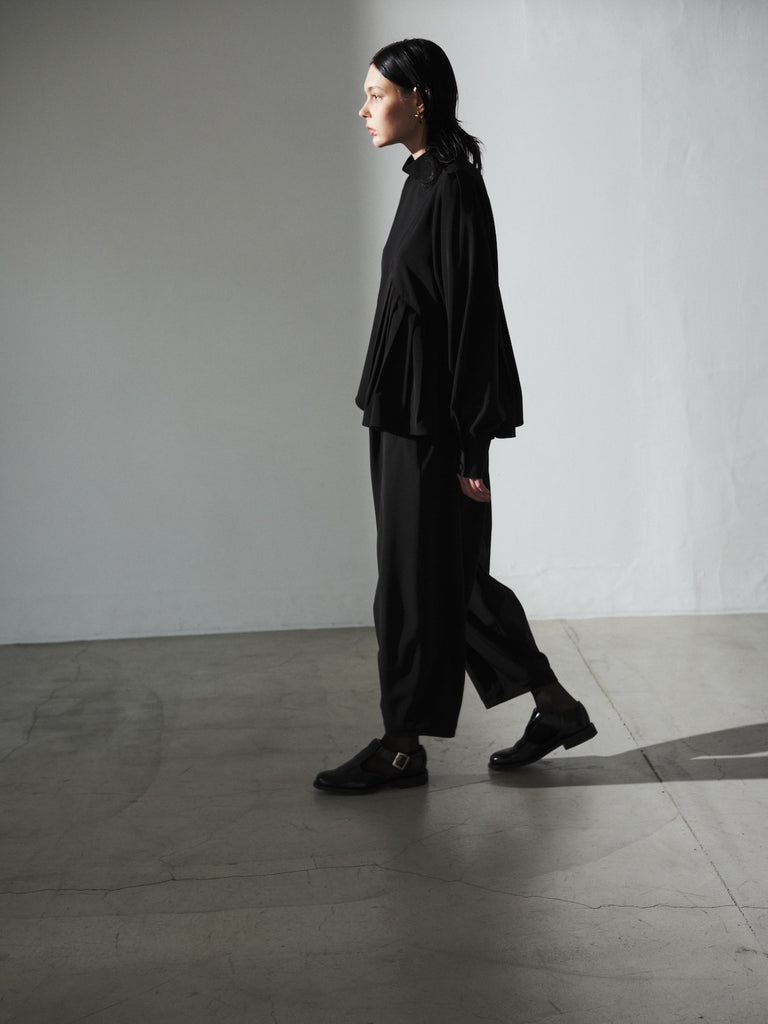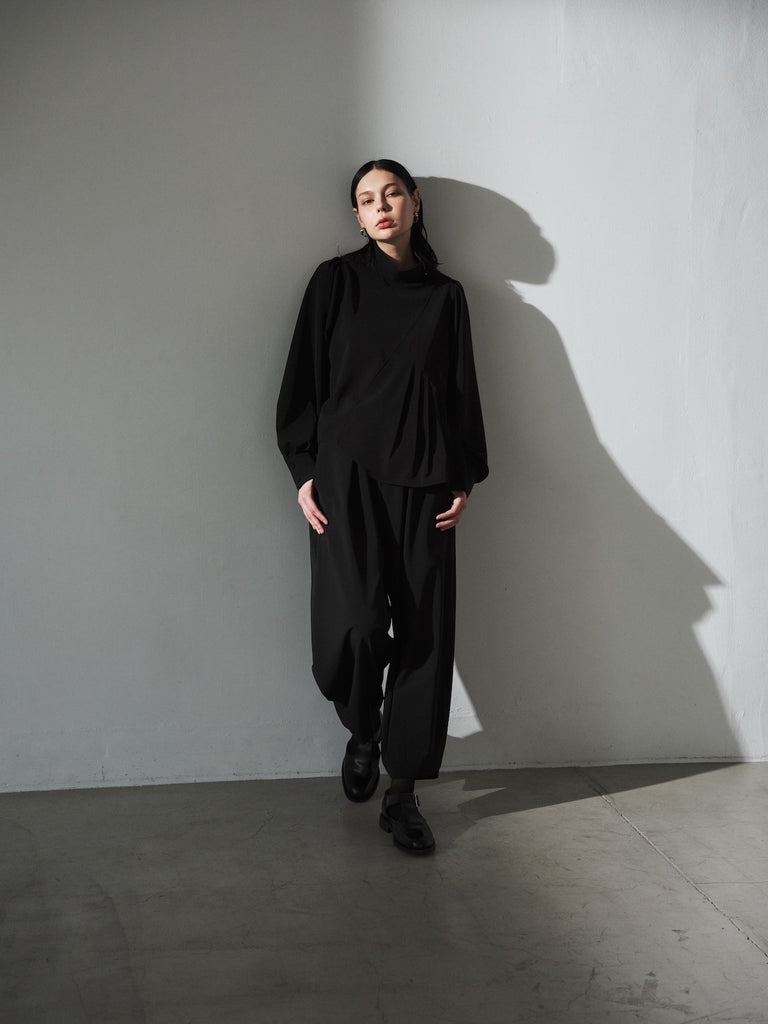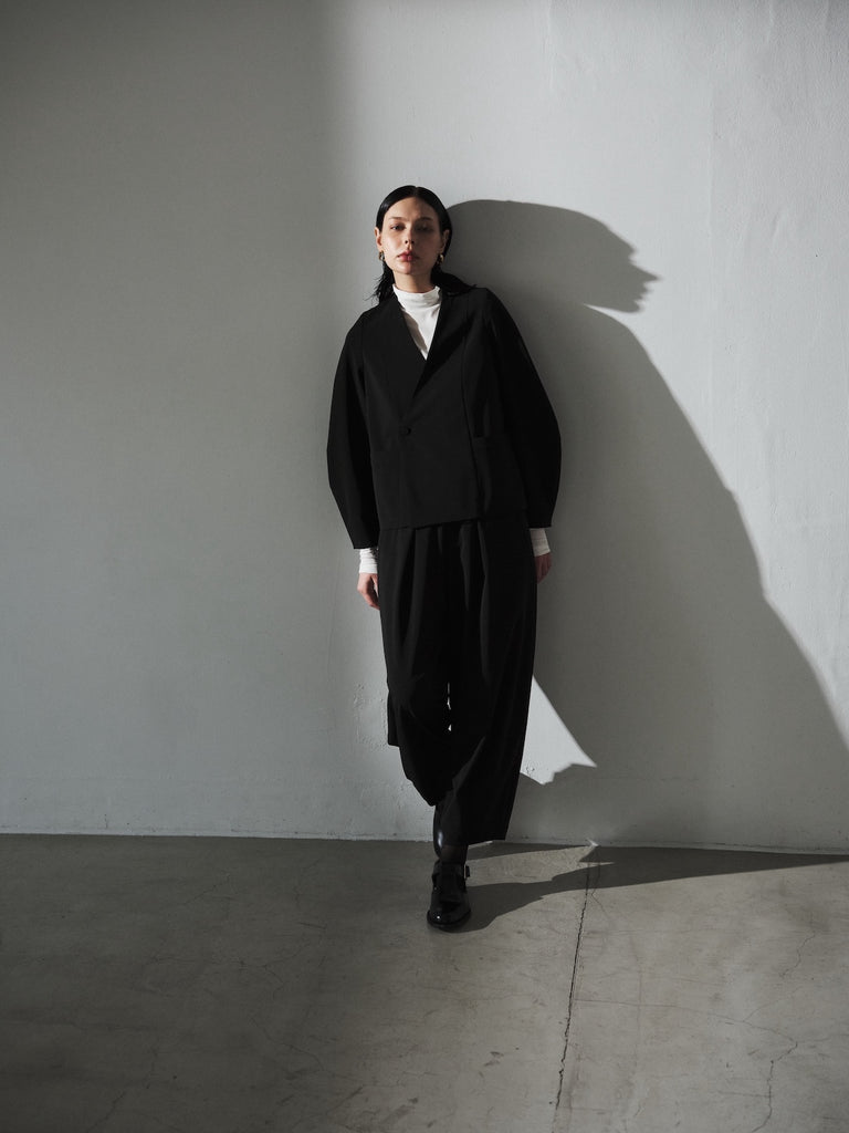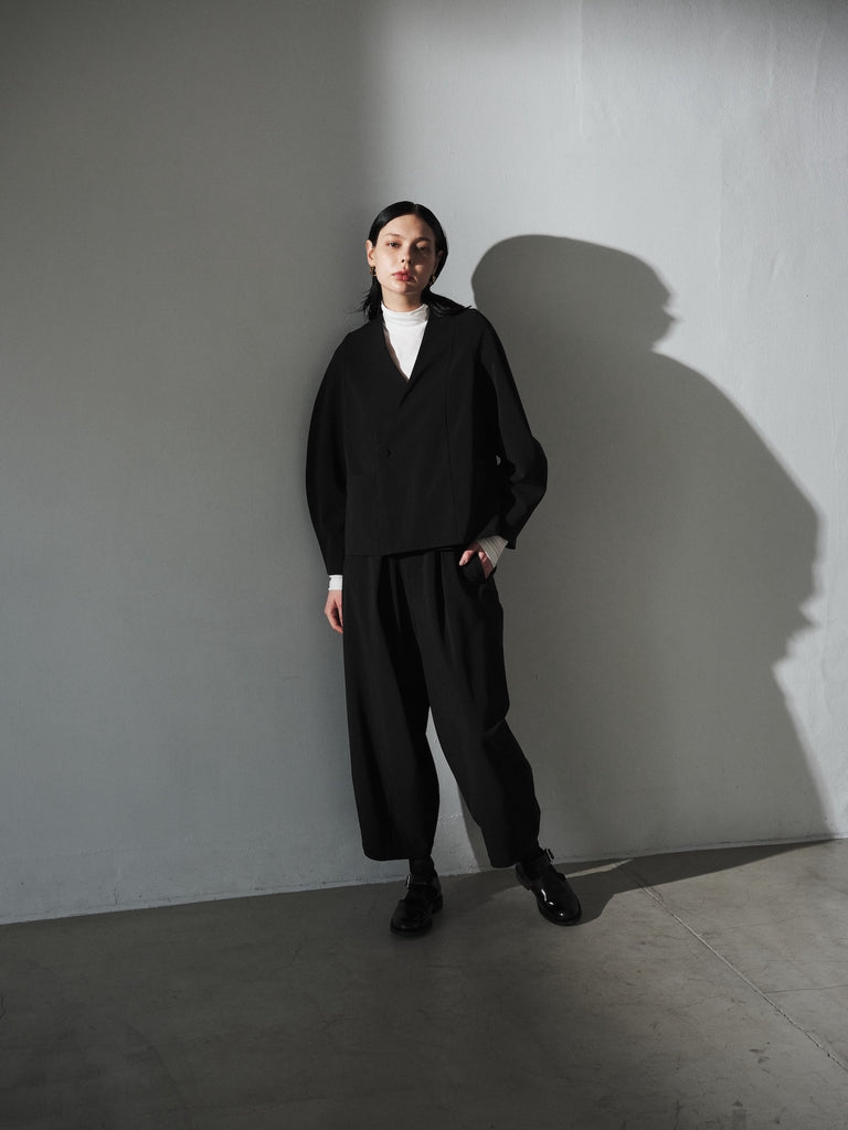 陶器のような丸いイメージのポッテリーシルエットの特徴は、ワイドなシルエットを、裾のデザインダーツで調整し、独特な丸みのあるシルエットを作り出しています。前開き部分にはデザイン性の高いメタルフックを使用し、ウエストにはゴムとサイズ調整用のドローコードが付いているため、快適な着心地を実現しています。
