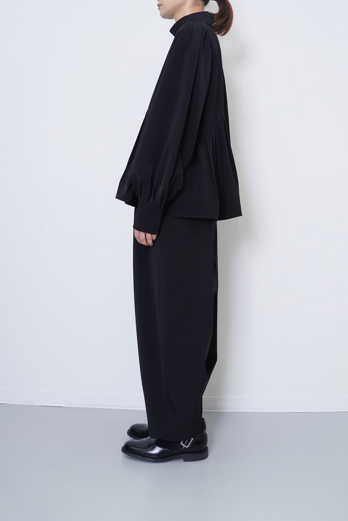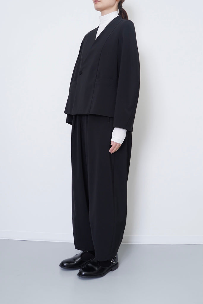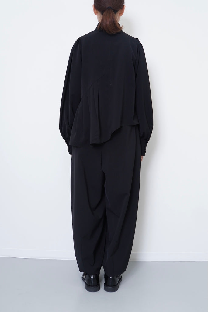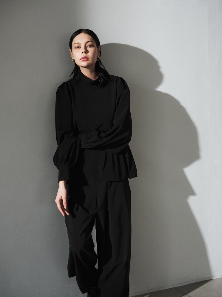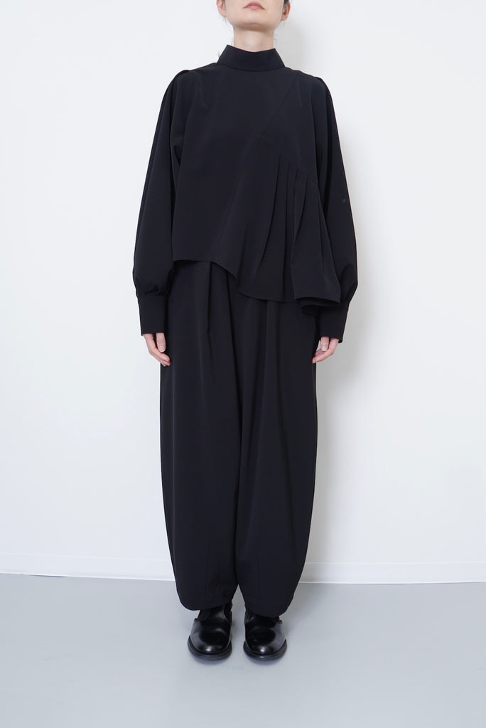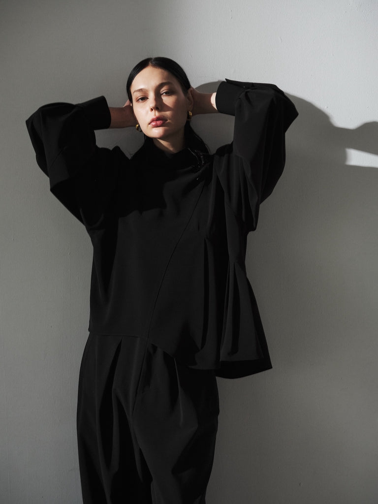 陶器のような丸いイメージのポッテリーシルエットの特徴は、ワイドなシルエットを、裾のデザインダーツで調整し、独特な丸みのあるシルエットを作り出しています。前開き部分にはデザイン性の高いメタルフックを使用し、ウエストにはゴムとサイズ調整用のドローコードが付いているため、快適な着心地を実現しています。